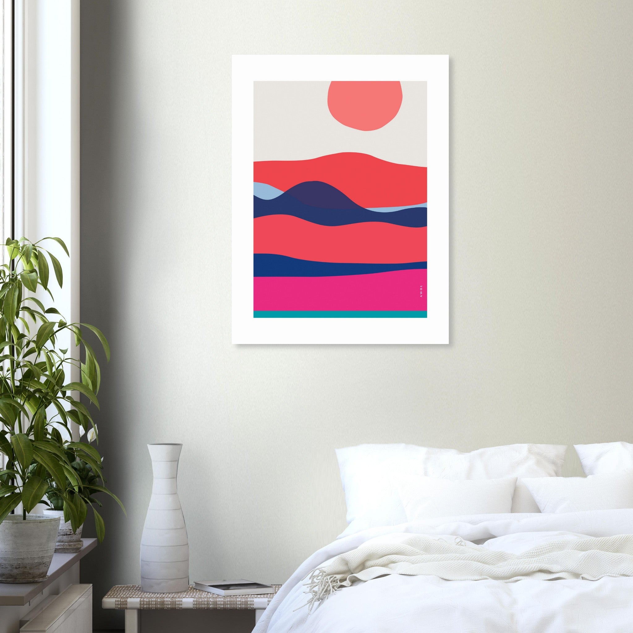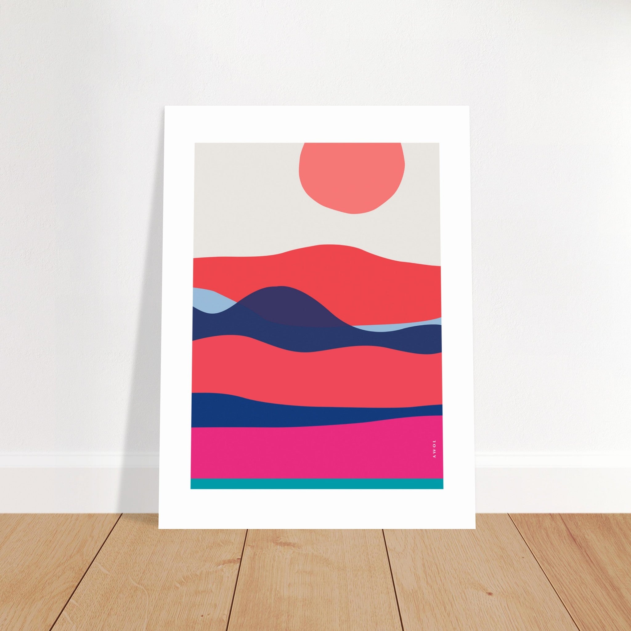 This abstract art print with ocean waves at sunrise is a colourful wall art print conveying the beauty of morning sunrises and evening sunsets witnessed while at sea, sailing in the midst of a vast expanse of waves, endless horizons and oceans. This graphic wall poster is a minimalist wall art with bright orange, pink, red, dark blue and turquoise tones in a bold and abstract pattern with organic, wavy lines and a coral sun. Inspired by nautical landscapes and travel adventures at sea, this transports you to peaceful moments of dawn over a soothing, wavy sea. This colourful sea art print is a visual celebration of tranquility and natural beauty. The organic design and contemporary art style of this poster captures the essence of the ever-changing waves and the radiant hues that paint the sky during these magical maritime moments. The relaxing modern art aesthetic of this wall decor print makes it a versatile artwork for any home decor or space, bringing the essence of nautical landscapes and sailing into your home.