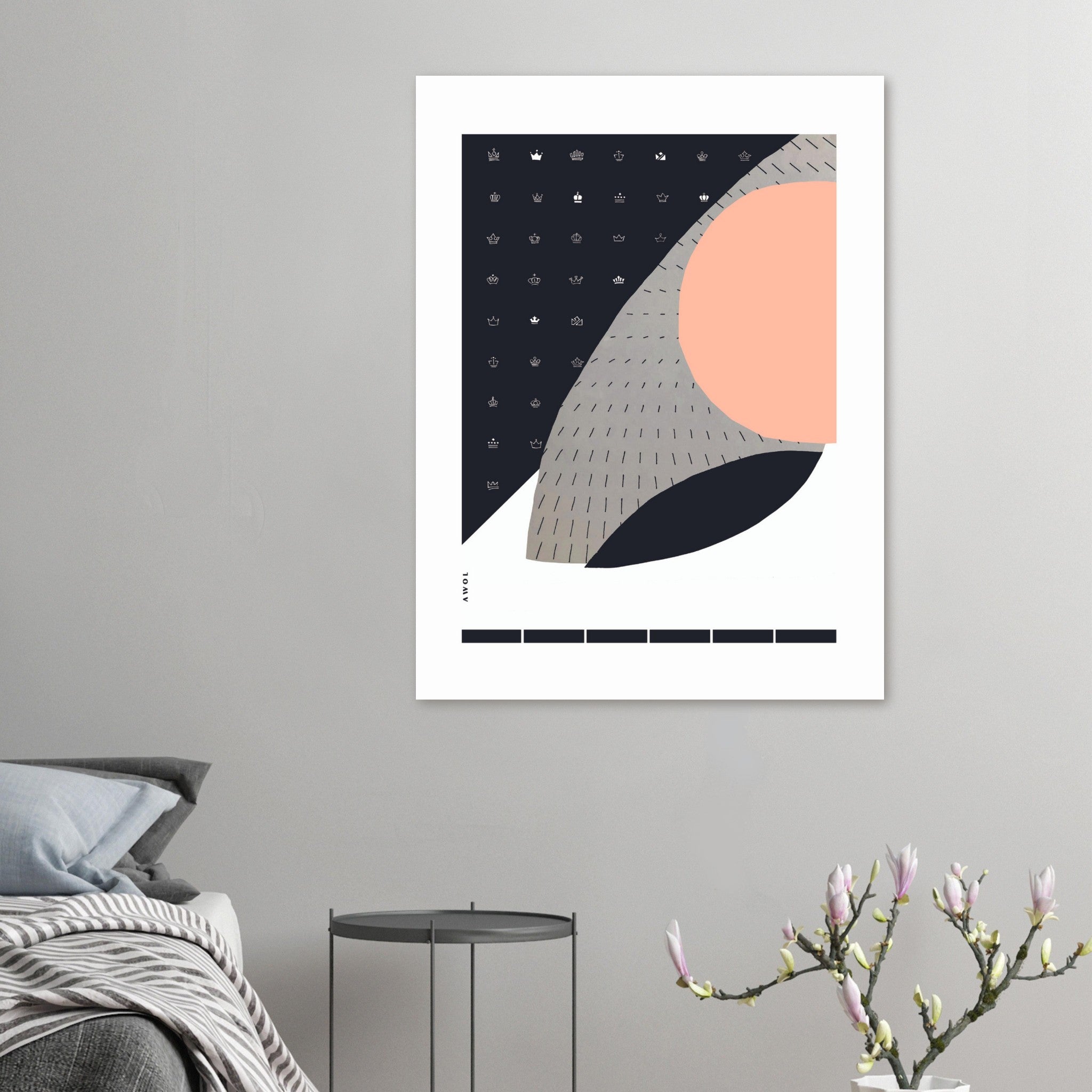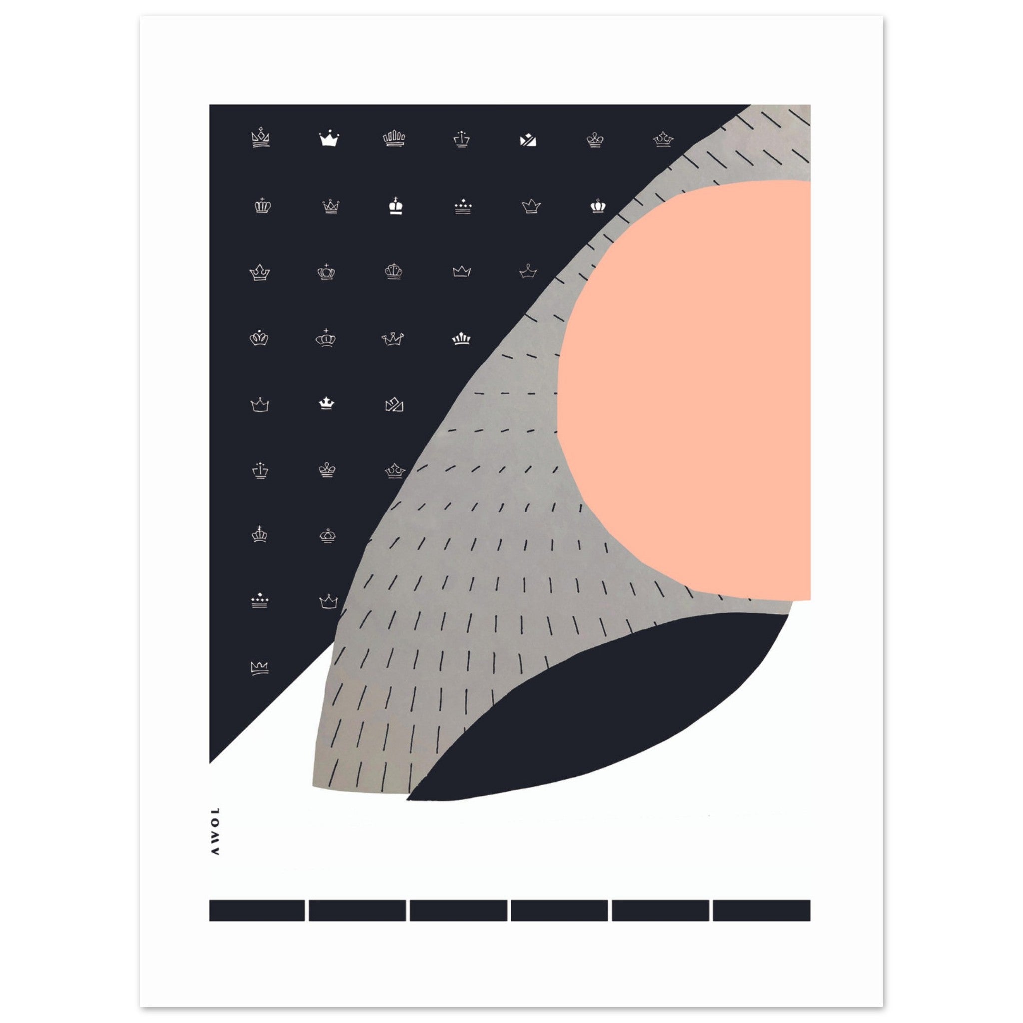 This Scandinavian art print is a minimalist wall art with a graphic line pattern, organic shapes and a contemporary muted colour palette of black, white, warm grey and pastel tones. This black and white abstract art is inspired by Scandinavian design, a minimalist art style and the contemporary yet approachable art, architecture and modern design aesthetic of Copenhagen, Denmark. This art print curated with a neutral colour palette of black, grey, and warm peach tones, encapsulating the essence of Nordic design: clean lines, approachable, minimalist, graphic and organic coming together in a timeless style. Handcrafted using collage, decoupage, illustration and mixed media, this graphic, abstract art print features organic shapes, and crown illustrations. The simplicity and refinement of Scandinavian wall art style, where every element speaks to the beauty of form and function, comes together in a minimalist home decor art print adding a touch of modern warmth to your wall decor. This wall poster effortlessly blends modern art abstraction with the cultural nuances of a journey to Denmark.