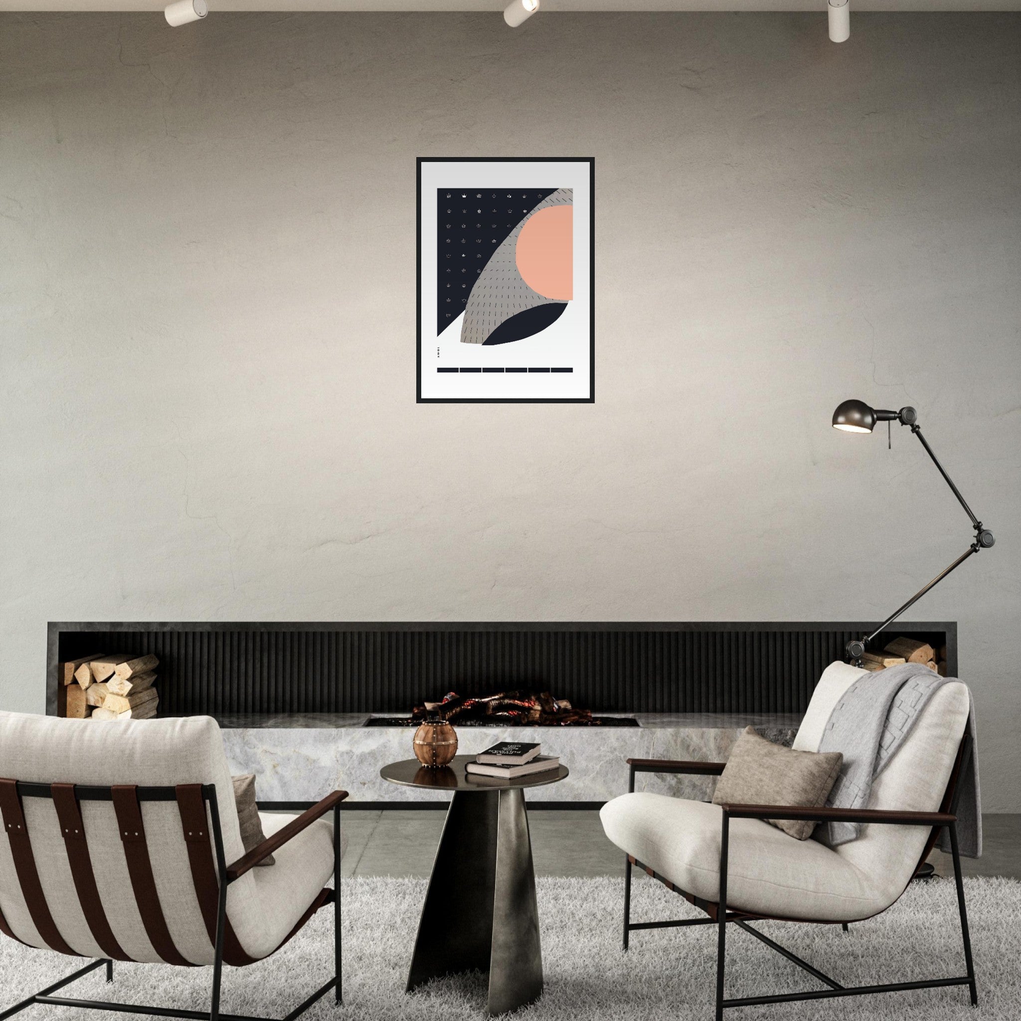 This minimalist wall art print is a Scandinavian wall art in a neutral colour palette of black, white, grey and soft peach tones, with geometric and organic shapes and a graphic pattern made of clean lines. This modern collage art work features minimalist crown illustrations and an abstract pattern print inspired by Scandinavian design. This black and white framed print is a black and white abstract wall art with a wooden frame, ready to hang in your living room, bedroom, kitchen or office wall decor. This modern Scandinavian art print has a contemporary art style and was created by hand using collage and mixed media. A homage to Danish design, and a cool art print or gift for any home decor or minimalist art lovers of Nordic design.
