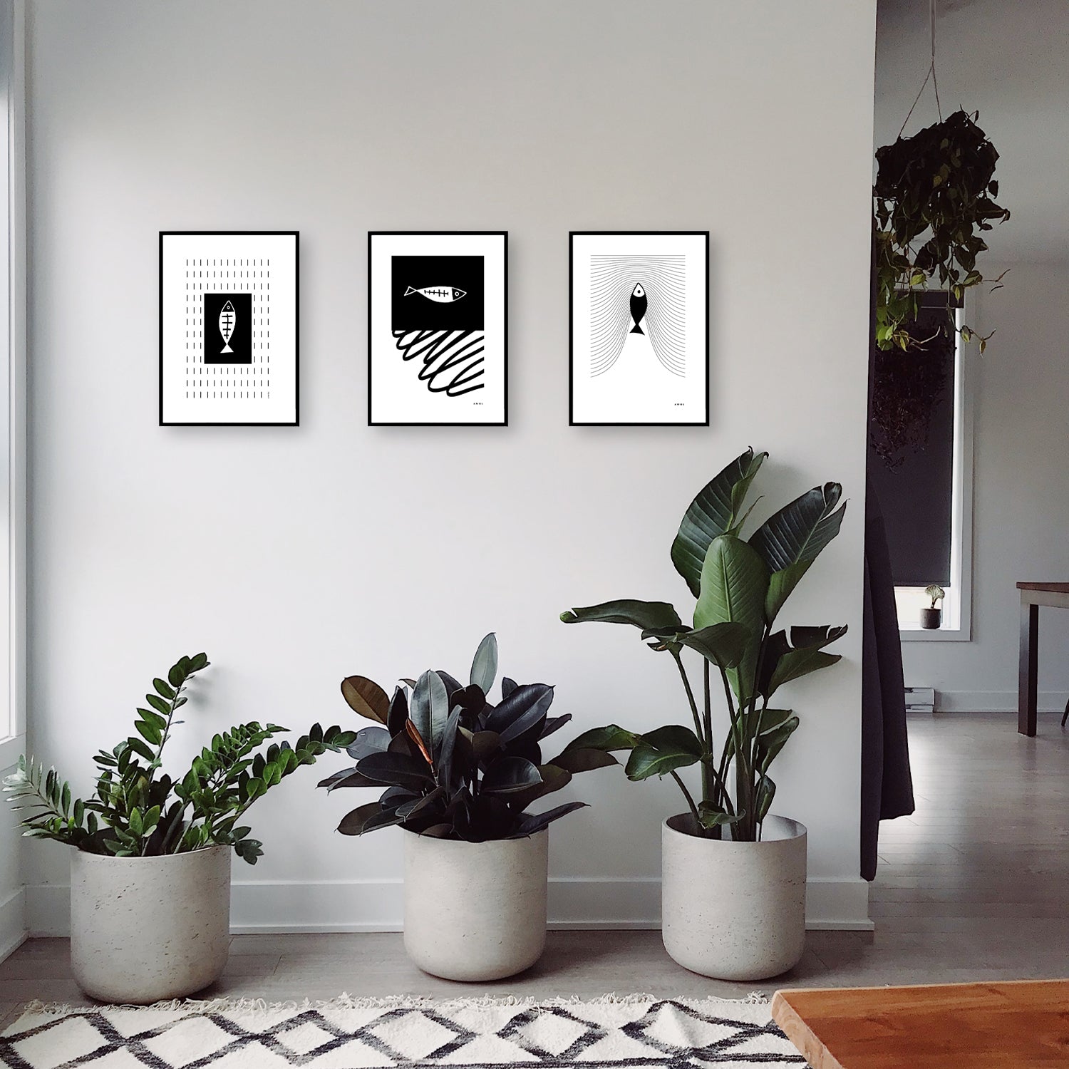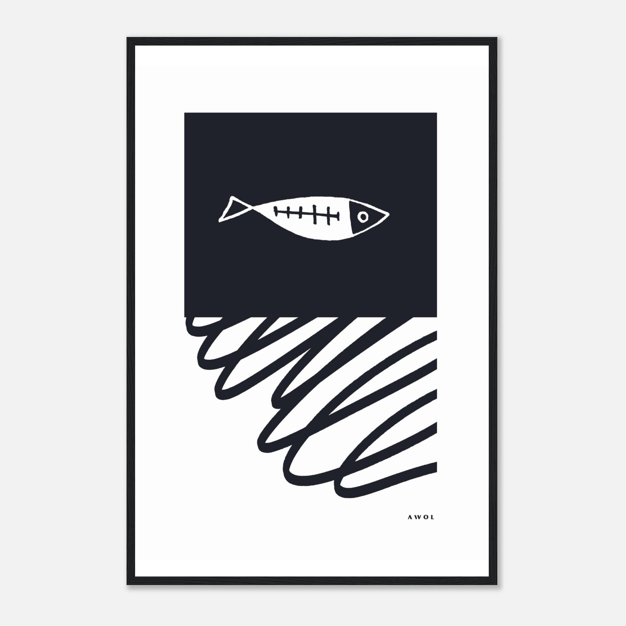 This black and white framed print is a monochrome wall art decor print illustrating a sardine swimming in an abstract sea, drawn with a graphic, continuous line drawing. Blending a Scandinavian wall art style with minimalist shapes and gestural lines, this monochrome wall art with a fish illustration evokes movement, water currents, stormy seas, and speed. The Scandinavian design aesthetic comes across in this modern abstract wall art. The black and white framed poster adds a modern art work to your home, kitchen or office decor making it a fun nautical print for any space. Whether a gift for someone who loves fishing or minimalist art or Scandinavian design, this is a fun artwork that makes a bold black and white art statement for any interior design style..