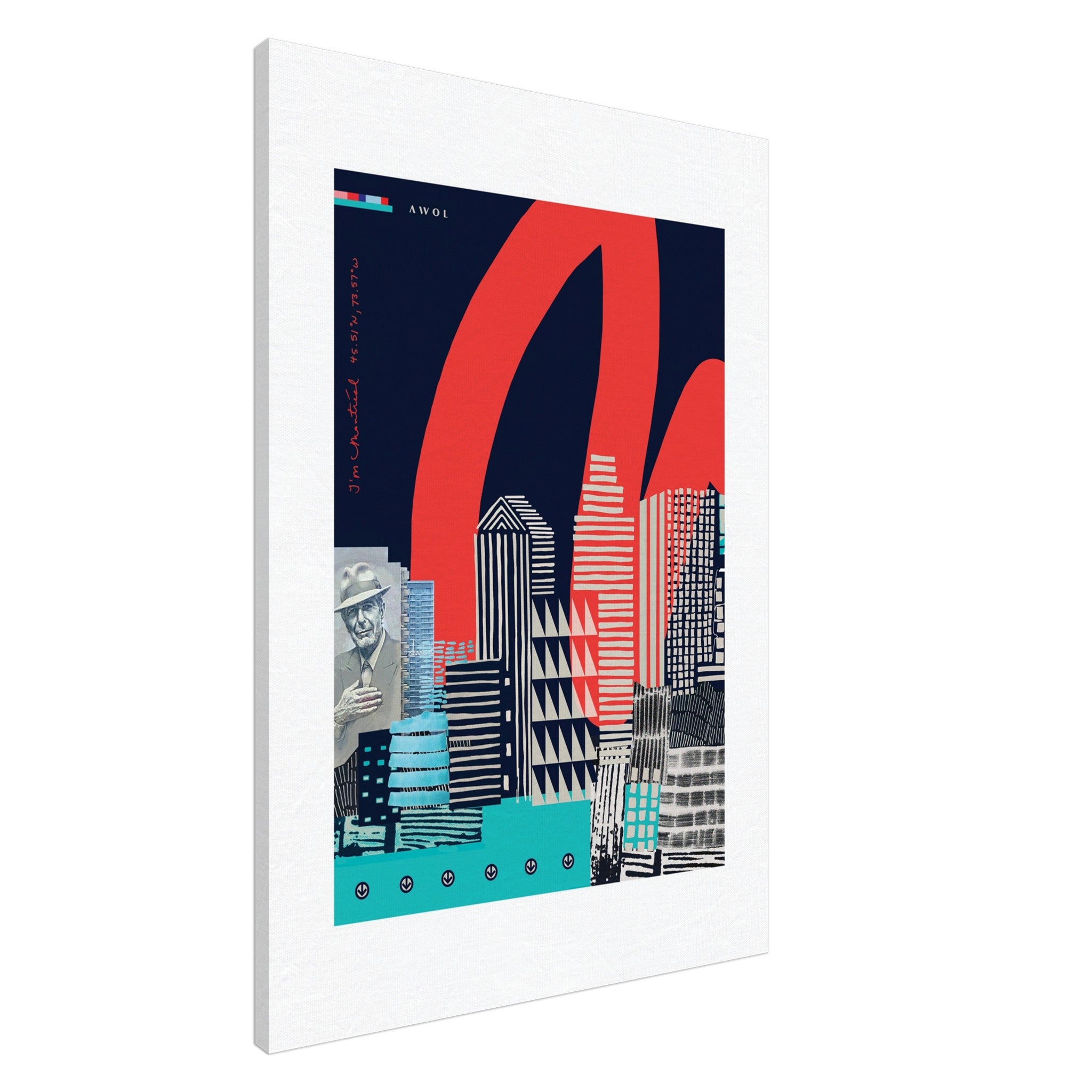 This bold, graphic Montreal city canvas print is a modern urban canvas wall art of the skyline of Montreal, Canada – using mixed media, navy blue, turquoise blue, and a red accent colour pop, this Montreal skyline collage artwork on canvas depicts the famous mural of Leonard Cohen among skyscrapers and highrise buildings, paying homage to this Canadian artist and to the city’s architecture. Abstract red spray paint makes a nod to the street art culture Montreal is famous for – if you’ve been to Mural Festival or walked around St. Laurent boulevard, you know. The abstract shapes and graphic, bold art style of this abstract canvas wall art allude to the cobblestone streets in the historic old town, the never-ending construction work, the subway arrows and underground city beneath its downtown streets, and the overall eclectic, bohemian and avant-garde spirit of this creative and inspiring Canadian city in a wall canvas art work that is ready to hang. The Montreal skyline wall art print is a contemporary artwork on canvas for your home decor and office wall decor – it also makes a cool Montreal travel souvenir or gift for Montrealers, Montreal lovers, and Leonard Cohen fans.