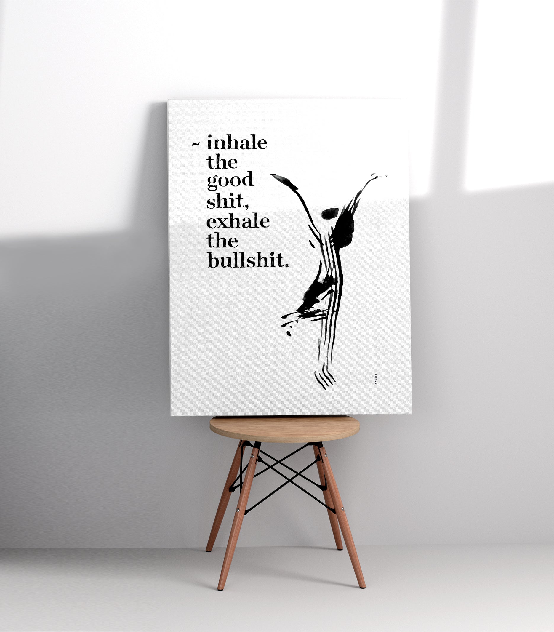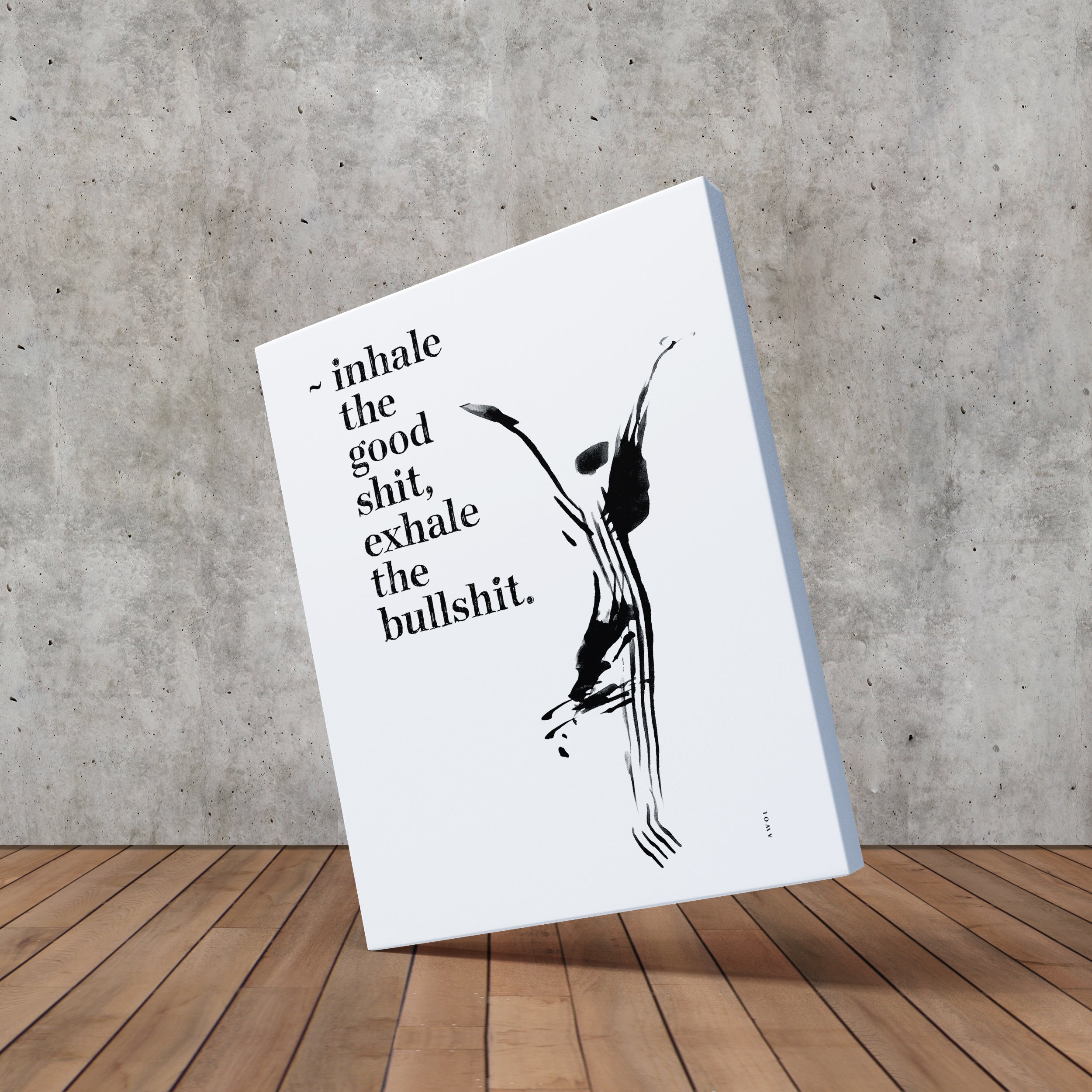 In this large minimalist zen wall art on canvas, modern art and the art of yoga blend in yoga a monochrome wall art and funny quote “Inhale the Good Shit, Exhale The Bullshit” – the perfect reminder to embrace positivity, mental health and a zen attitude in life and in your yoga practice. At the heart of this modern mental health artwork and positive morning affirmation lies a mantra to release negativity, embrace positive thinking, and inhale the essence of modern mindfulness. All you have to do is breathe. This fun yoga print on canvas is a modern wall decor for your yoga studio, bedroom, living room or home decor , and a unique and fun gift for your friends and loved ones, merging the art of living yoga with the art of maintaining a positive attitude and happy outlook on life by breathing and letting go of negativity.
