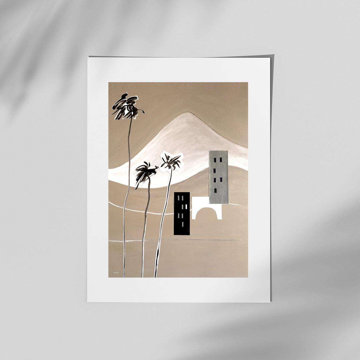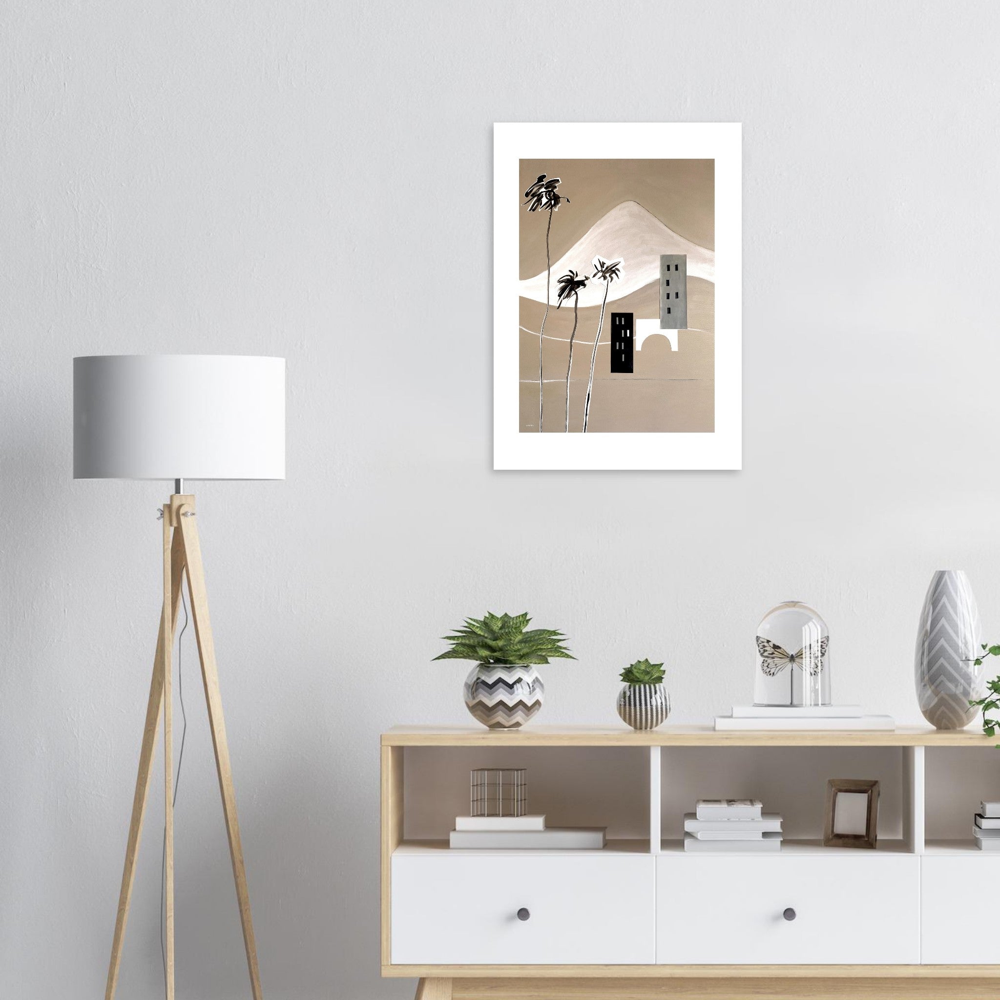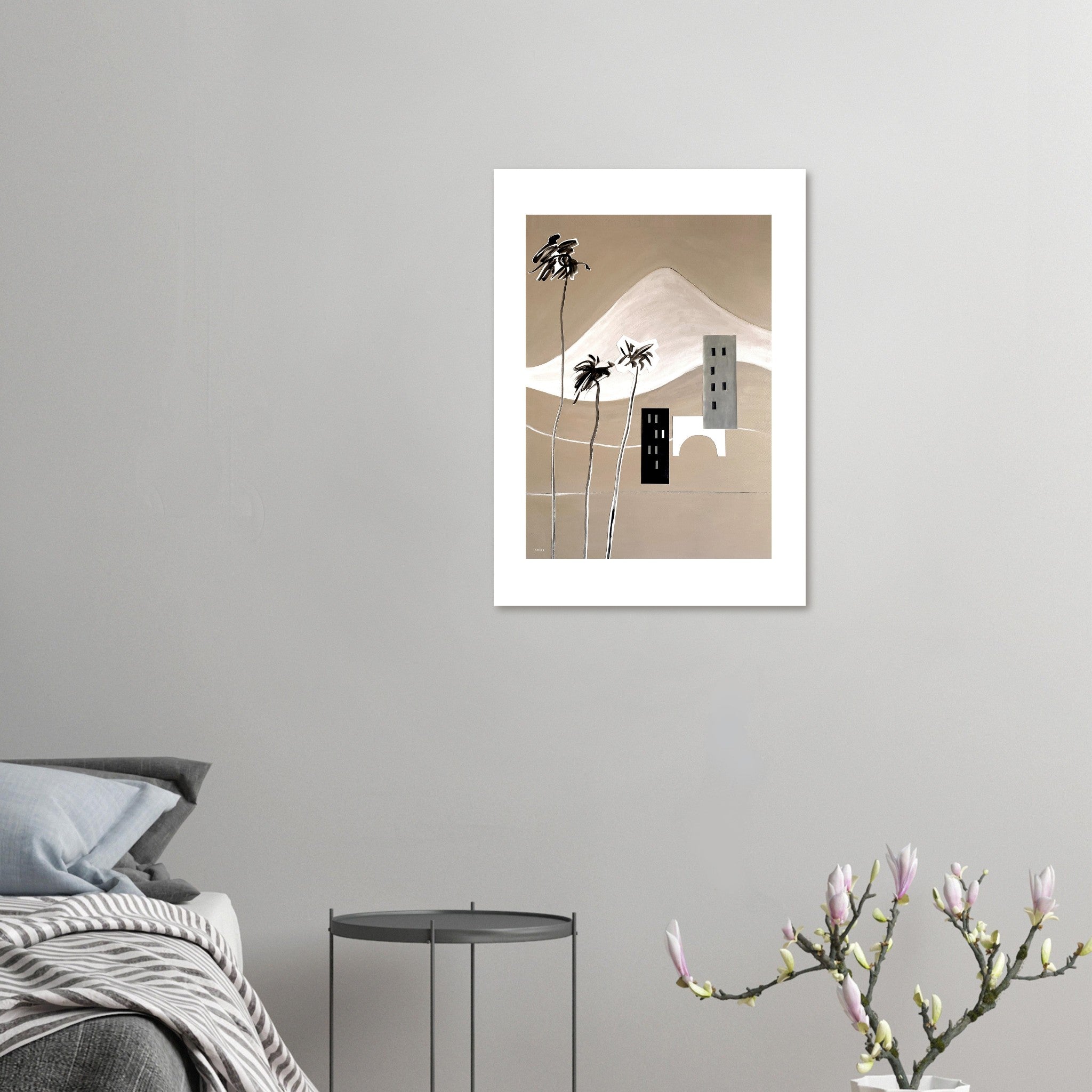 This minimalist wall poster with a modern abstraction of mountains, palm trees and a graphic landscape with buildings, a coastal road and a bridge by the sea is a modern Mediterranean art print created using collage and painting on canvas, paper and decoupage for an abstraction of Italian scenery and South of France coastal landscapes. The graphic landscape travel print features bold, graphic shapes in neutral, contrasting colours representing small towns and villages in this Mediterranean inspired artwork. The snow-capped French and Italian Alps mountains serve as a backdrop to this monochrome landscape abstraction in black, white and beige colours, evoking balmy Mediterranean breezes and tall palm trees swaying in the wind by the Mediterranean sea. This abstract landscape is part of a two piece art series meant to bring beautiful travel destination art for your walls, and a dose of wanderlust and modern Mediterranean design to your office space, living room, hallway or bedroom decor.