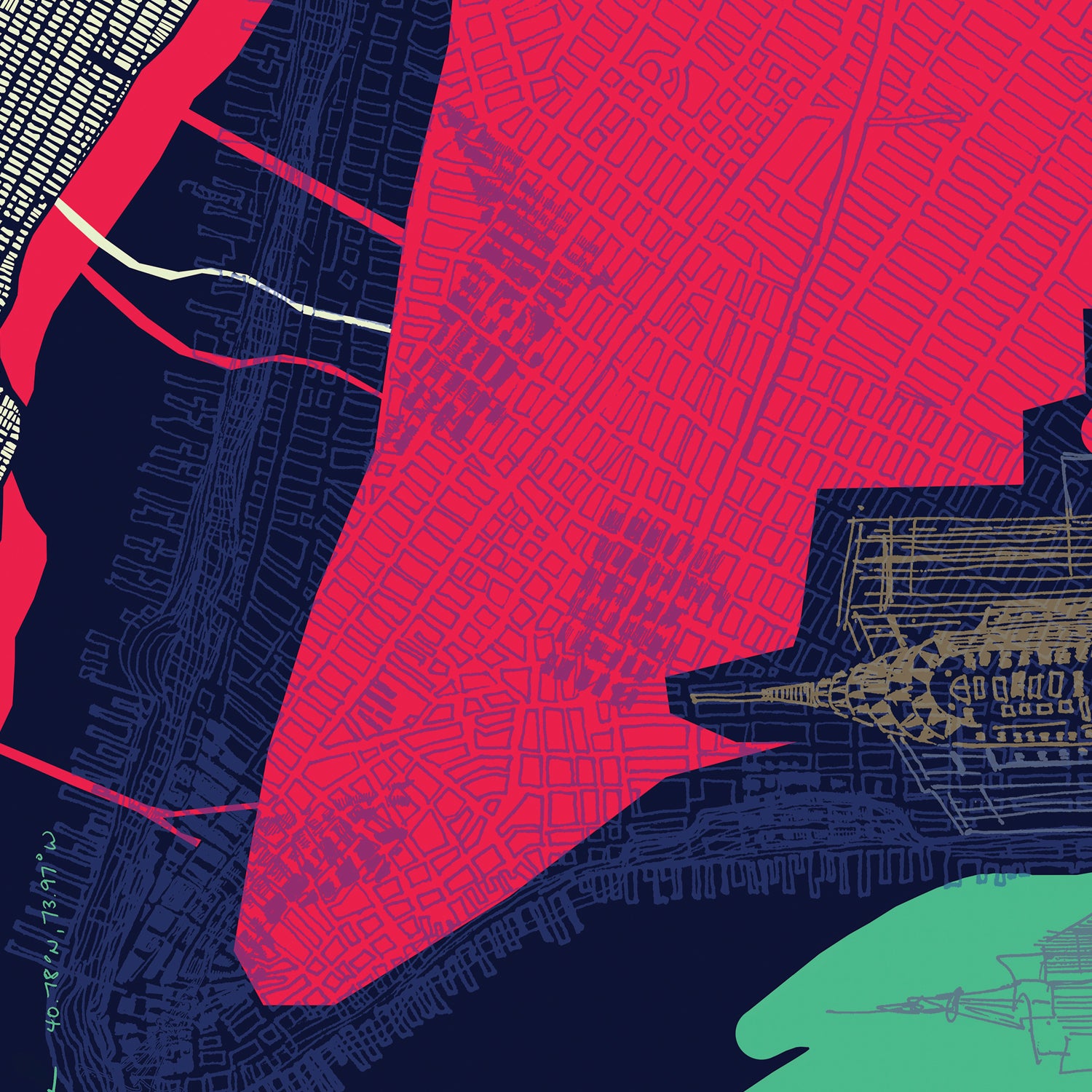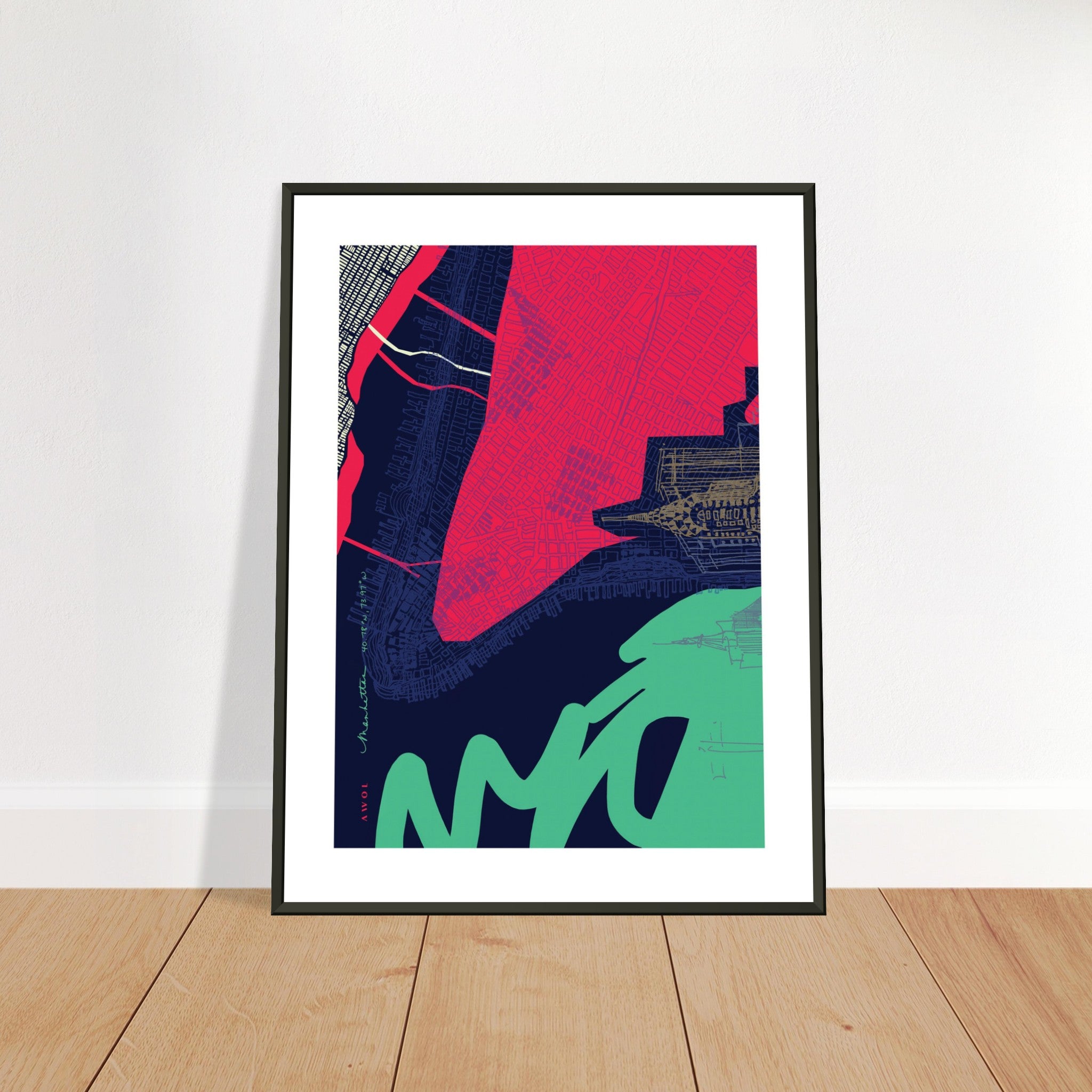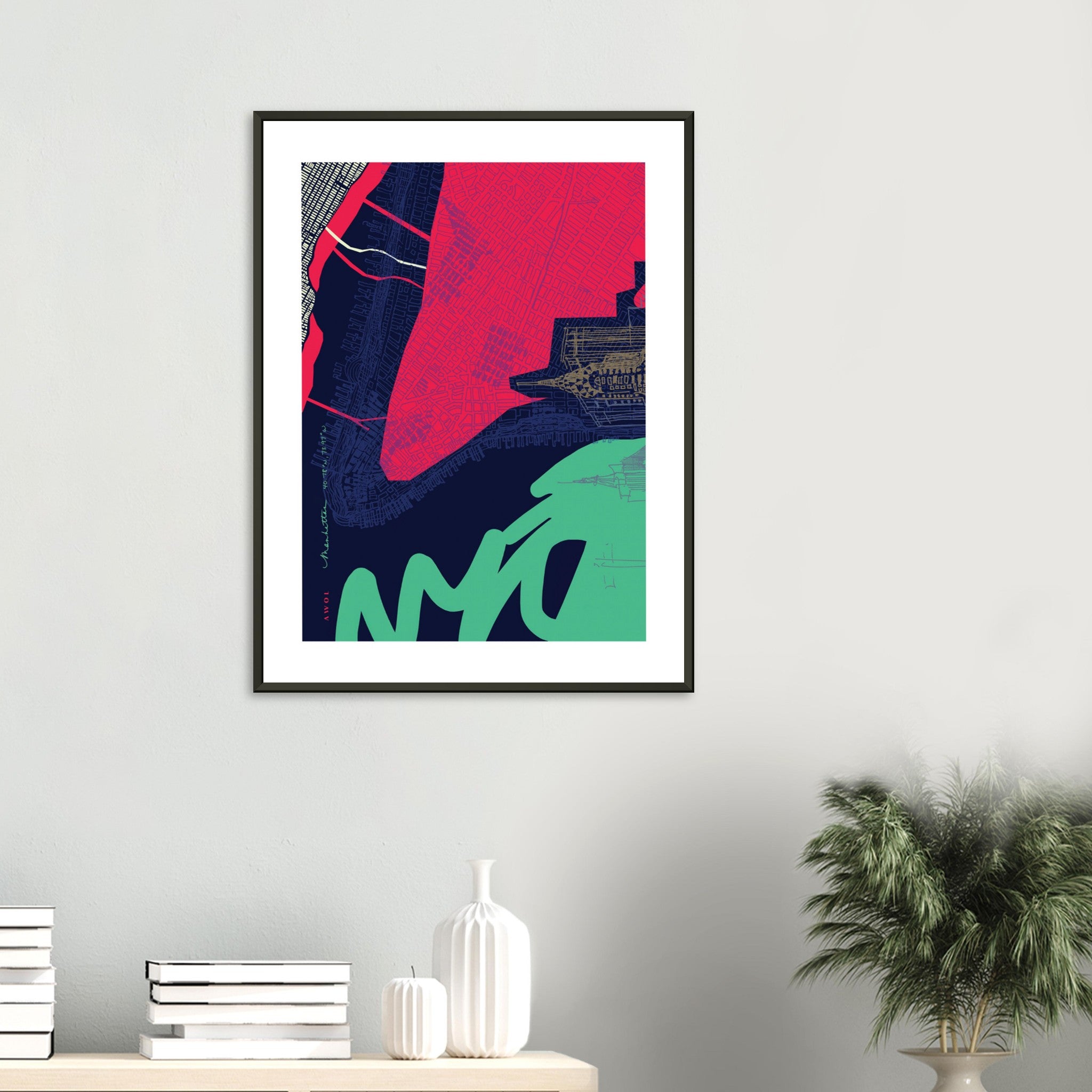 This contemporary, colourful New York wall art is an urban art, framed poster of Manhattan seen from above, in an abstract and bold art style. This New York City framed wall art is a graphic, contemporary cityscape made with mixed media: rich navy blue colours and gold contrast with bright accent colours of green, warm red, black and white. This abstract New York wall poster is a graphic abstraction of Manhattan topography, its skyscrapers and iconic bridges crossing the Hudson River seen from an aerial view. This urban New York framed abstract wall art is a mix between a city map and intricate skyline illustration: the city streets are hand illustrated in graphic patterns in an eclectic urban travel art print mixing street art, drawing and collage, while a detailed illustration of iconic New York skyscrapers is juxtaposed with spray painted NYC lettering. This modern abstract wall art with a metal frame is a cool New York souvenir, a unique gift idea for New York lovers, and a modern travel art print for your home decor. Whether you are a native New Yorker or are looking for a modern, minimalist NYC artwork print or a thoughtful New York gift to remember your New York trip, this modern wall art decor print captures the innovative and creative spirit of the Big Apple in a modern home decor that makes a bold accent art piece for any space – and is ready to hang.