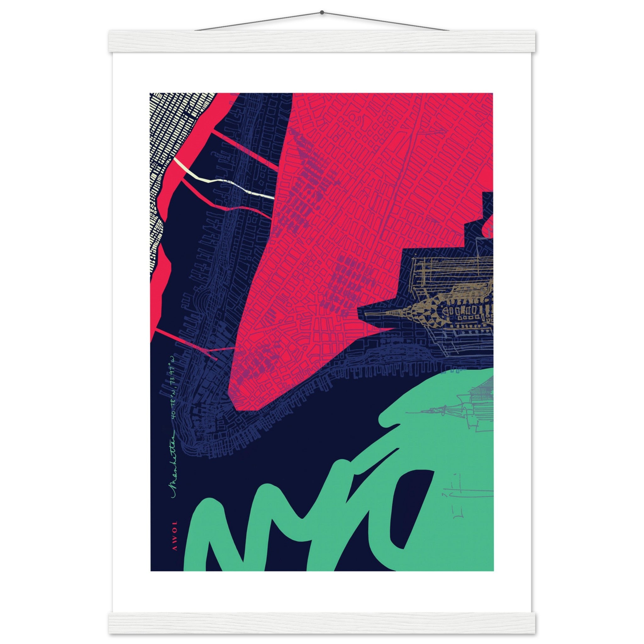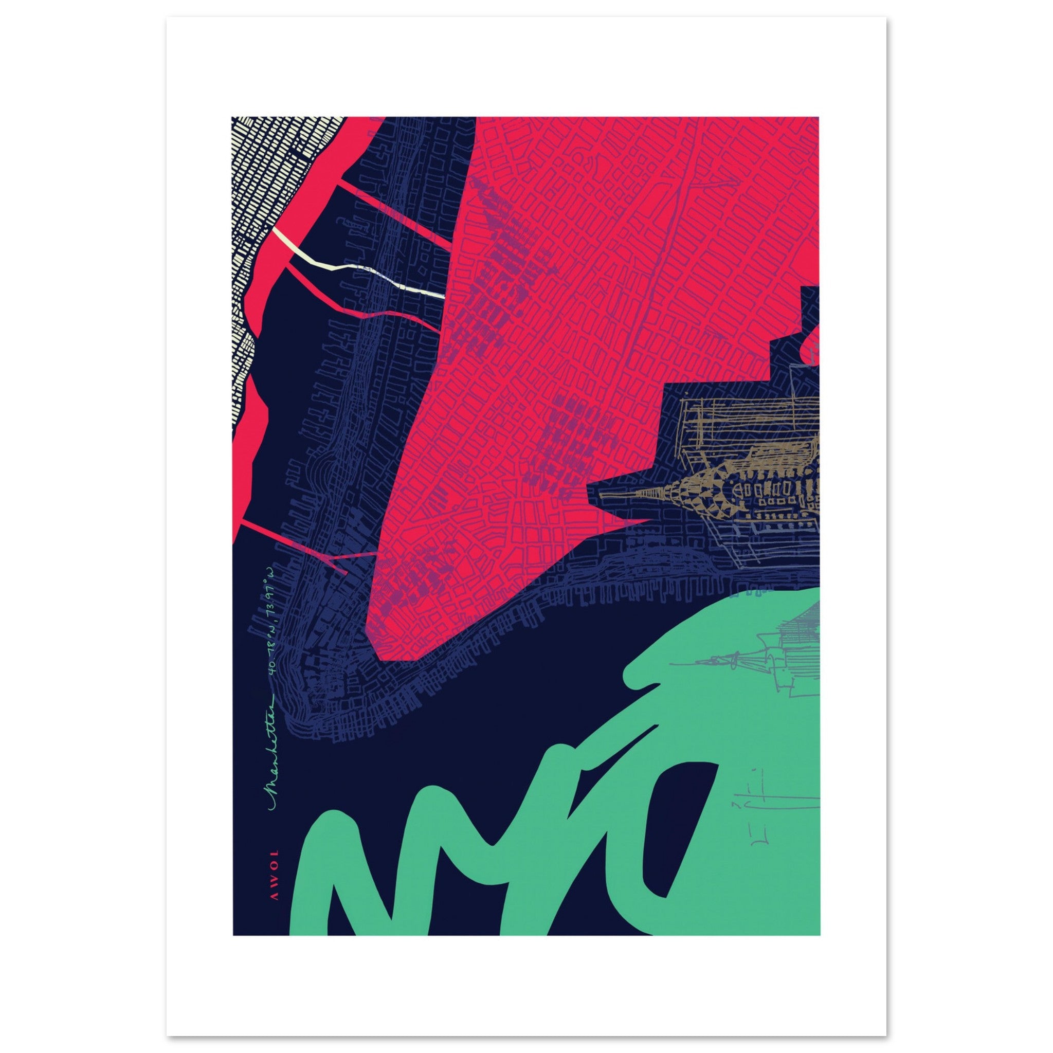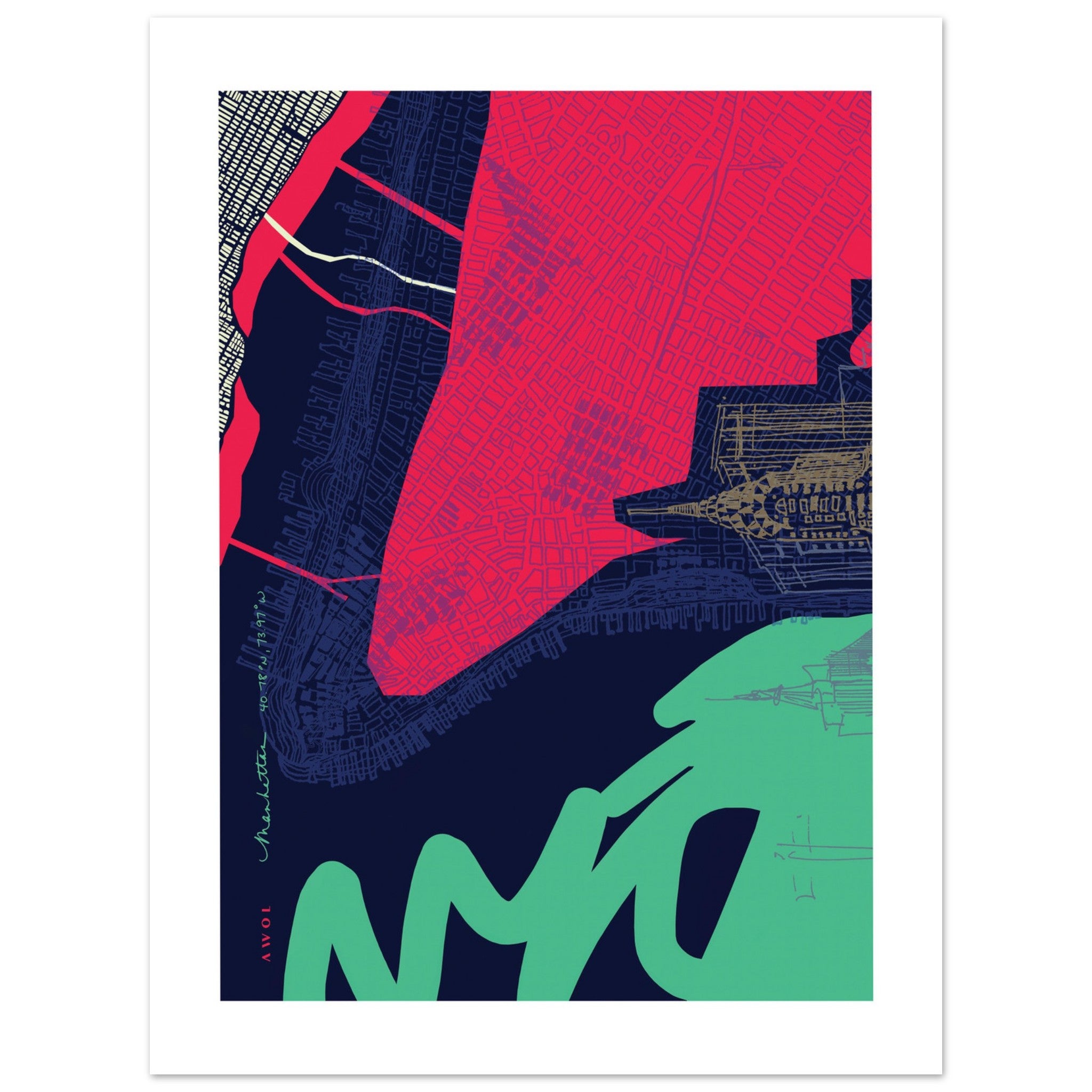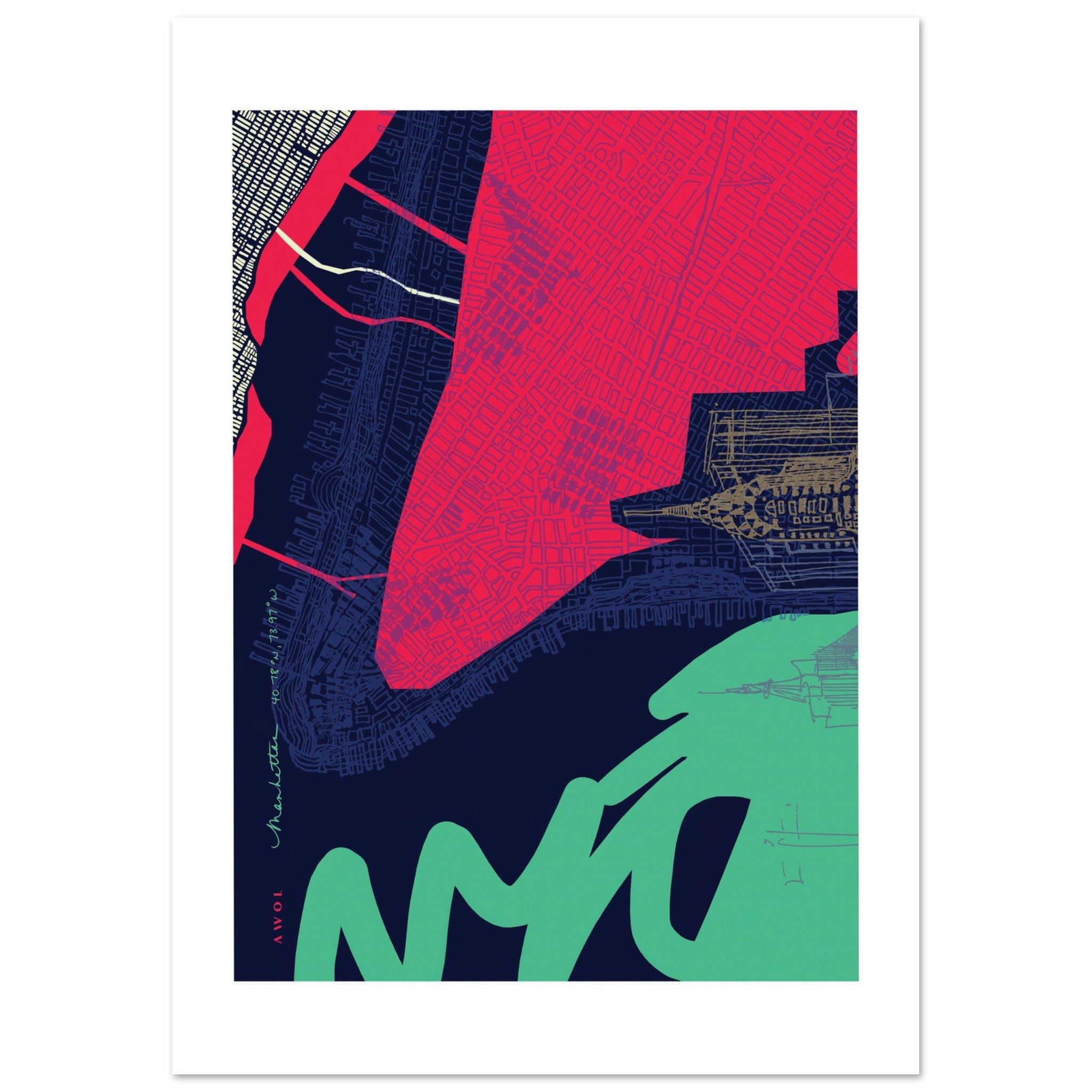 This modern New York poster is a Manhattan urban landscape art print that is both elegant and edgy. This New York City artwork is hand drawn in a graphic, contemporary art style: rich navy blue colours and gold contrast with bright colour pops of green, warm red, black and white. This abstract New York wall art is a graphic abstraction of Manhattan topography, its skyscrapers and iconic bridges crossing the Hudson River seen from an aerial view. This urban New York wall art print is a mix between a city map and intricate skyline illustration: the city streets are hand illustrated in graphic patterns in an eclectic urban poster print mixing street art, drawing and collage, while a detailed illustration of iconic New York skyscrapers is juxtaposed with spray painted NYC lettering. This modern abstract wall art is a cool New York souvenir, a unique gift idea for New York lovers, and a modern travel print for your home decor. Whether you are a native New Yorker or are looking for a modern, minimalist NYC artwork print or a thoughtful New York gift to remember your New York trip, this modern poster print captures the innovative and creative spirit of the Big Apple in a wall art decor that makes a bold accent art piece for any space.