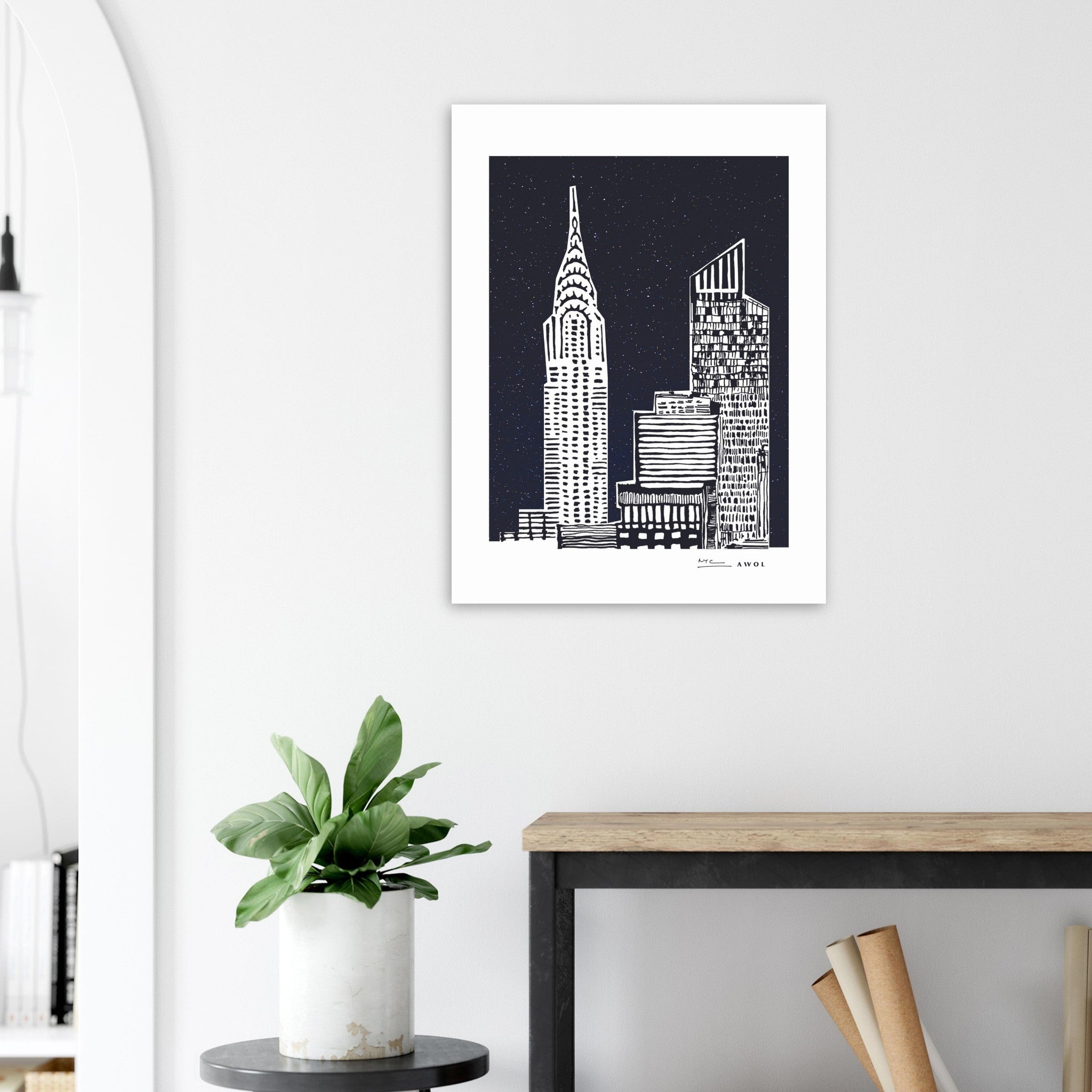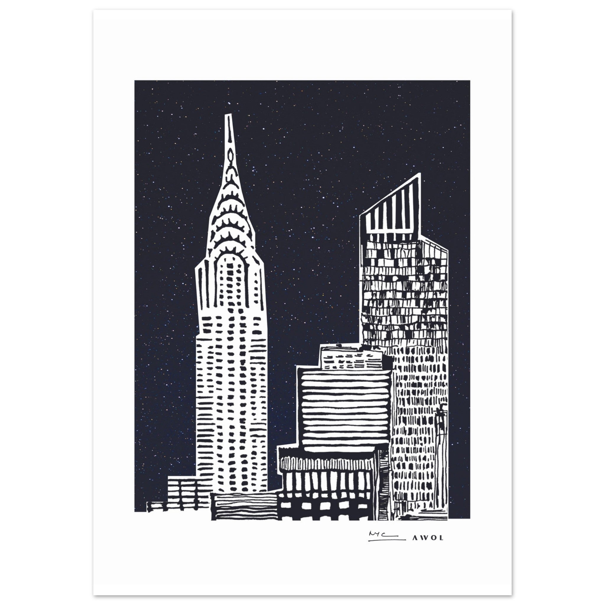 This monochrome wall poster is a New York city art print with iconic Manhattan buildings at night. This iconic Manhattan skyline drawing art print is a black and white, graphic wall art with a modern aesthetic, abstract windows, bold shapes and forms in a high-contrast, graphic art style. This New York poster seamlessly blends black and white patterns and abstract shapes, creating a unique visual narrative of the city’s iconic architecture, capturing the modern rhythm of the city that never sleeps. This modern city art print includes the iconic Chrysler building art, bathed in the glow of the city lights against a backdrop of a starry night sky, adding a touch of magic and transporting you to the heart of Manhattan after dark – a time when the cityscape comes alive. This monochrome urban art print makes a unique city artwork for your wall decor, a New York souvenir and a cool gift for New York city lovers, taking you on a visual journey to one of the world’s most exciting travel destinations, New York City.