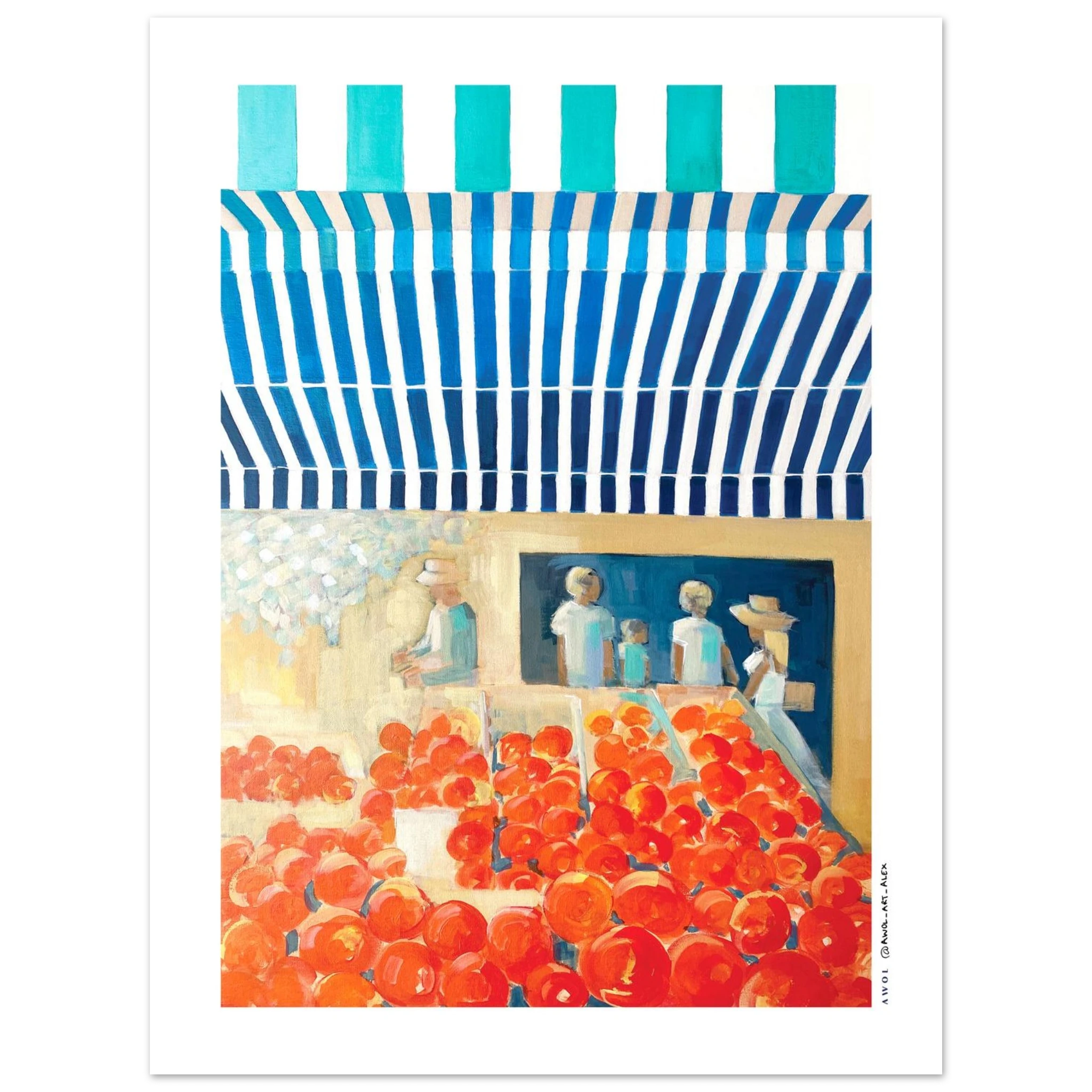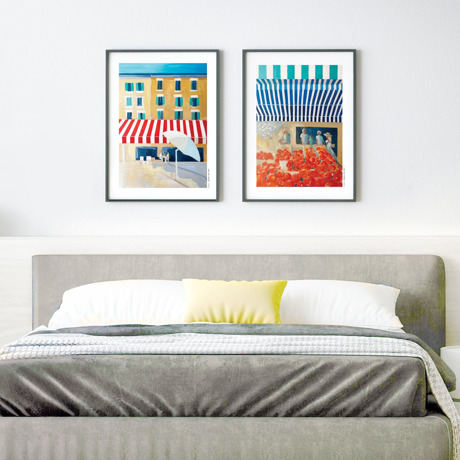 Sunshine, bright colours, and uplifting Mediterranean style come together in this French Riviera art print inspired by the famous open-air local market in Nice, France. Featuring a vibrant, colourful palette of yellow, golden ochre, soft coastal blues, turquoise, bright orange and reds, this modern market scene painting brings a fresh, design-forward aesthetic to your wall decor – filled with graphic shapes, navy blue stripes, and Vitamin C. This Côte d’Azur wall art print captures the relaxed rhythm of a French morning filled with good vibes and Mediterranean style. Behind a market stand overflowing with fresh colourful fruit, a group of people dressed in casual chic summer style stand in conversation, about to enter (or perhaps coming out of), a nearby boutique. To the side, a tanned man in a summer hat goes about his day, while surrounded by flowers peeking out from a graphic, blue and white striped awning. This French morning scene is soaked in sunlight, bright colours, and a relaxed, slow living French Riviera mood. Whether hung on its own or as part of a duo with its sister artwork from this Cours Saleya diptych, this fine art poster print offers superior gallery-quality colour and detail—ideal for kitchen decor, studios, sunrooms, bedrooms or any space in need of a splash of colour or an accent artwork infused with Mediterranean vibes, warmth and sophistication.