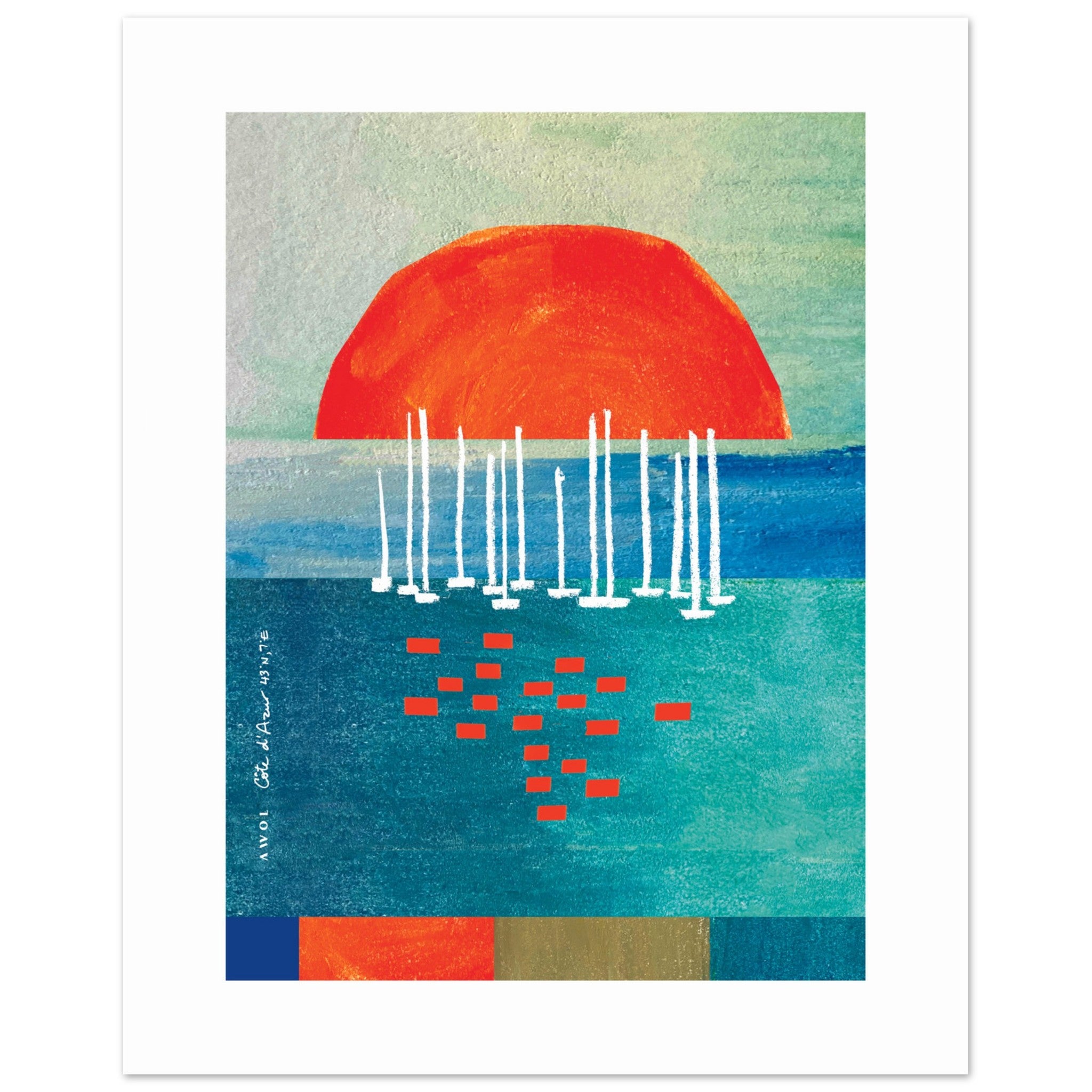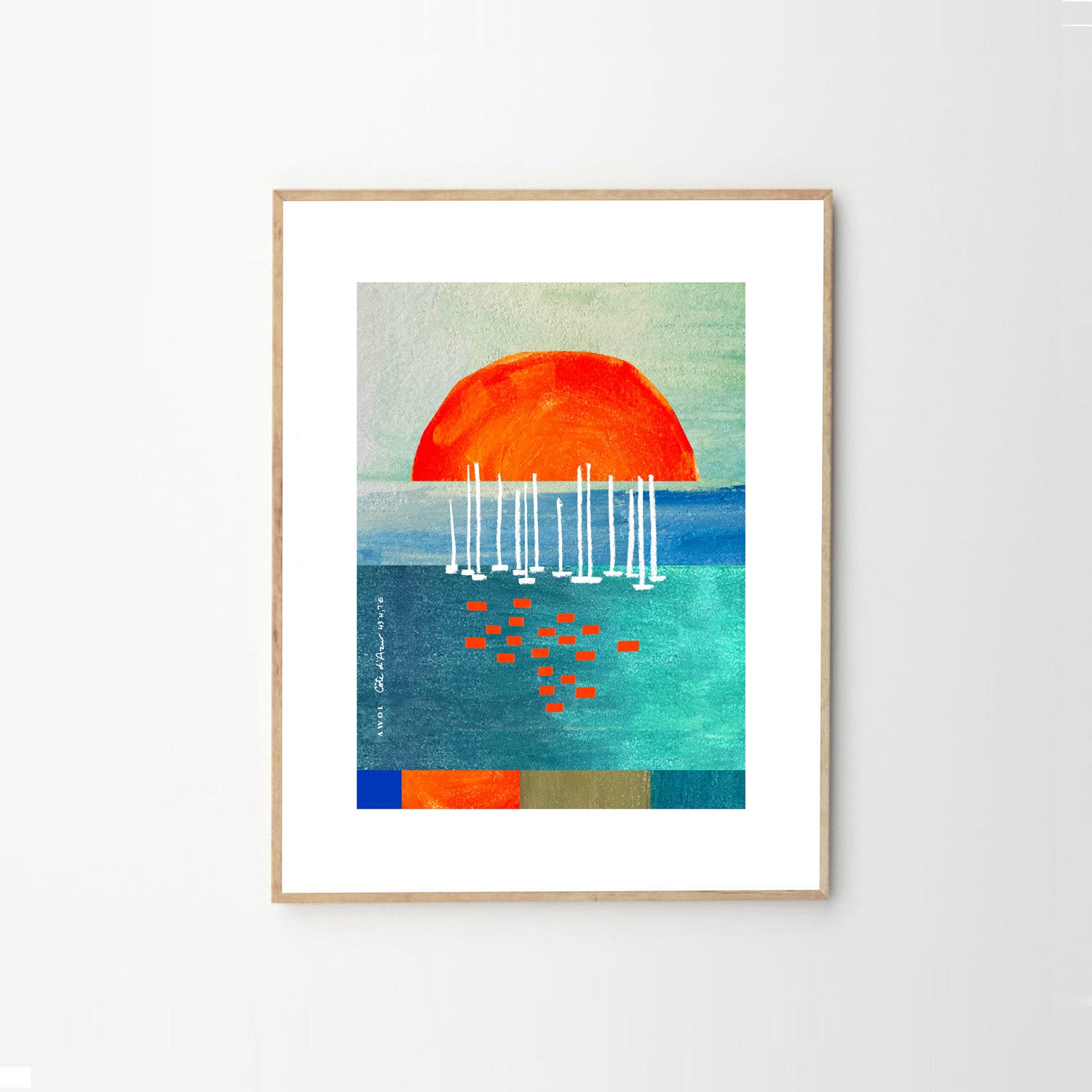 This turquoise blue and orange sunrise art print is a fine art poster of a colourful landscape painting with a bright rising sun overlooking little port towns with white sailboats. This colourful travel art print depicts an azure blue sea with boats reflected in the water beneath the red sun. A graphic bar of geometric shapes and colour blocking in vivid orange, blue, and green accent colours adds a contemporary art accent and a bold colour contrast to this wall poster inspired by the Côte d’Azur / French Riviera in the South of France. This modern abstract wall art work is rich with warm tropical colours and vivid blue The painted texture, enhances the visual allure of this painted seascape print, evoking early mornings and relaxing summer evenings – the serene moments experienced on vacation in charming port towns in coastal destinations. This sea scenery makes a beautiful modern sea wall art for early risers, sunrise and sunset lovers and sailing lovers who appreciate nautical landscapes in beautiful destinations. Let this colourful art print infuse your wall decor with good morning positivity, a peaceful vacation mood, and a generous dose of wanderlust.