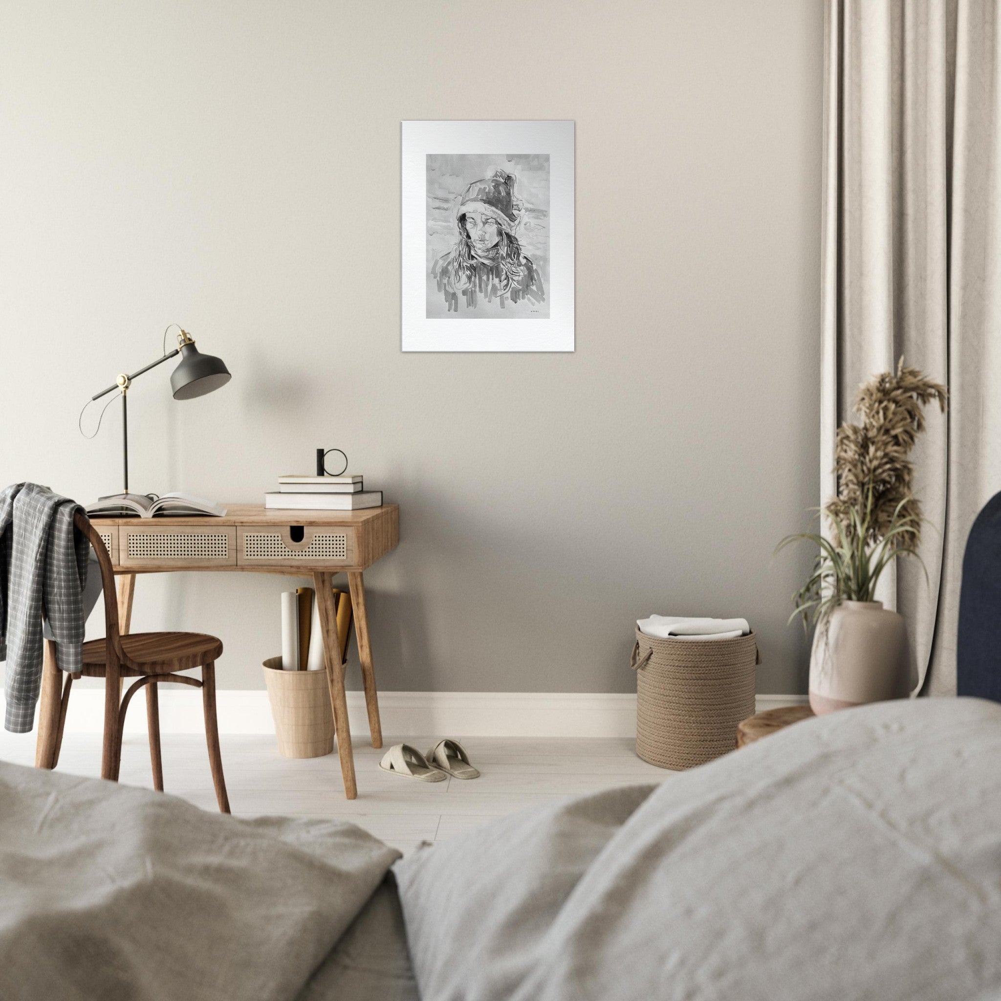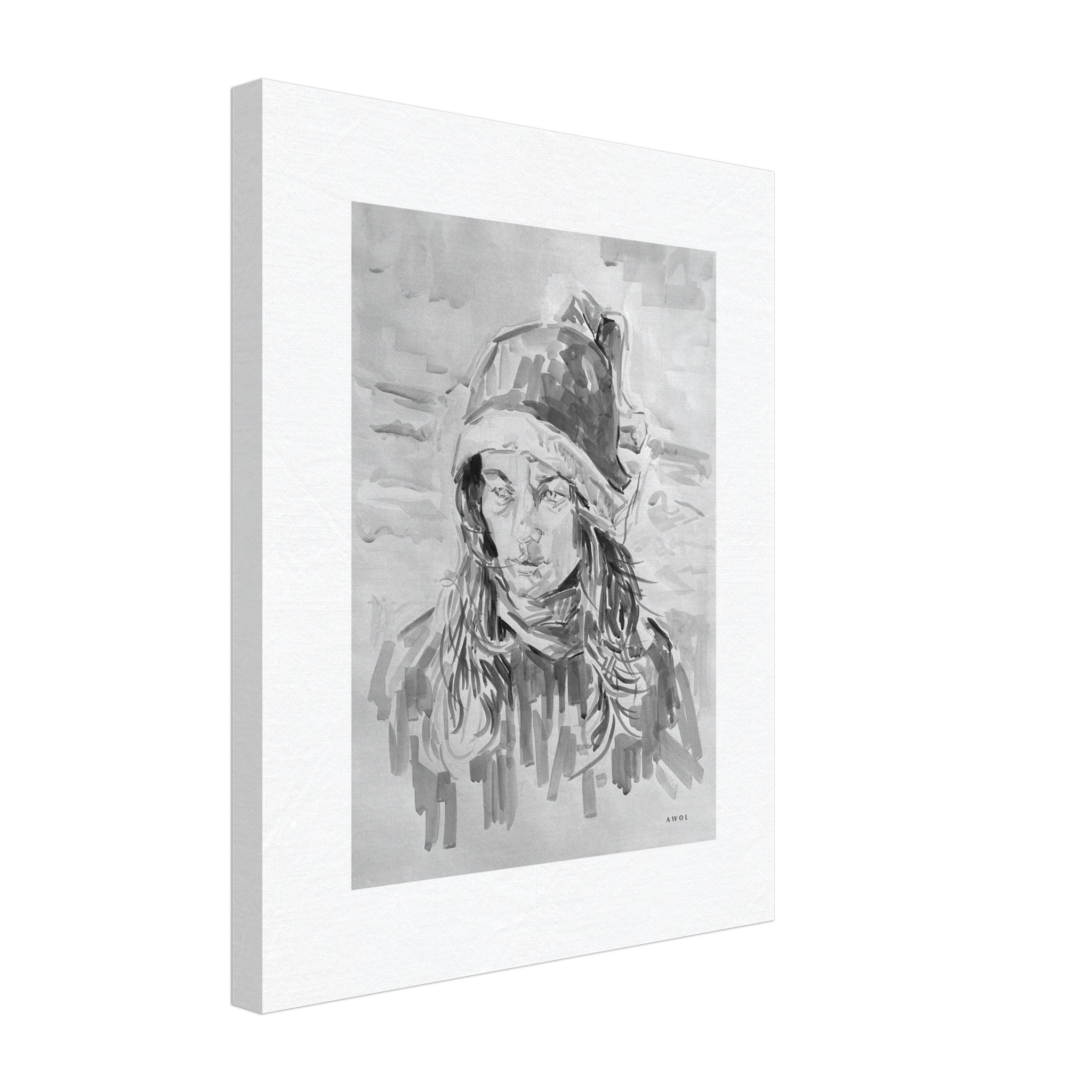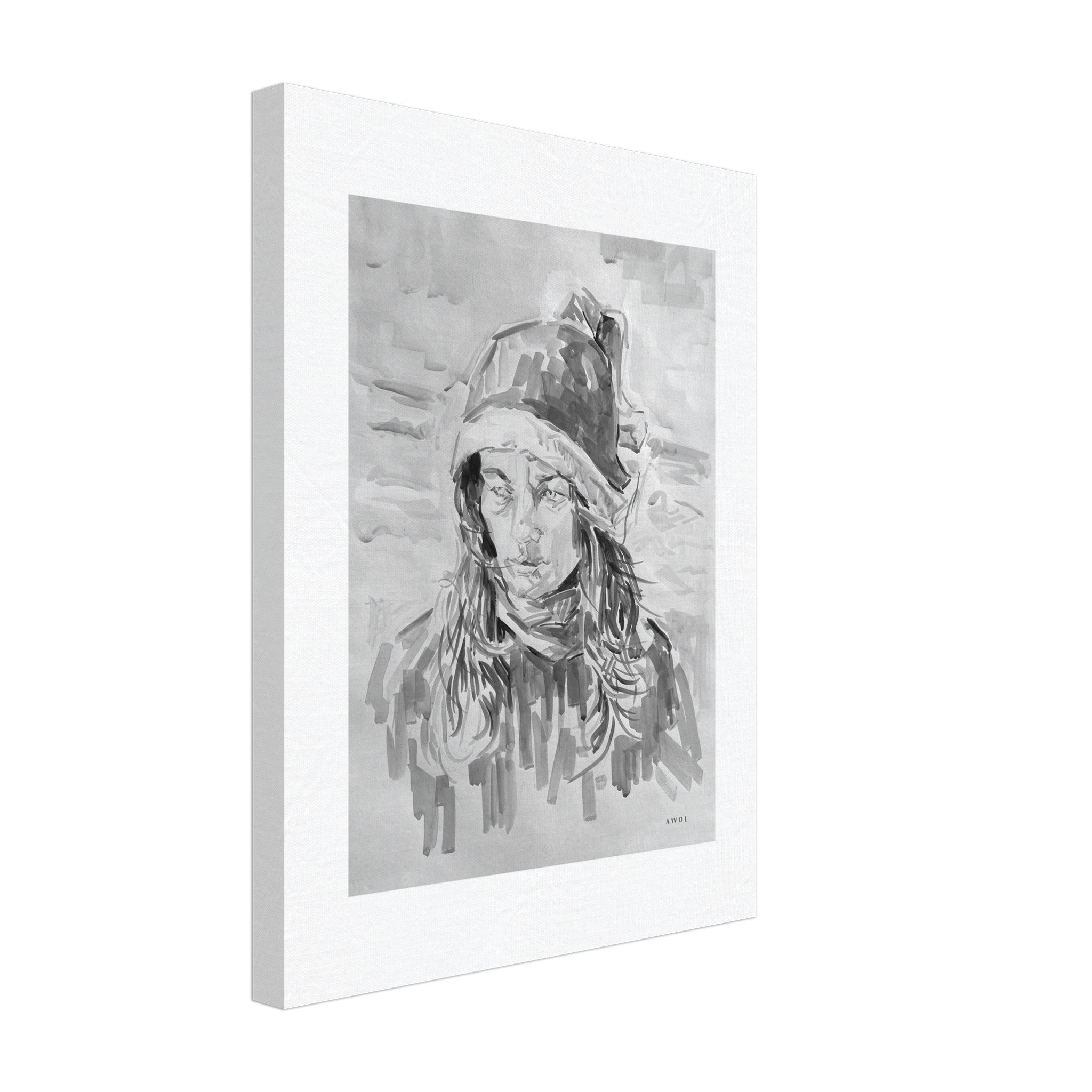 This black and white fine art portrait print on canvas shows a beautiful woman on a beach in a Christmas hat and winter sweater gazing in the distance at the sea while her hair blows in the wind and the sea breeze adds movement and dynamism to this seascape. This wall canvas art is a black and white wall art print evoking a sense of windy seas, travel during the holidays, faraway destinations. This portrait is a large canvas wall art of a woman with beautiful eyes and a mysterious gaze, looking into a distance full of possibilities and endless horizons. Inspired by travels far from home during the artist’s years spend living abroad in Asia, this watercolour print evokes exotic travel destinations, faraway places, a nostalgic holiday mood and the allure of freedom, explorations and life adventures. Hand painted a black and white watercolour style, this seascape wall art print on canvas is a thoughtful gift for people who are seeking a unique wall decor print evoking a sense of travel, adventure, the sea and movement for their home decor.