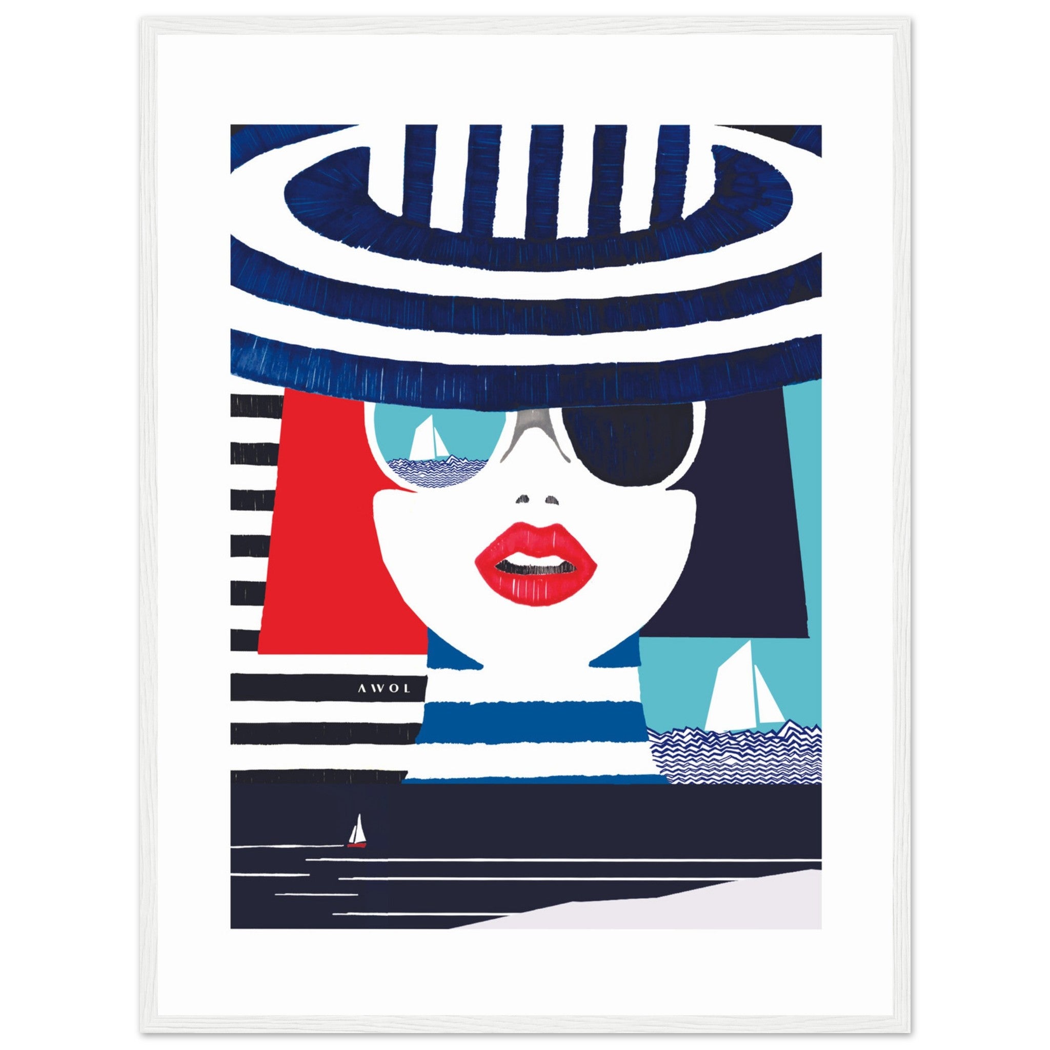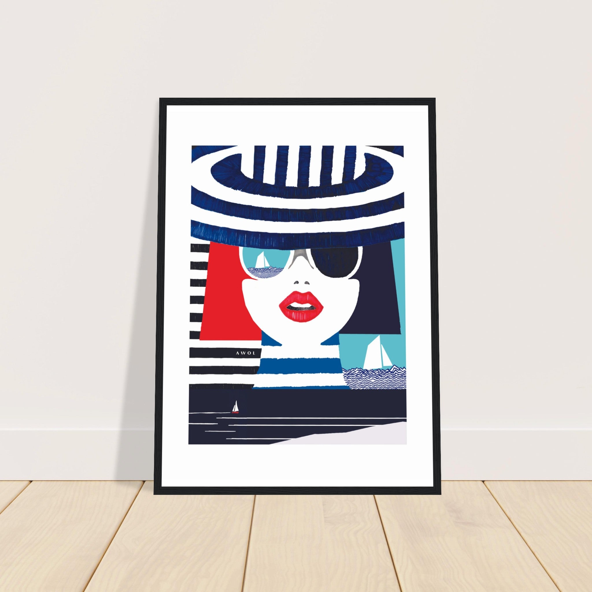 This Mediterranean framed wall art is a graphic art portrait of a beautiful, glamorous and modern woman on a beach in chic European style: wearing an oversized striped beach hat, red lipstick and sunglasses looking out at the Mediterranean sea, a white sailboat reflected in her eyes — an escapist travel print, relaxing by the the azure water of the Mediterranean Sea. The bold colour palette of red, blue, white and black and the graphic blue and white stripes add a modern art style to this colourful wall art with wooden frame, fusing a bold, modern and graphic aesthetic with beachside elegance. This framed art print will bring the stylish energy of the French Riviera and Italian Riviera destinations to your wall decor, from St. Tropez to Monaco and Portofino to the Amalfi Coast, infusing your home decor with a modern beach aesthetic, timeless Mediterranean elegance, vacation vibes and sunshine – a bold art print of coastal living for your living room, bedroom, hallways, office decor or beach house.