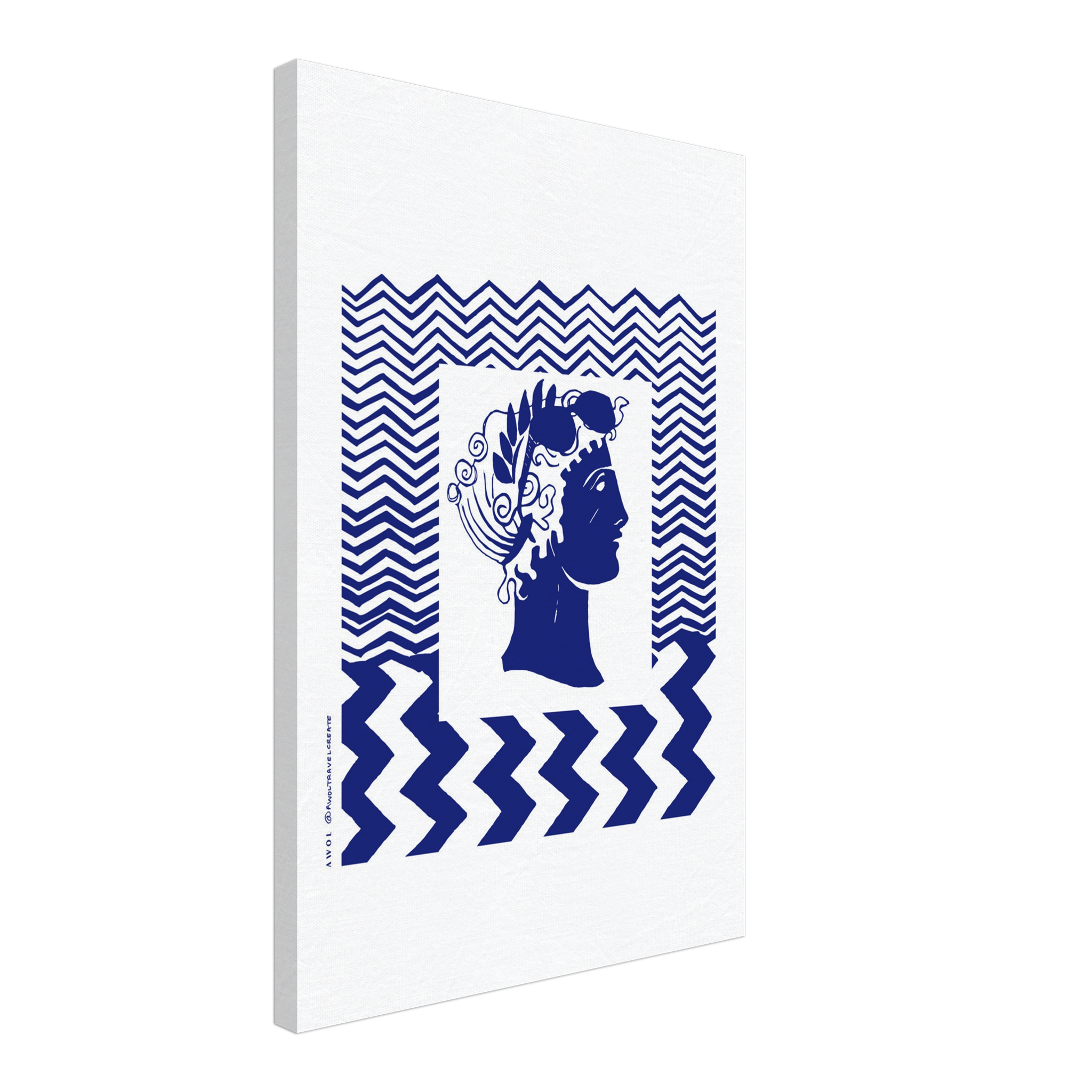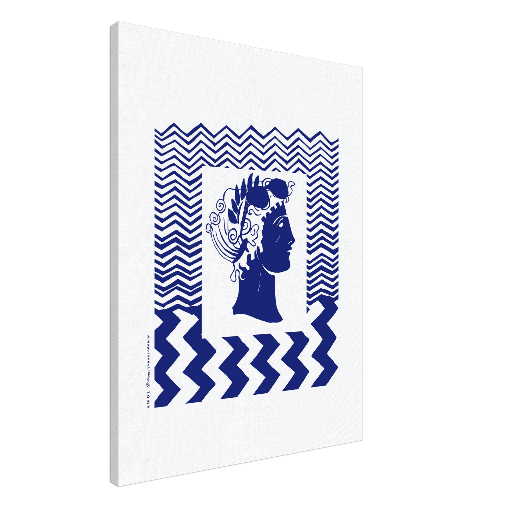 In this modern blue canvas wall art, a portrait of a handsome young man on the beach with sunglasses is surrounded by a bold pattern of graphic lines representing sea waves, in a blue and white nautical art print on canvas. This minimalist canvas art print alludes to the timeless heritage and cultural richness of the Mediterranean region, Greek mythology and islands, Italy’s coastlines, Sardinia, Sicily, Corsica, Spain or the South of France destinations and history – creating an artful fusion of past and present. with this contemporary portrait art of the Greek God Adonis, the god of beauty and desire… and also the most handsome mortal on Earth, once upon a time. Perfect for those seeking Greek inspired wall art, nautical decor, boho wall decor, or simply a fun accent art print to brighten up any room.