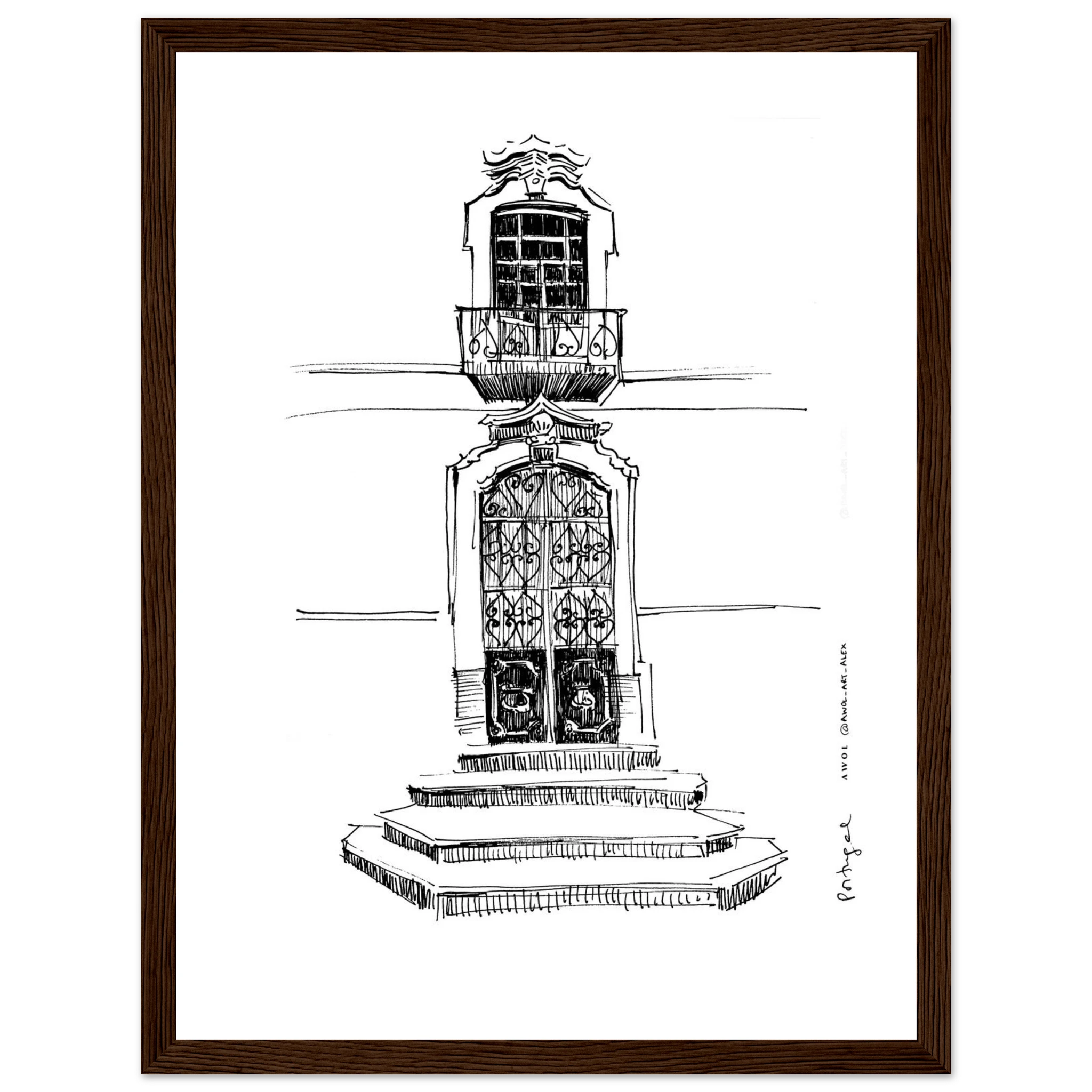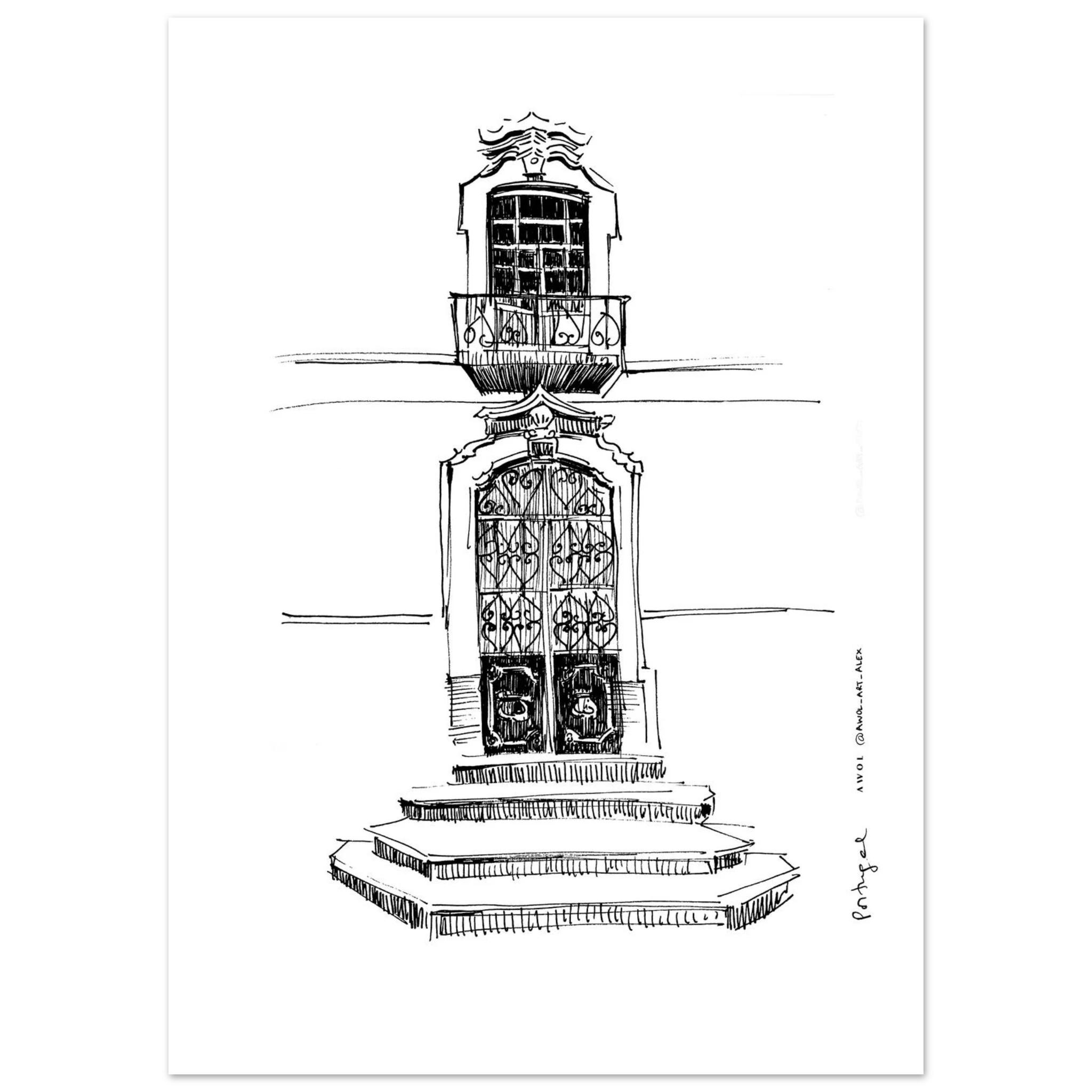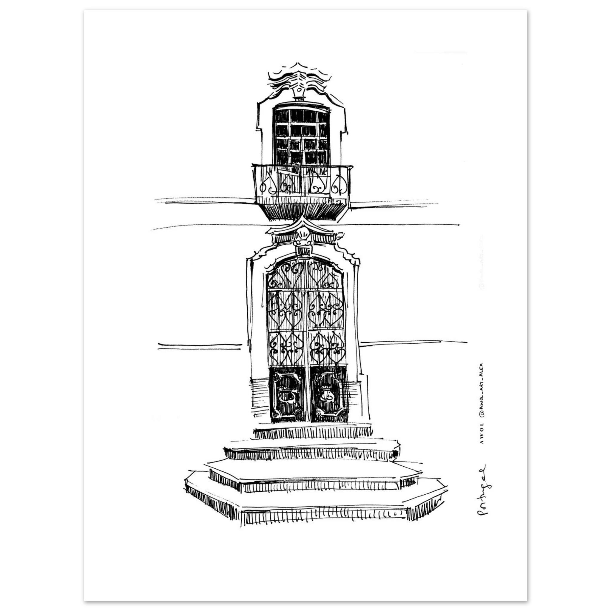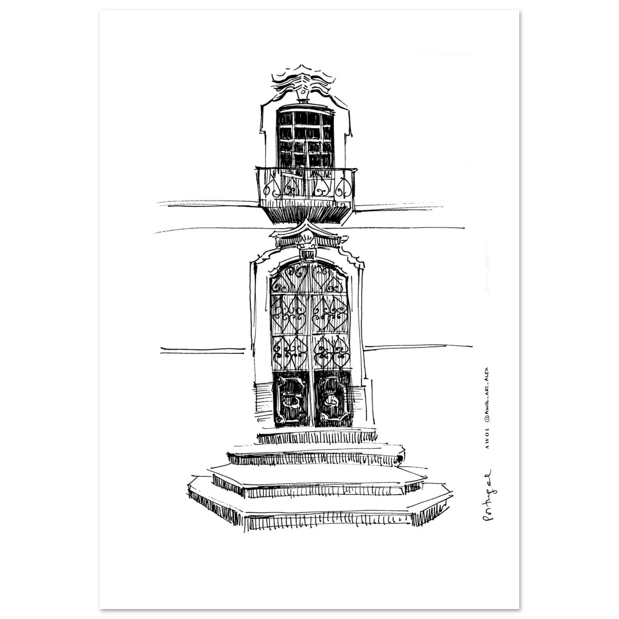 This black and white Portugal wall art print brings the beauty of traditional Portuguese architecture into your home through an intricate architectural drawing, inspired by Portugal’s historic buildings. This monochrome Portugal poster print features a hand drawn, sketchy illustration showcasing a detailed doorway, ornate window with a small balcony and classic architectural elements that reflect the charm of Portugal, from Lisbon, Porto, and Sintra to the Douro Valley and the Algarve. Each detailed line captures the character and craftsmanship of city art, making it a perfect addition to any wall decor. Ideal for architecture lovers and travellers, this Portugal poster print adds a timeless and elegant touch to any home decor. Whether displayed as framed wall art or a standalone print, it complements both modern and classic interiors. A unique travel souvenir or thoughtful gift for Portugal lovers, this city art print brings the charm of Portugal’s pretty streets to your wall décor, celebrating the beauty of its architectural heritage with every glance.