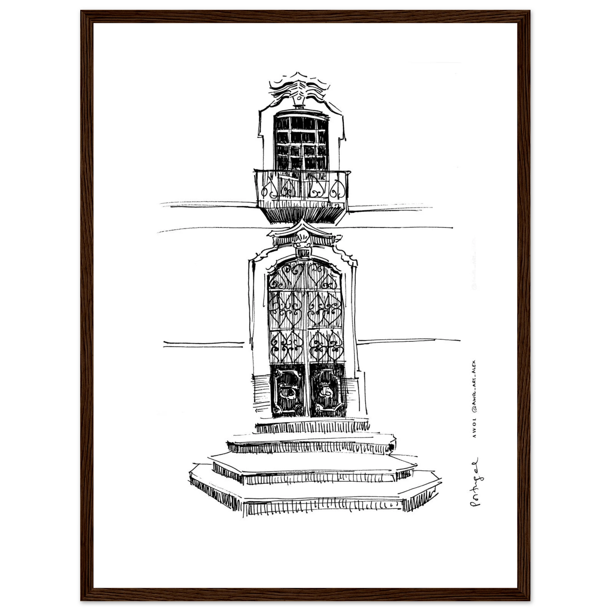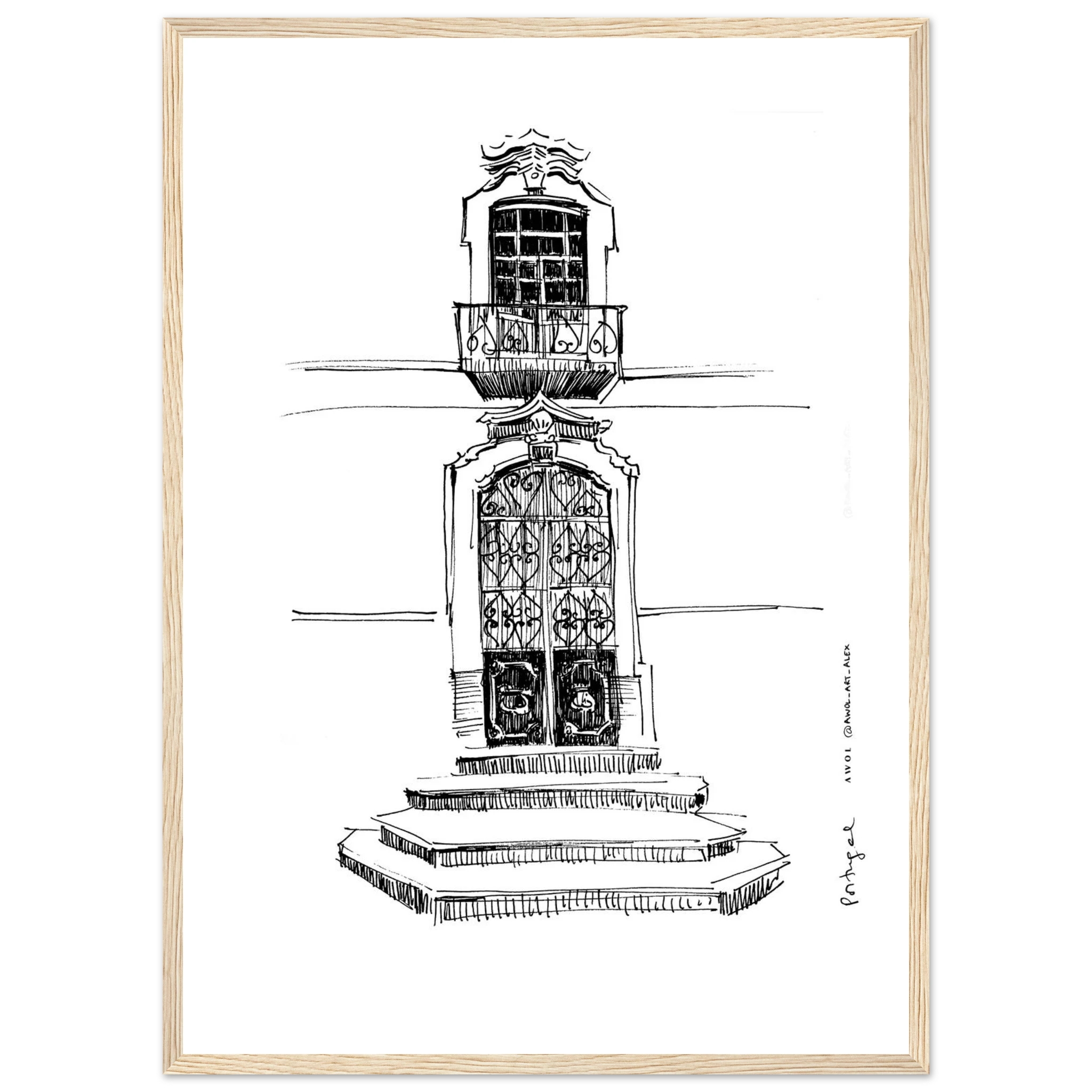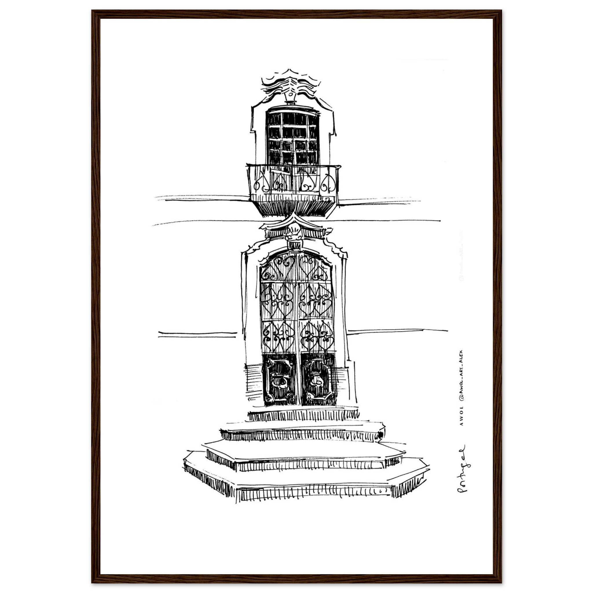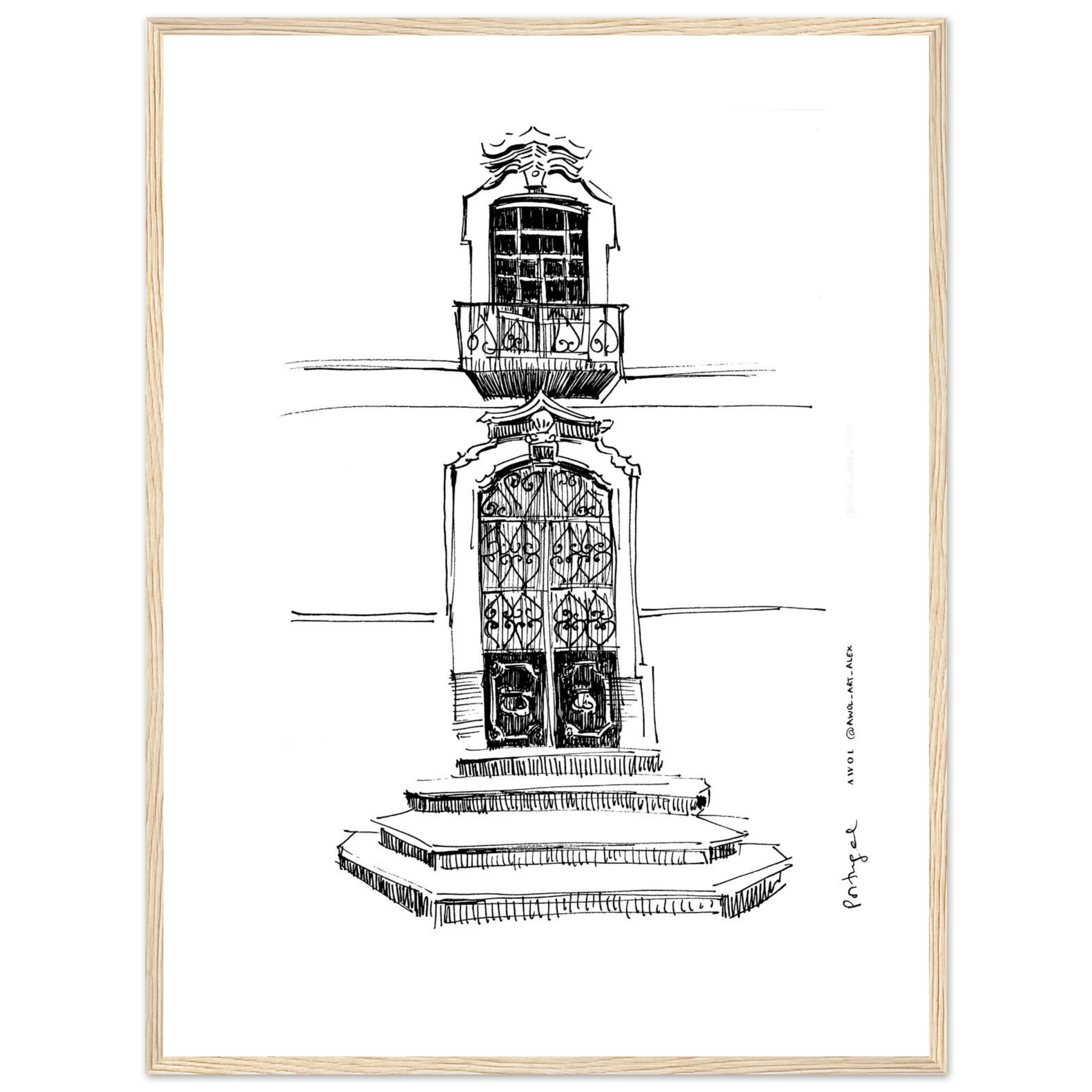 Bring the charm of traditional Portuguese architecture to your wall decor with this detailed monochrome architectural drawing, inspired by Portugal’s historic towns, streets and architecture. This black and white framed wall art print captures the intricate design of a classic doorway, ornate window, and stone steps, reflecting the character of Portugese architecture from Lisbon, Porto, and the Algarve. The intricate line drawing showcases the craftsmanship and timeless appeal of Portugese design in a city art print that makes a unique art statement to any wall decor. Ideal for Portugal lovers, travelers, and architecture lovers, this Portugal framed poster adds a sophisticated European touch to any home decor. This framed wall art print enhances both modern and classic interiors. A meaningful Portugal travel souvenir or thoughtful gift, this Portugal city poster, with its wooden frame, brings the charm of Portugal’s picturesque streets and its rich architectural heritage into your home at a single glance.