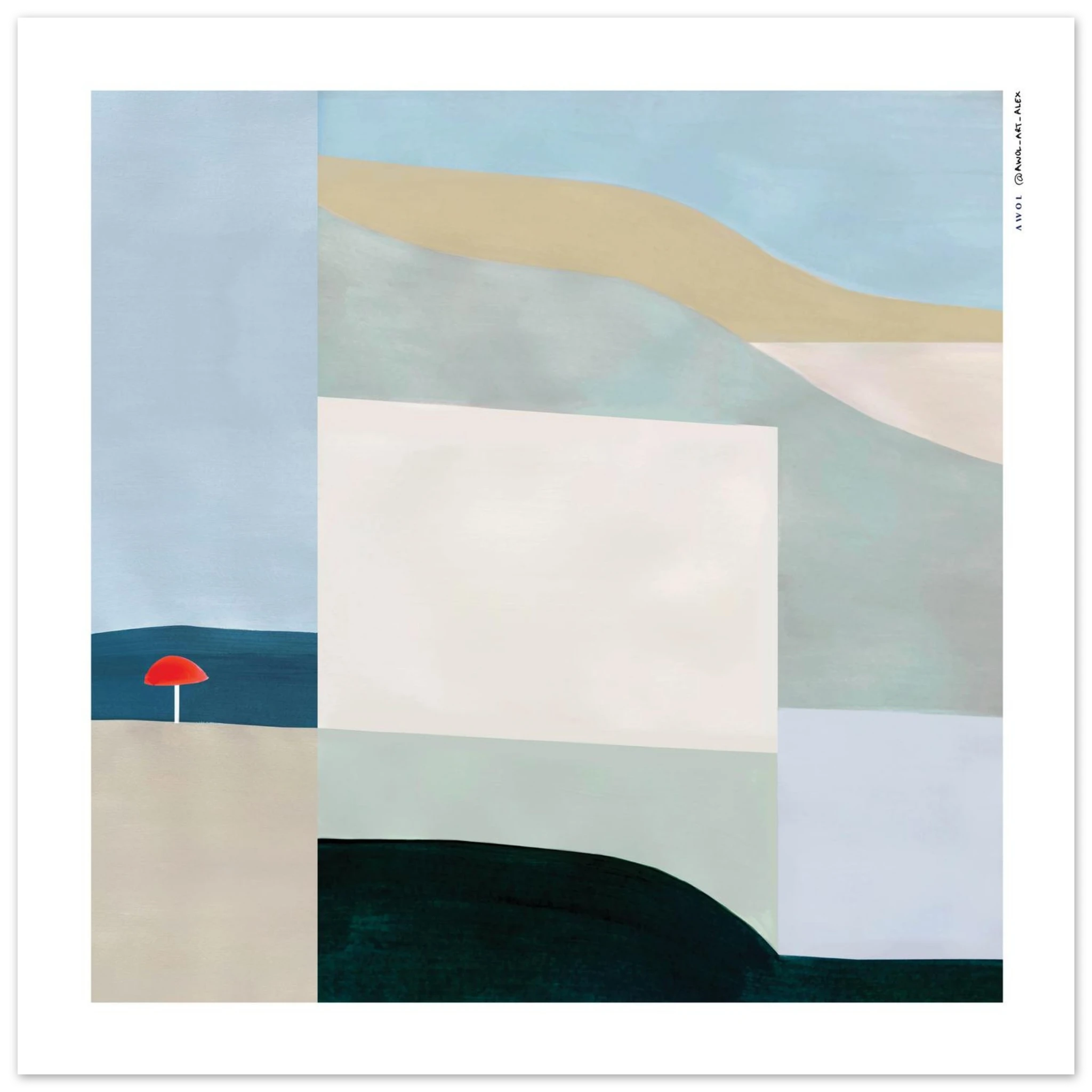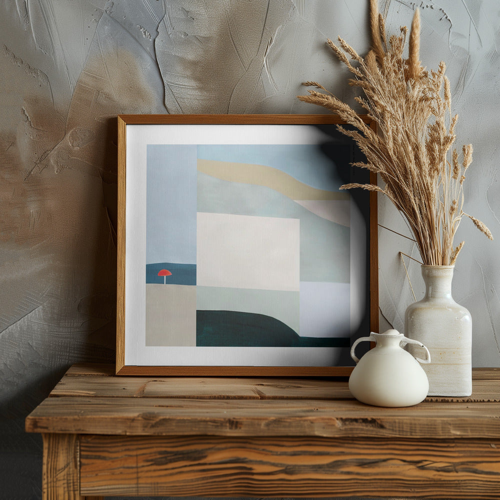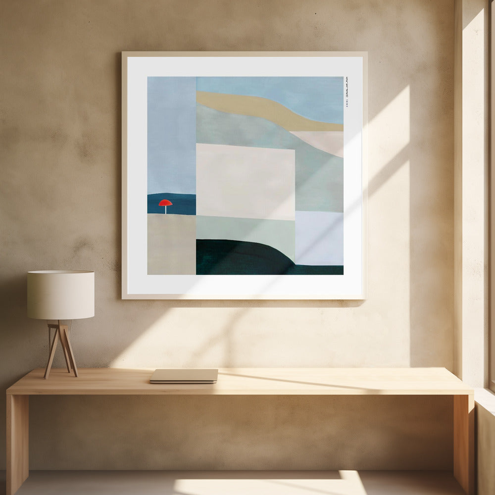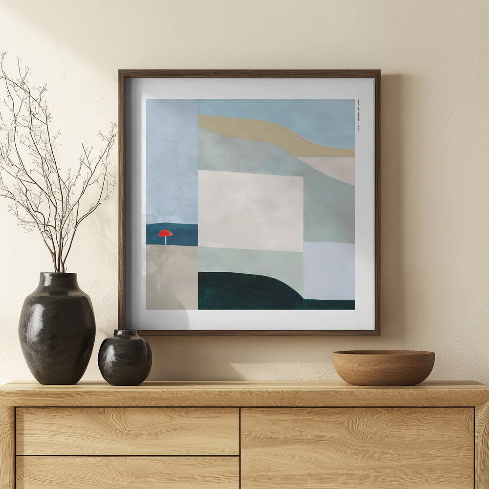 Dive into the playful calm of a Montreal summer with this minimalist fine art print, part of my abstract landscape series that celebrates the rhythm and tranquility found along the waterfront of one of Canada’s most dynamic cities (and my favourite urban playground). Drawing inspiration from the Lachine Canal’s waterfront, the early morning peace of yoga in public parks, and the laid-back charm of Old Montreal’s beach overlooking the St. Lawrence River, this abstract, minimalist fine art poster captures the zen-like essence of a city transformed by sunlight, water, and outdoor activity in the summer months. Whether it’s paddle boarding at golden hour or gliding along riverside paths, this abstract wall art print distills the fleeting joy of Quebec’s summer into a bold yet meditative geometric abstraction made of soothing hues and earth tones: pastel blues, beige and olive green, anchored and balanced out by rich black and teal blue colour blocking. A vibrant red sun umbrella adds a pop of colour, contrasting playfully with the earthy palette —hinting at parks, green spaces, and flowing water in a contemporary art print that blurs the line between emotion and form. The abstract, organic shapes convey both movement and stillness. Offered as a high-quality poster print, this urban abstract landscape wall art brings a modern Canadian art infusion to your home decor, office, or creative space—inviting you to relive your tranquil summer days, all year round.