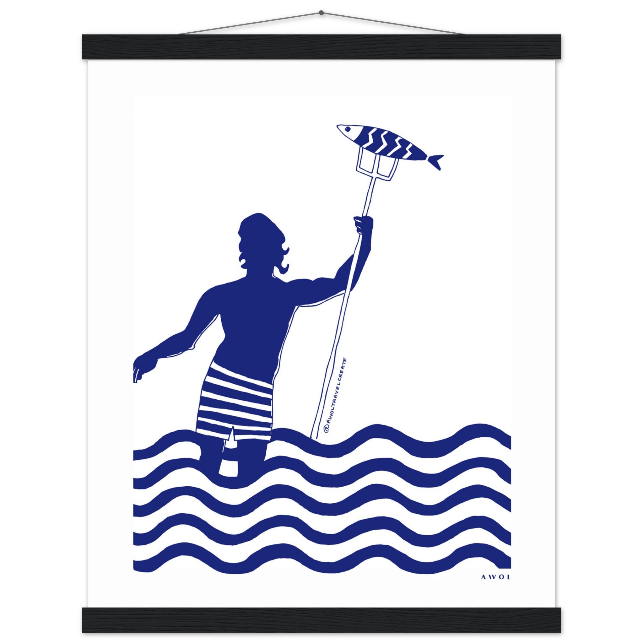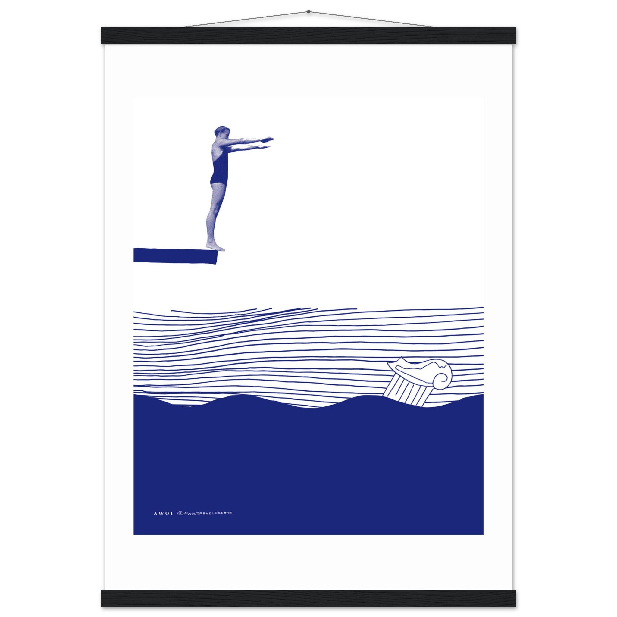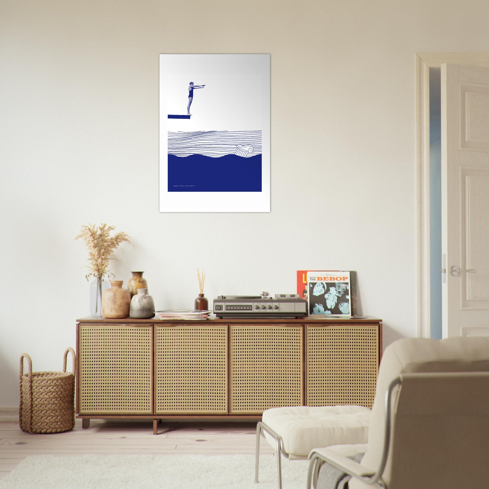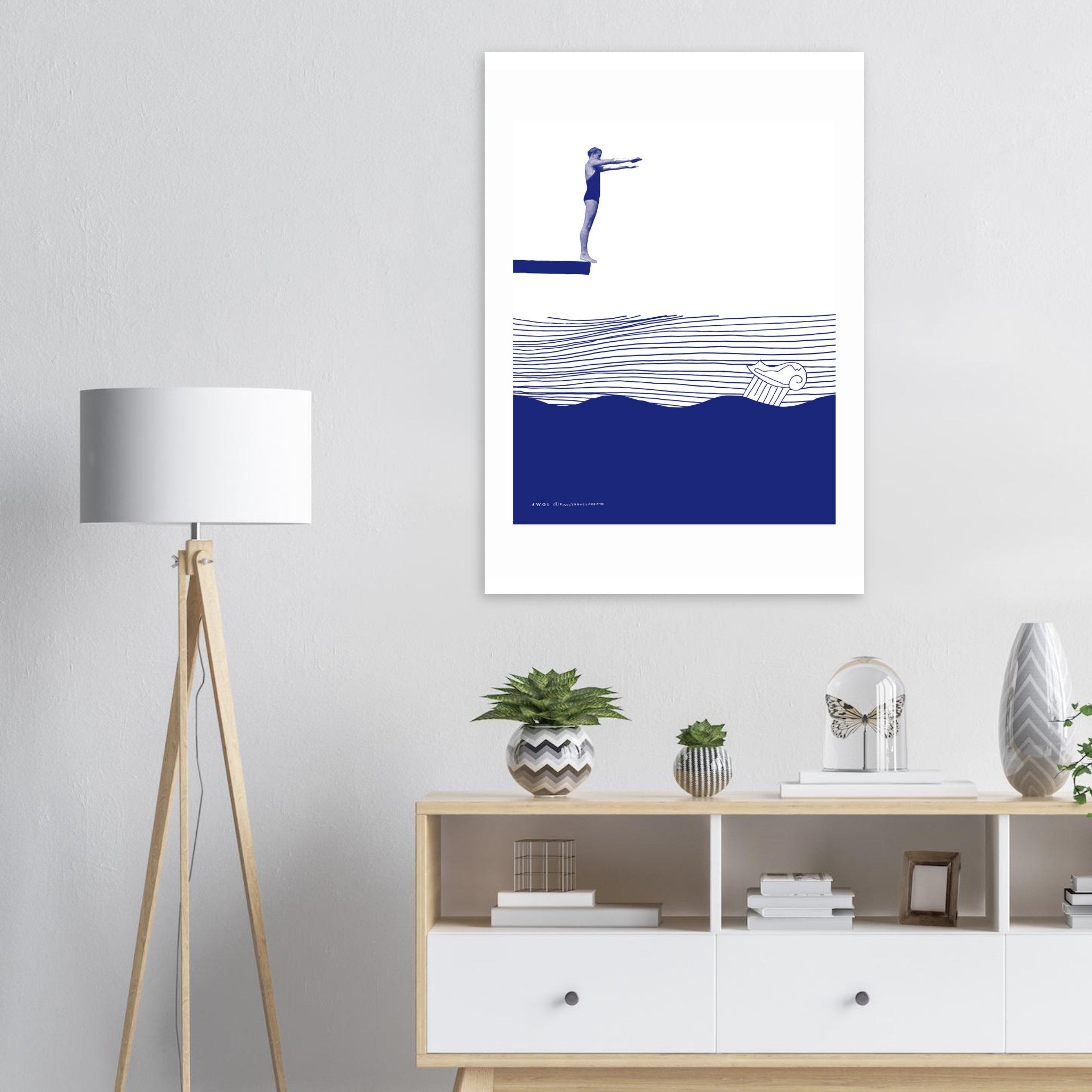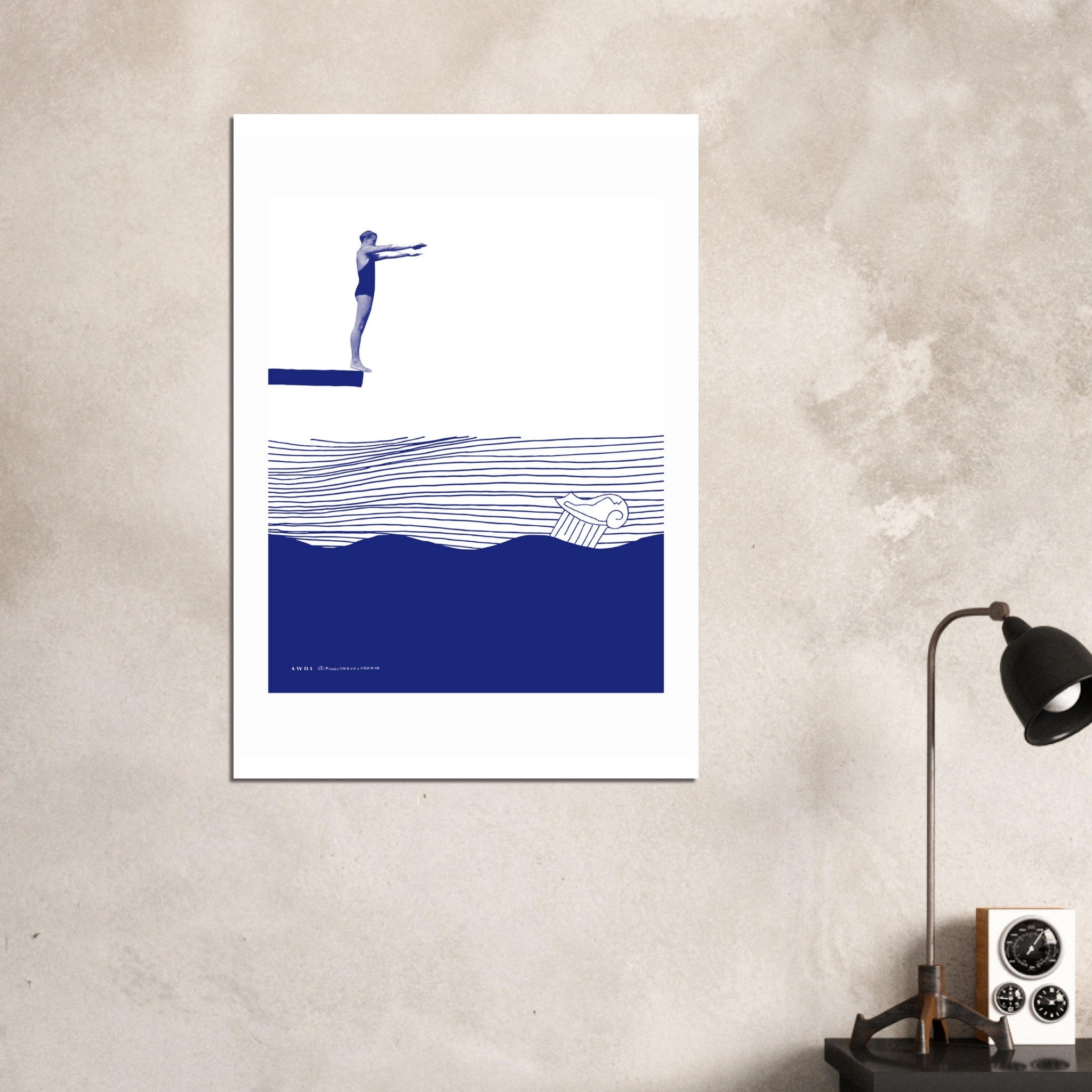This aluminum art print is a Mediterranean wall art work depicting a woman diving into a blue sea. Ancient Greek and Roman ruins float lazily in the abstract, graphic waves. This modern travel print was inspired by Mediterranean beach destinations, beautiful islands and relaxing vacations by the sea, filled with sunshine and happy vibes. This collage artwork is a mix of photography and illustration, and a minimalist blue art print on aluminum, making a nod to ancient history in a contemporary style juxtaposed with the vintage aesthetic. This Mediterranean poster print brings vacation vibes to any bedroom, kitchen, living room or hallway, fitting well in any home decor or with art for your office, while also making a cool gift for travel lovers. The aluminum print support adds a sleek, crisp and sophisticated quality to this modern art print, enhancing the colours and elevating the contemporary art style to the next level.