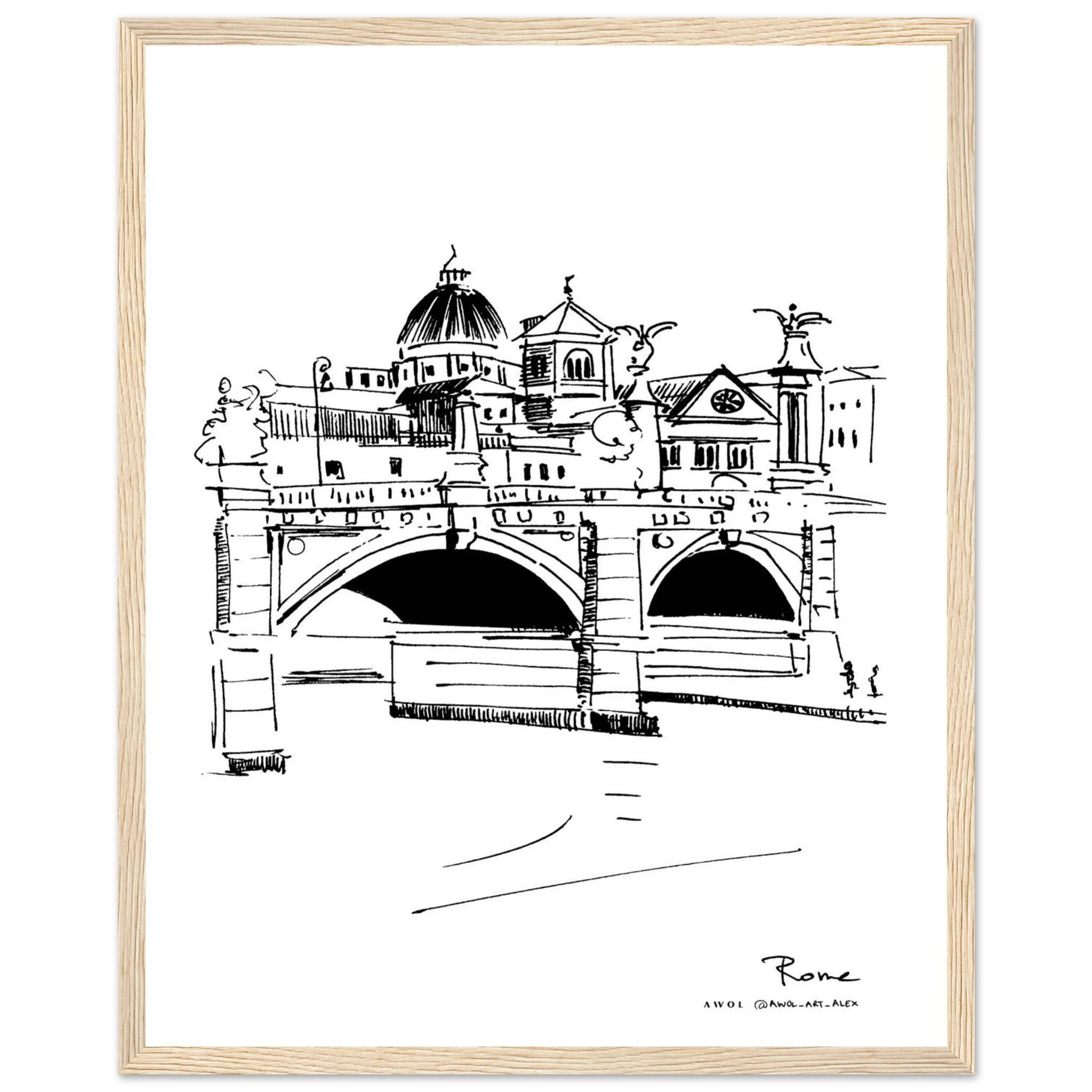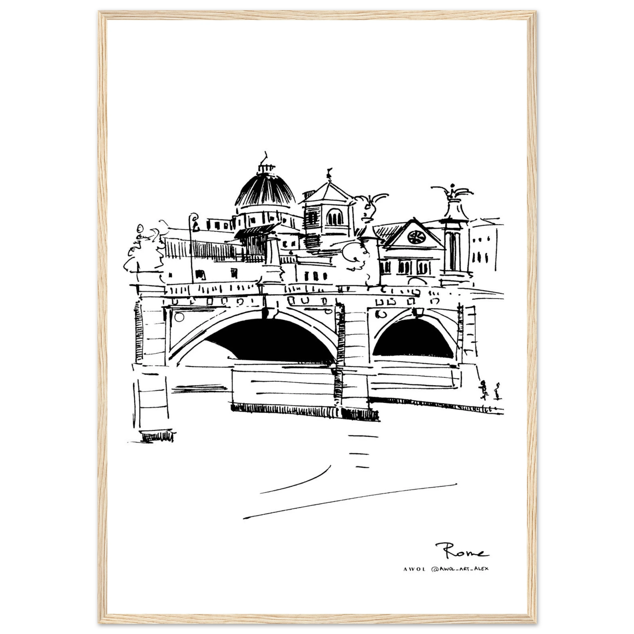 Bring your Italy travels home with this framed Rome wall art print, featuring a hand-drawn black and white sketch of one of Rome’s iconic bridges and historic architecture. Created on location during my travels, this framed Italy travel poster captures the energy, movement, and timeless beauty of the Eternal City in expressive ink lines. The result is a striking piece of city art—modern, raw, and effortlessly refined—perfect for travel lovers, architecture enthusiasts, and stylish interiors. This framed artwork is printed using museum-grade 12-color giclée technology on smooth, FSC-certified 200 gsm matte paper for vivid clarity and depth. Each print is mounted in a handcrafted wooden frame, available in light wood, dark wood, black, or white, and delivered ready to hang. Whether you’re curating a gallery wall or looking for meaningful home decor, this framed fine art print brings a piece of Rome’s soul into your space—no passport required.