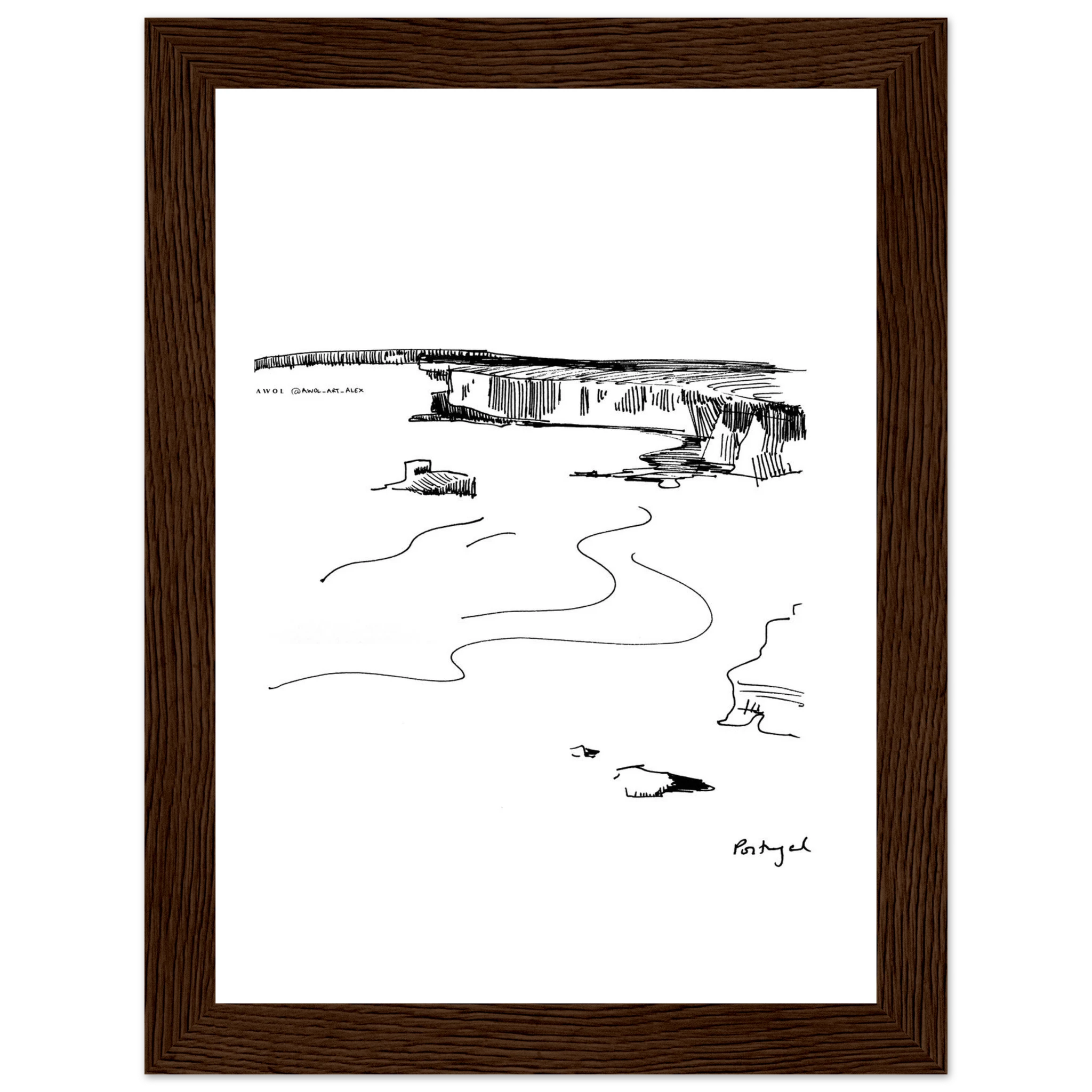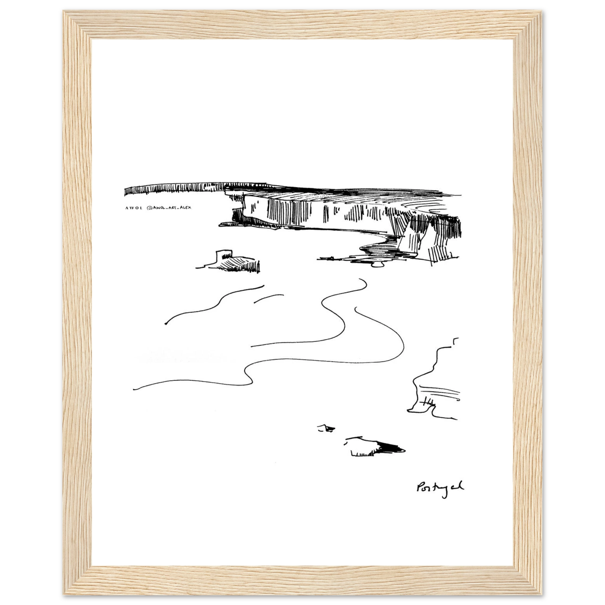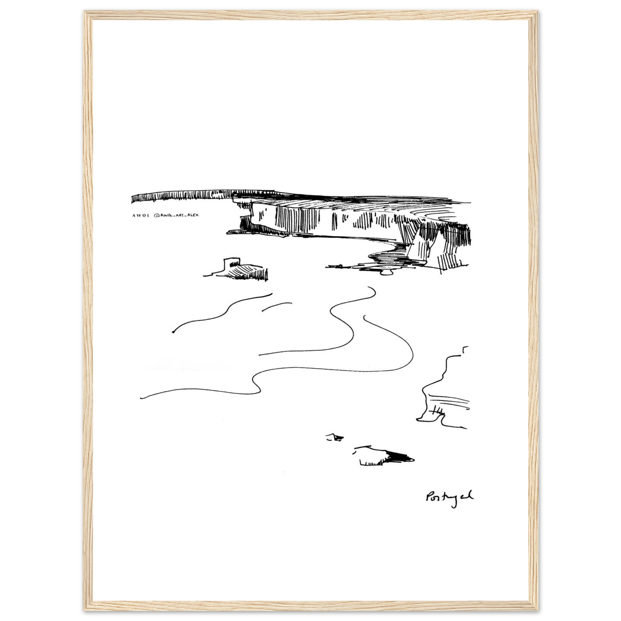 This black and white, Portugal wall art print captures the natural landscapes of Algarve, Portugal’s coastlines with a minimalist art style through a sketchy line drawing. This contemporary Portugal poster print was inspired by travel to Portugal’s Atlantic Ocean coastline, to a destination that was once thought to be the “end of the world”: Sagres. Had drawn with expressive, fluid organic lines, this modern Portugal framed art print perfectly conveys the untamed power and natural beauty of Portugese coastal landscapes. The cliffs overlooking this surfer’s paradise seascape, the waves of the Atlantic Ocean, and the ever-present winds that shape the environment, evoke the spirit of the ocean, wind, and surf: nature at its best. Ideal for any type of wall decor, whether contemporary or classic, this fine art travel print with a wooden frame brings the beauty of Portugal to Europe lovers, or people seeking a unique Portugese travel souvenir. A unique gift for surfers, nature lovers, travellers or people who love history of navigation. Many Portugese sailing and exploration expeditions started here. This modern Portugal poster print adds a touch of sophistication, zen and wanderlust to your home decor, making it the perfect addition to any living room wall decor, bedroom, office or hallway. This black-and-white design travel sketch brings to life the rugged cliffs and crashing waves of the Atlantic, offering a serene yet dynamic expression of the powerful forces of nature. With its minimalist style and attention to detail, this fine art print captures the essence of Portugal’s beautiful coastline destinations.