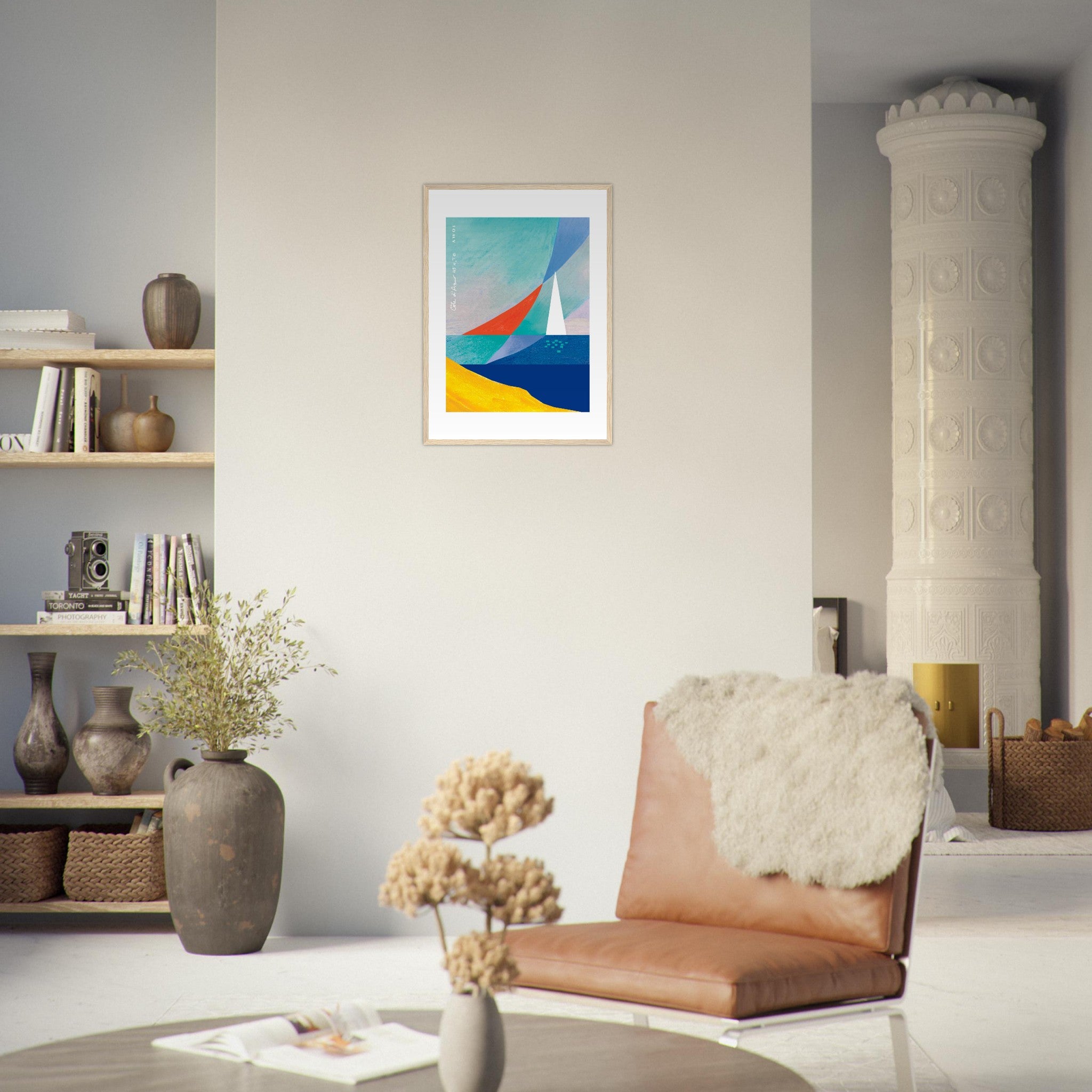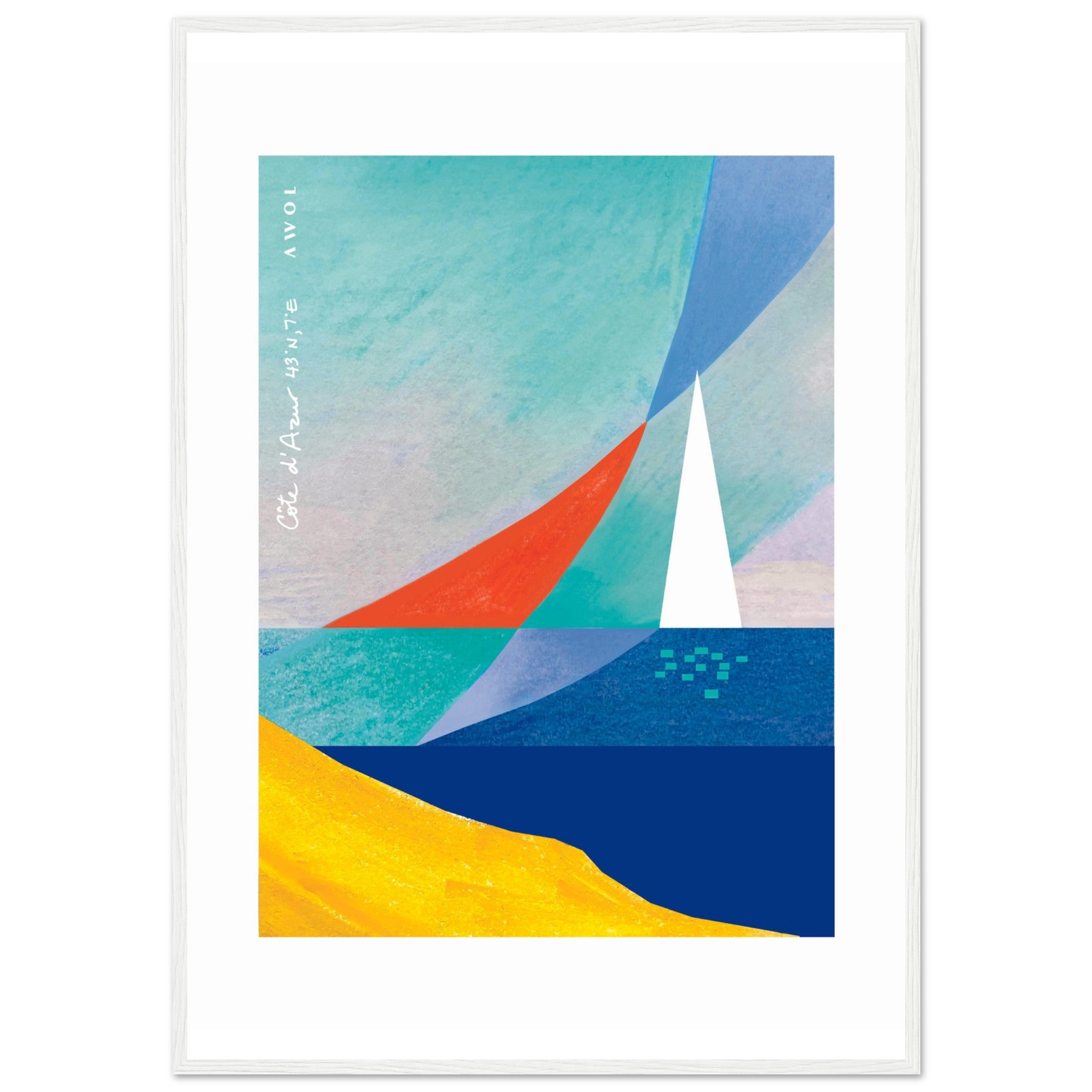 This colourful nautical wall art print with a wooden frame is a modern abstract beach art print with a white sailboat, simple graphic shapes and a geometric pattern of azure, turquoise and bright blue hues inspired by seaside landscapes of the beautiful Côte d’Azur. A simple white sailboat gracefully navigates a blue Mediterranean sea abstraction, sailing along the coastline of the French Riviera. This wall painting has a vibrant colour accent of orange representing waves in the wind, and a bright yellow colour pop: a sandy beach abstraction. This travel print is a minimalist landscape artwork inspired by sailing and travel to this beautiful European destination in the South of France: from St-Tropez, Cannes, Antibes, Nice, Villefranche Sur Mer, to Monaco and Menton, one of the most beautiful travel regions in the world. This nautical framed wall art print evokes the seaside, summer days, beach vacations, relaxation, and sailing bliss in a modern France travel art print with bright colours. The radiant sunlight bathes the scene in a warm glow, transporting you to the sunny beaches of France in a contemporary large abstract wall art that is ready to hang for your living room, bedroom, home decor or office decor.