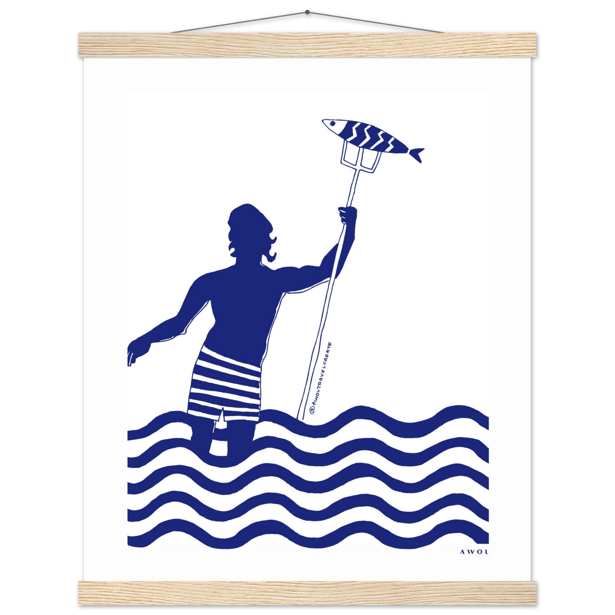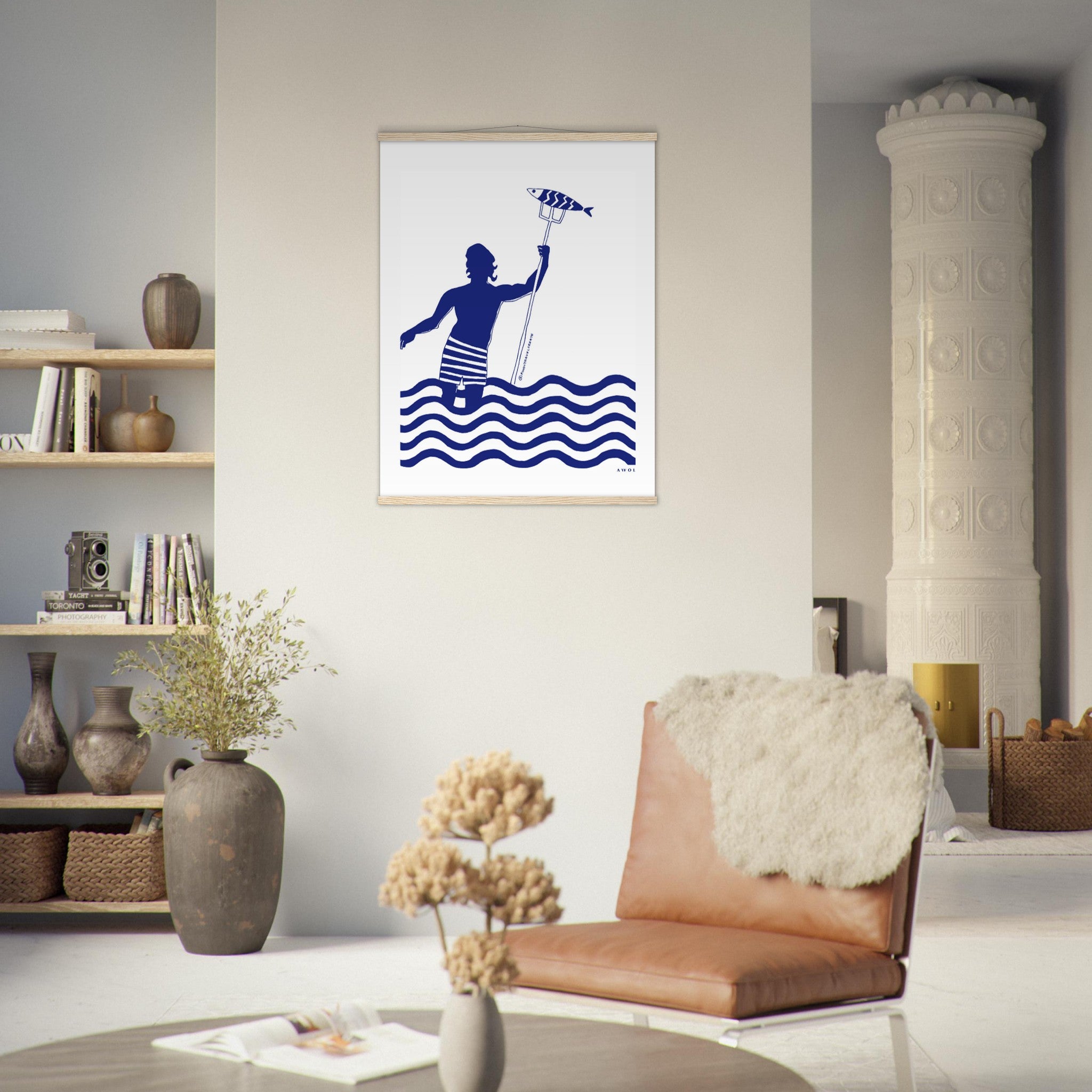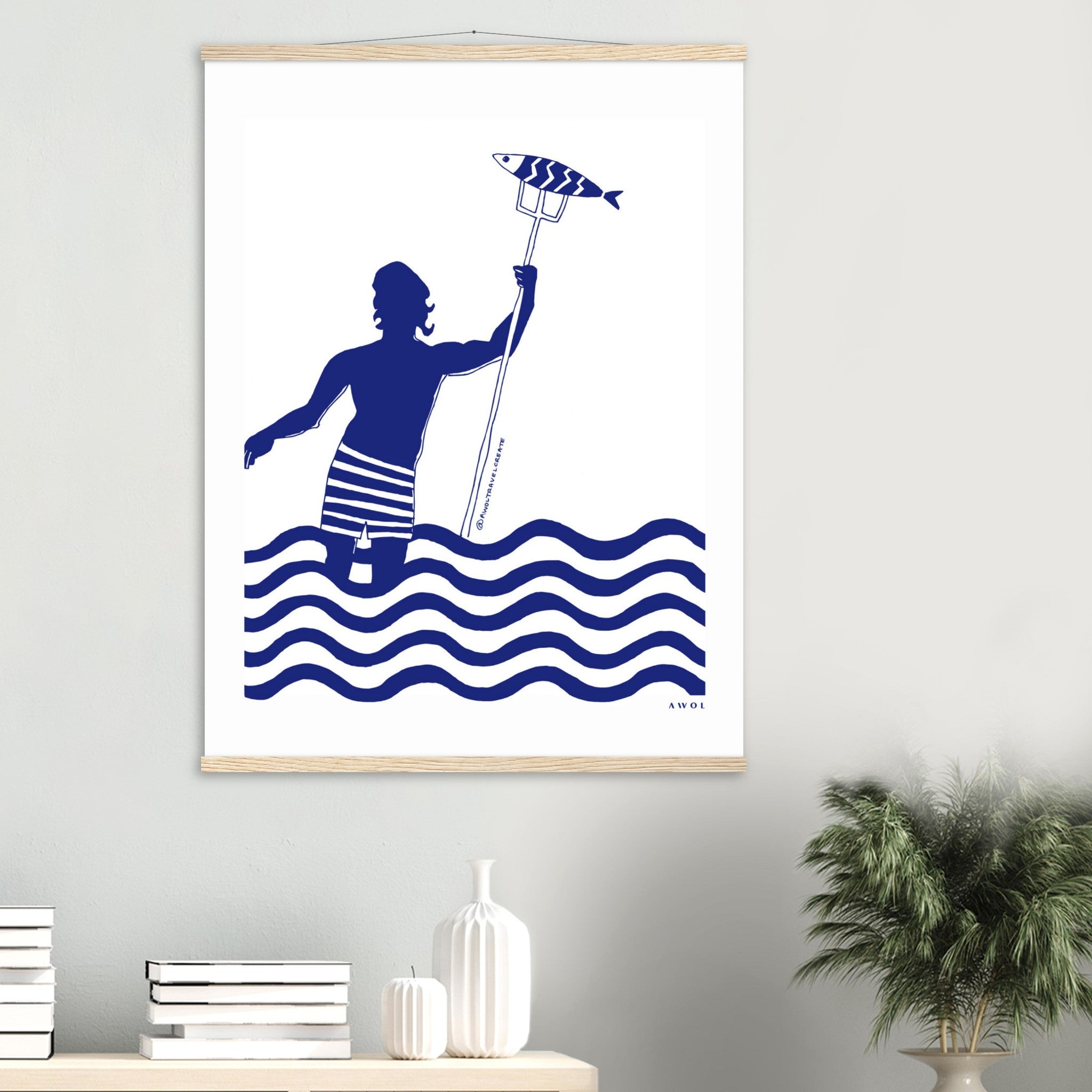 This blue and white minimalist wall art is a blue accent home decor print adding modern Mediterranean style to any room needing a dose of travel art and happy, sunny vacation vibes. In this poster print with wooden hanger, a handsome young man emerges after swimming in an abstract blue, graphic sea, wearing a striped swimsuit and proudly displaying his prized catch of the day – a fish he caught on a spear. This beach wall art print features a modern twist on the mythological ancient Greek god Poseidon. Rendered in a bold, abstract art style made of blue graphic patterns, this contemporary artwork captures the essence of Greece landscapes and history, Mediterranean destinations and beachside living, while bringing a monochrome wall art style to people seeking Mediterranean decor. This modern travel poster adds a fun and relaxing beach aesthetic to your living room, bedroom, or office space, serving as a strong focal point that transports you to the sun-drenched shores and beautiful coastal destinations of southern Europe.