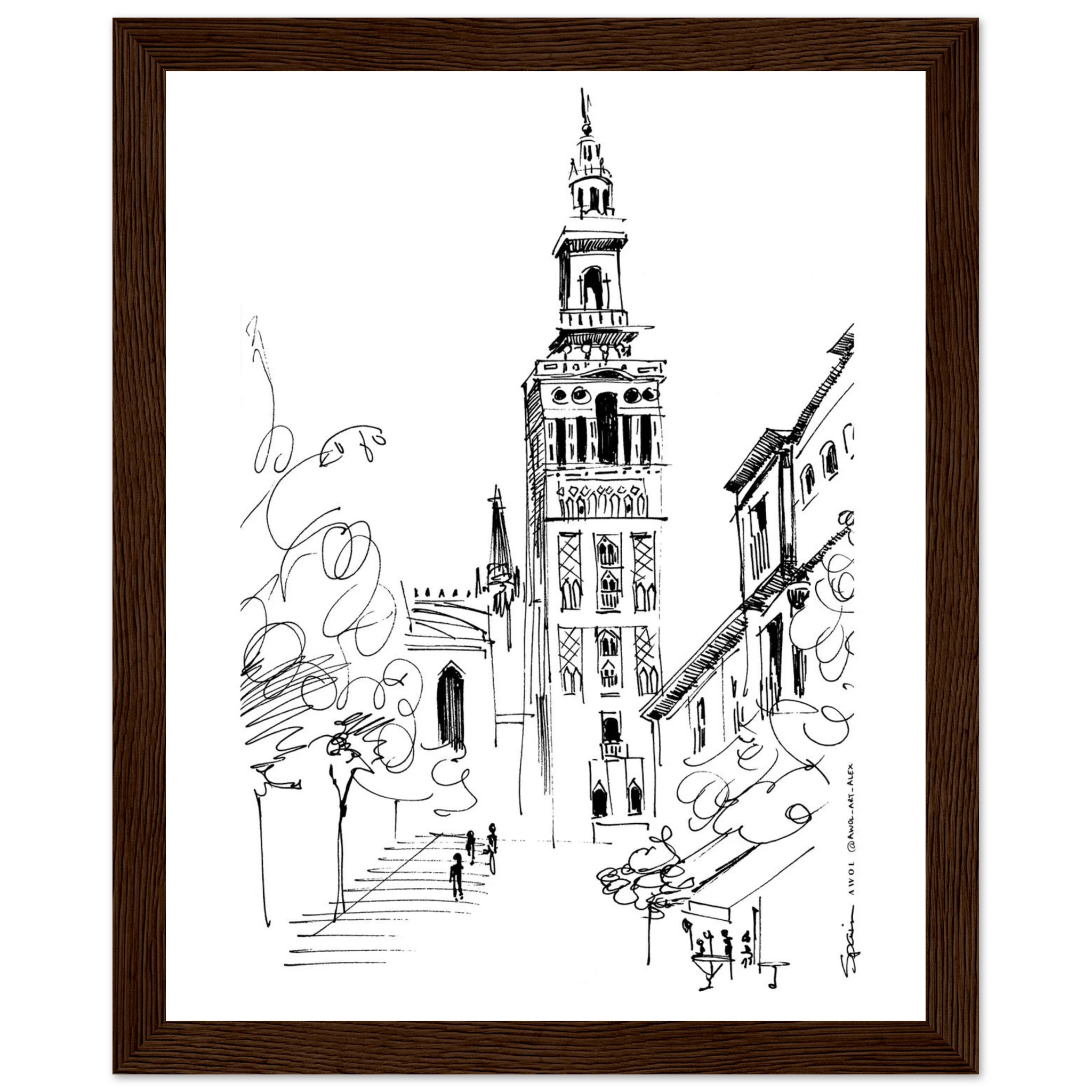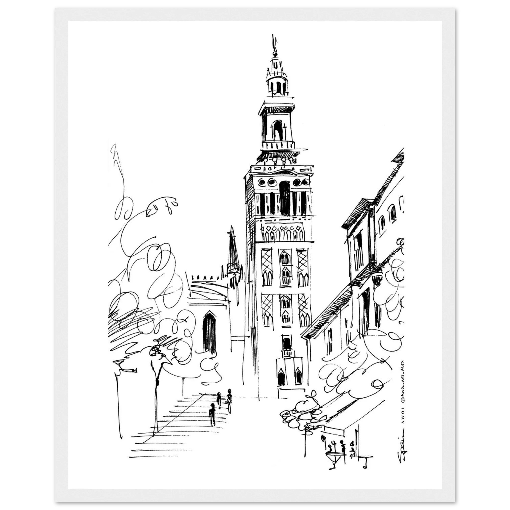 Add the unique romantic vibe of Andalucia, Spain, to your wall decor with this Seville inspired framed art print—a black and white travel illustration that captures the allure of southern Spain’s most famous city. Featuring a dynamic illustration with sketchy yet intricate graphic lines, this modern travel art print highlights the historic bell tower of La Giralda Cathedral, one of Seville’s most iconic landmarks. The monochrome artwork brings the vibrant energy of Andalusian streets to life, depicting bustling cafés, shops, boutiques, people, and mature trees, making it an ideal addition to any Spain-inspired wall decor collection. Crafted in a graphic, sketchy drawing style, this city art print celebrates Seville’s rich history, architecture, and cultural heritage, while perfectly complementing modern, minimalist, and classic interiors. Whether you’re passionate about European travel, architecture, Spanish culture, or urban art, this Seville wall art print adds a timeless touch of Spain to your interior decor. A perfect art gift for travel enthusiasts, this monochrome Spain street scene makes a unique vacation souvenir or accent art for any space – and it’s ready to hang.