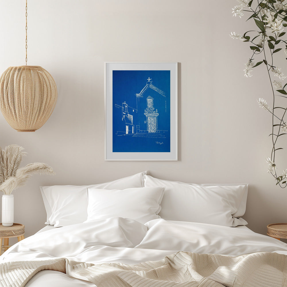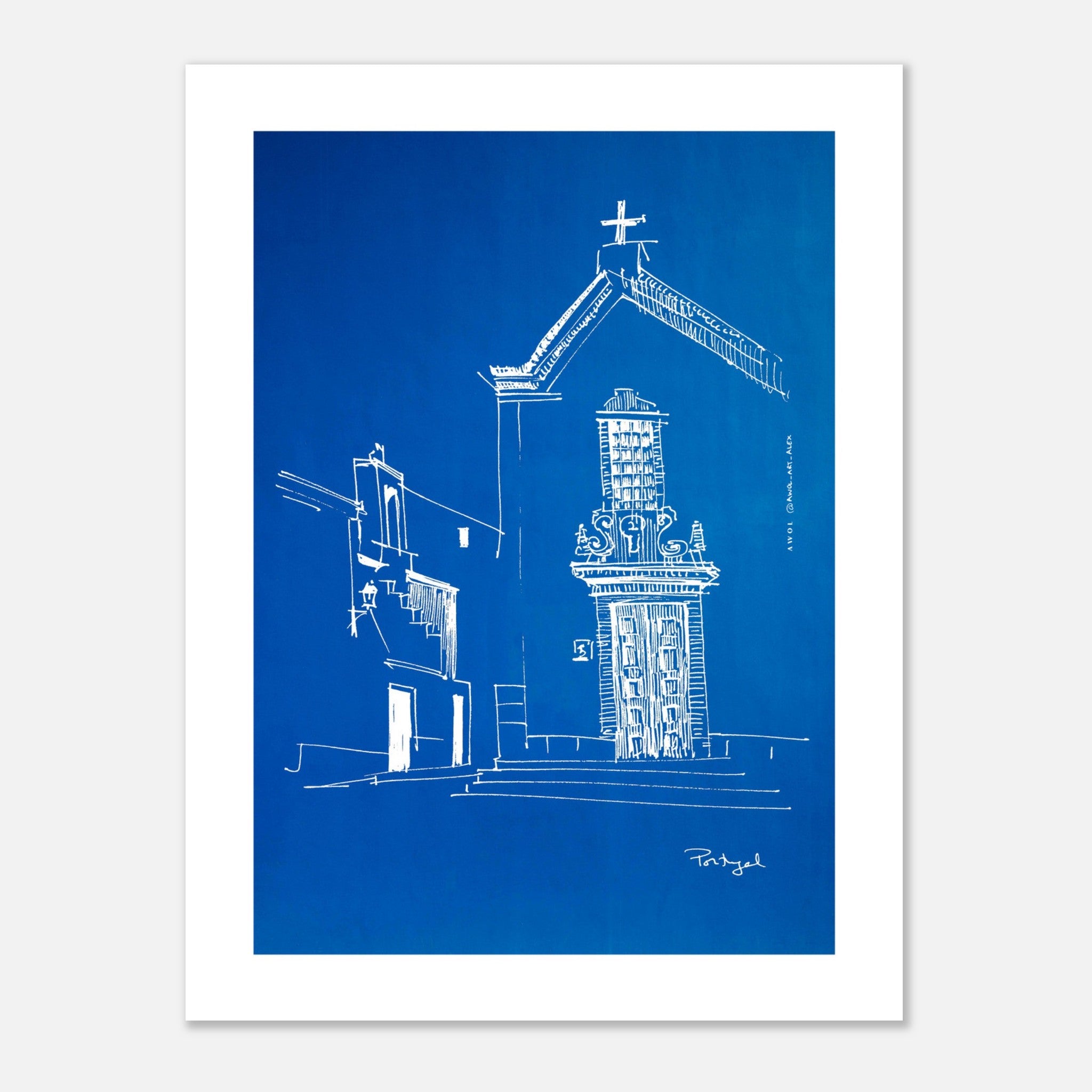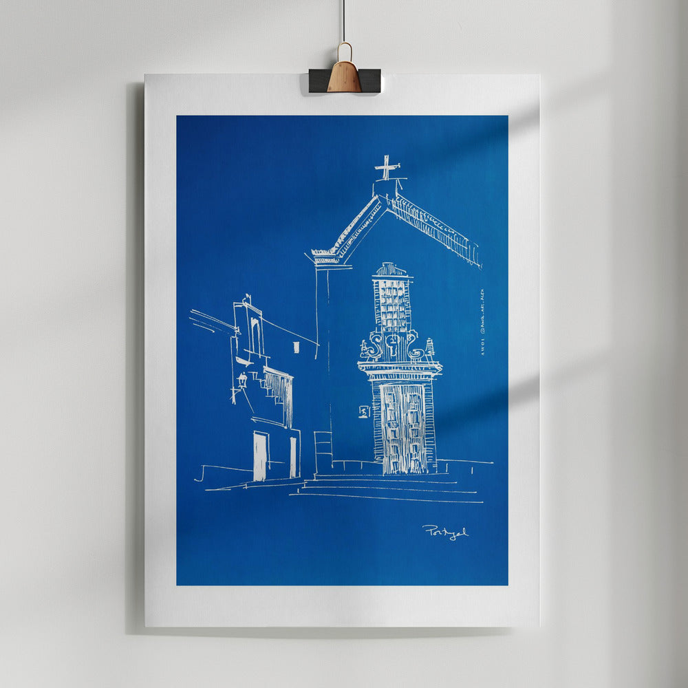 This blue and white Portugese fine art poster is a wall art print capturing the charm of Portugal through a detailed yet sketchy drawing style, depicting the essence of a typical small Portuguese town square. Set against a hand painted blue background, the white line drawing showcases the quaint beauty and buildings of a small coastal town, surrounded by the Atlantic ocean and blue skies. This Portugal seaside travel artwork blends a modern minimalistic art style with timeless architectural details. Inspired by my travels from the northern city of Porto to Lisbon, central Portugal and following the coastline to the South in the Algarve region, this Portugal travel poster evokes the warm, inviting spirit of its coastal towns. A perfect gift for Portugal lovers, and a wall decor keepsake merging travel, art, architecture and Portugese culture, adding a touch of Portuguese blues to your home decor.