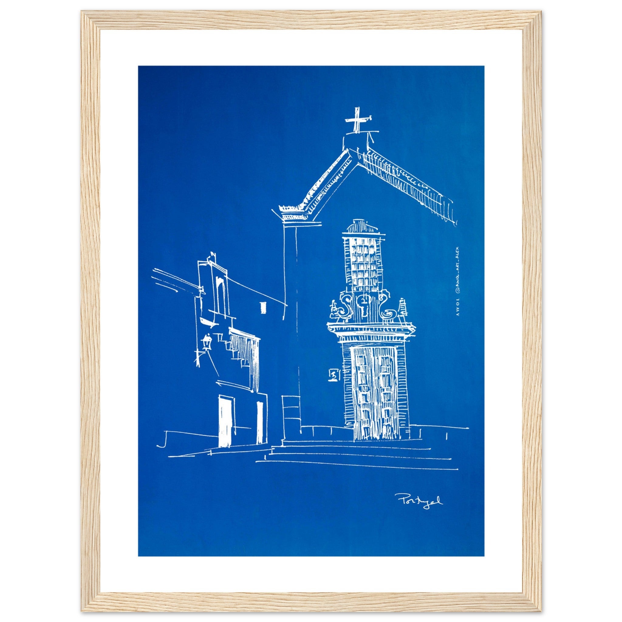 This blue and white Portugal framed wall art print captures the charm of a Portugese travel moment with a detailed yet sketchy architectural drawing style, portraying the essence of a typical small Portuguese town by the seaside. Set against a hand-painted blue background, the white Portugal illustration highlights the quaint beauty a Portugese fishing port, surrounded by the Atlantic Ocean and expansive blue skies. Blending a modern minimalistic art style with architectural details of typical Portugese building facades, doors and windows, this Portugal travel art print is inspired by my travels and along the coastlines, rivers and sleepy towns in southern Portugal. This Portugal travel poster evokes the warm, inviting spirit of European coastal towns—an ideal gift for Portugal lovers, Europe travel lovers, and a stunning wall decor piece that combines travel, art, architecture, and a touch of Portuguese blues to your home.