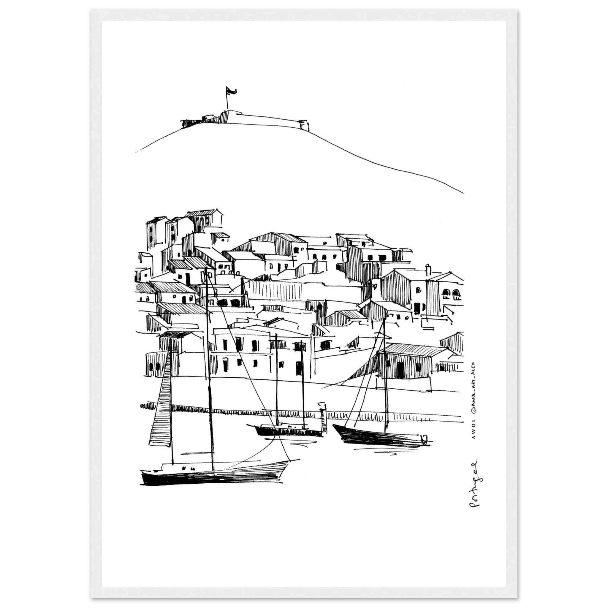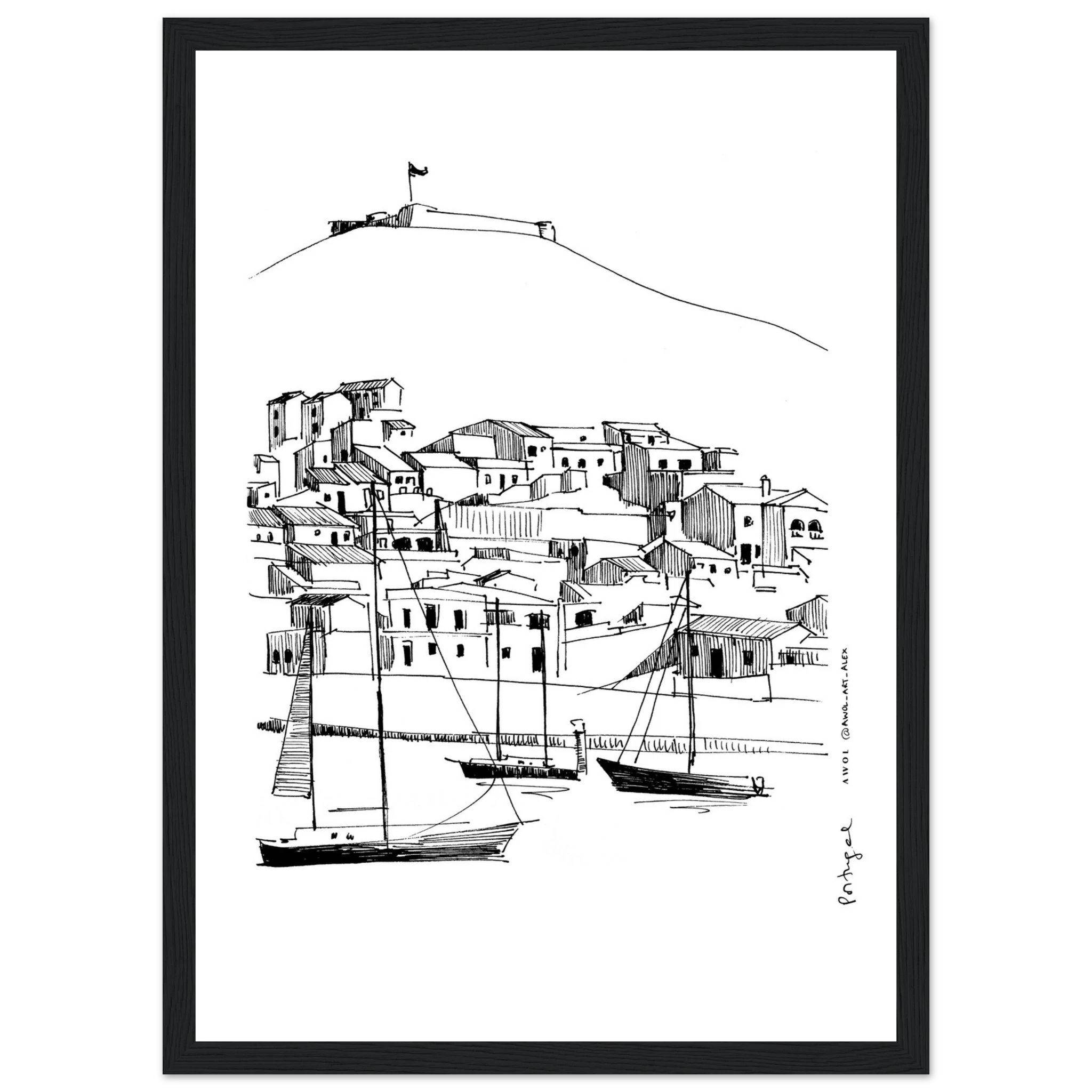This black and white Portugal travel art print captures the charm of Alcoutim, a picturesque riverside village, in a minimalist fine art wooden framed print. A detailed yet expressive sketch showcases the town’s white houses, historic fortress, and sailboats moored along the tranquil Guadiana River, overlooking a Spanish town across the shore in Andalucia. The sketchy yet detailed monochrome drawing highlights the town’s charm, from its rugged natural surroundings to the storied waters where a 1371 peace treaty was signed. Encased in a high-quality wooden frame, this artwork brings Portugal’s rich history and serene beauty into your wall decor. Alcoutim’s authenticity shines through its winding cobblestone streets, vibrant gardens, traditional blue tile murals, and citrus-scented breezes. This framed fine art Portugal poster invites you to experience its unspoiled charm—a place where time slows down, locals savour rich home-cooked meals like the legendary Cossido, and the riverfront offers serene views. Printed using premium giclée technology, this artwork delivers crisp details and rich contrasts, while the natural wooden frame adds warmth and sophistication, making it a timeless addition to any art collection.