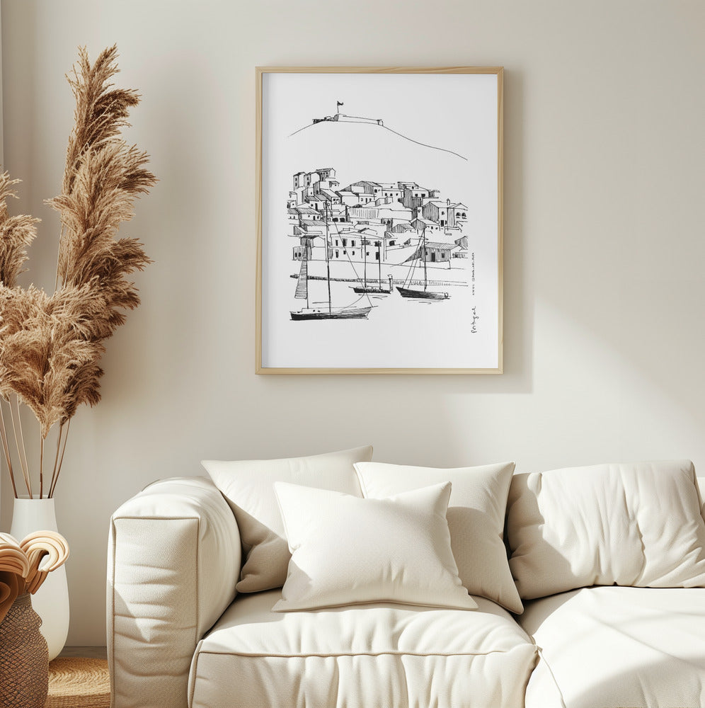 This black and white Portugal artwork captures the charm of a small town with sailboats, in a minimalist monochrome fine art print. A detailed yet expressive sketch of a picturesque Portuguese port village, Alcoutim, nestled along the tranquil Guadiana River. This Portugal travel poster illustrates the town’s view of whitewashed houses and a historic fortress, perched on a hillside overlooking the water, with Spain’s own scenic village mirroring it from across the shore. The sketchy yet precise drawing brings out the town’s timeless character, from the sailboats bobbing in the river to the rugged natural surroundings. This Portugal wall art transports viewers to the serene yet storied borderland, where centuries of history have unfolded—including the 1371 peace treaty signed on a boat anchored in these very waters. Beyond its historical intrigue, Alcoutim is a hidden gem of authenticity, where winding cobblestone streets are lined with vibrant flowering gardens, traditional blue tile murals, and citrus-scented breezes from the nearby orange groves. This fine art print invites you to experience the Portugese town’s unspoiled beauty—a place where time slows down, locals savor rich, home-cooked meals like the legendary Cossido, and the only sounds are the soft lapping of the river and the occasional ferry crossing to Spain. Whether you’re a lover of Portugal, travel, history, or elegant landscape art, this artwork makes for a timeless and evocative addition to any art collection.