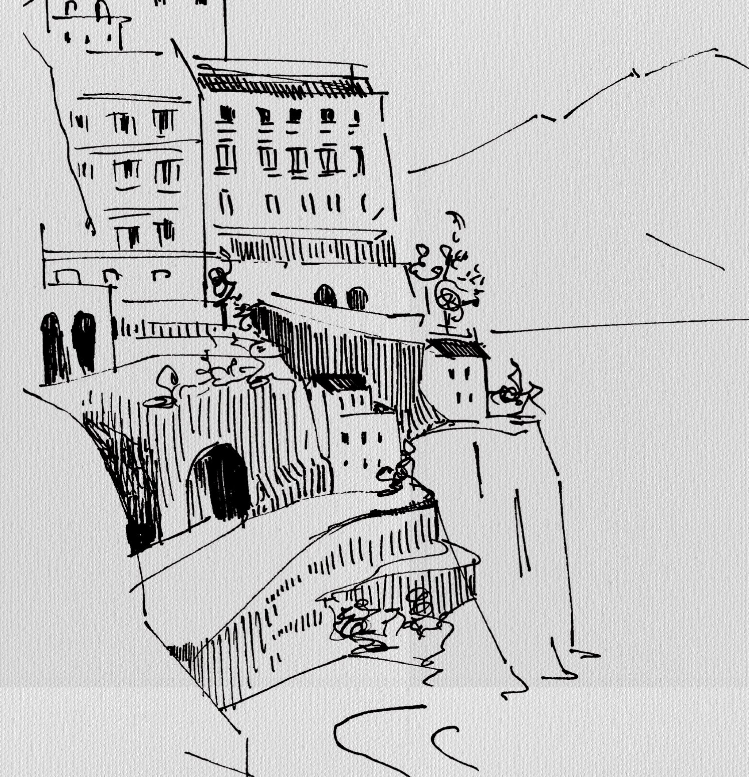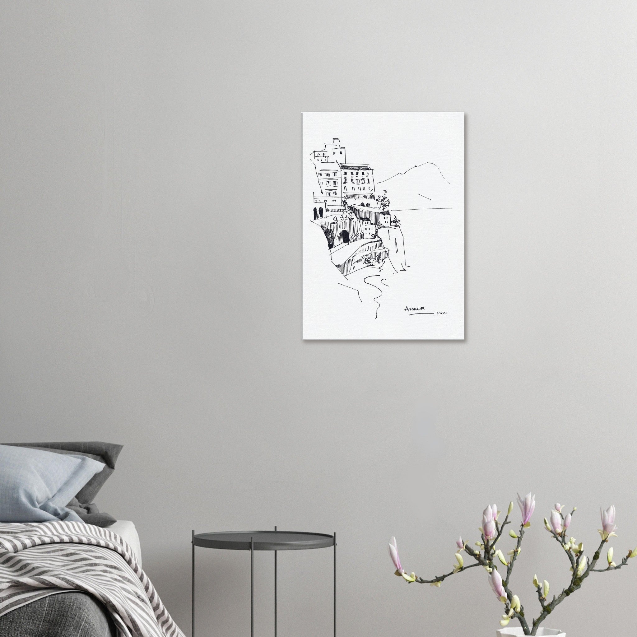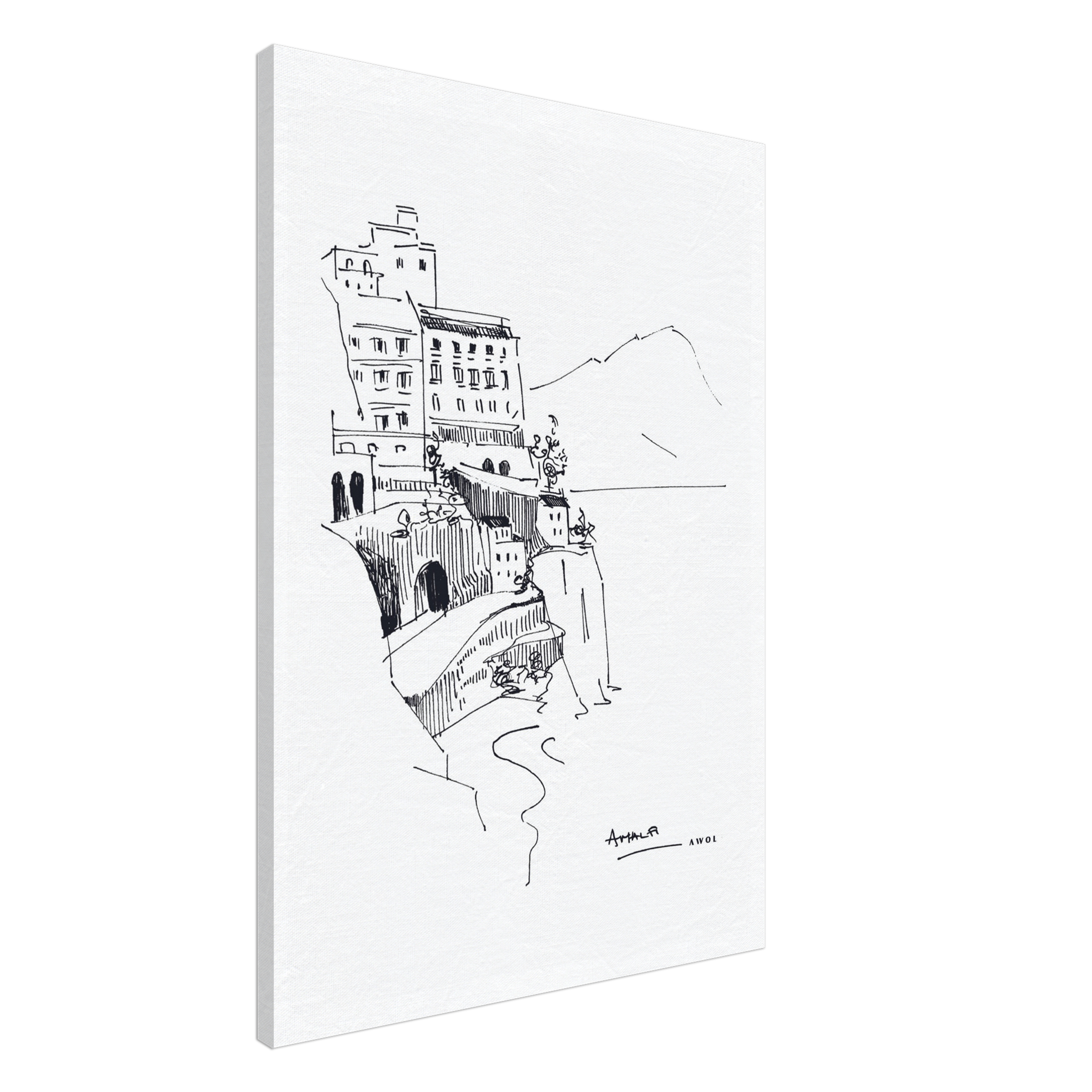 This monochrome canvas print of the Amalfi Coast in Italy transports you to the unparalleled beauty of this world-renowned Italian travel destination. This large canvas wall art is a detailed Italy landscape drawing capturing the luxurious villas and small Italian towns perched on the vertiginous coastal cliffs overlooking the iconic Italian seaside villages of Atrani, Amalfi, Sorrento, Ravello, Positano and Praiano, scattered along the Mediterranean sea, in one of the world’s most beautiful coastal landscapes. Hand-drawn in a sketchy yet intricate style, each graphic line in this monochrome wall art contributes to the rich tapestry of this iconic Italian scenery. This Italy travel art work is a visual journey to feed your wanderlust, inviting you to explore the picturesque charm of this iconic European destination, known for its incredible views and timeless beauty. Bring this postcard perfect Italian print on canvas to your home decor, and add a timeless yet modern travel art accent to your wall art collection.