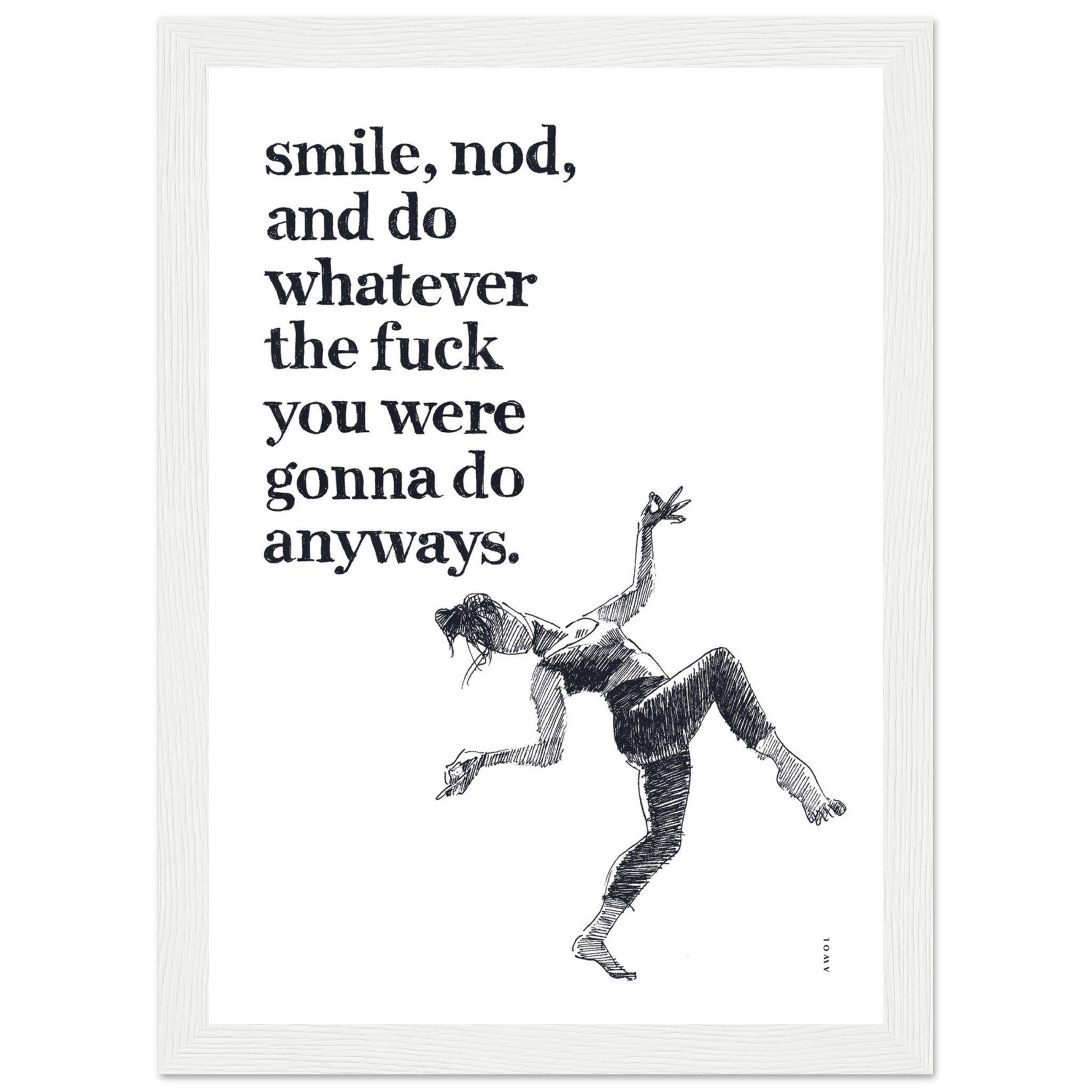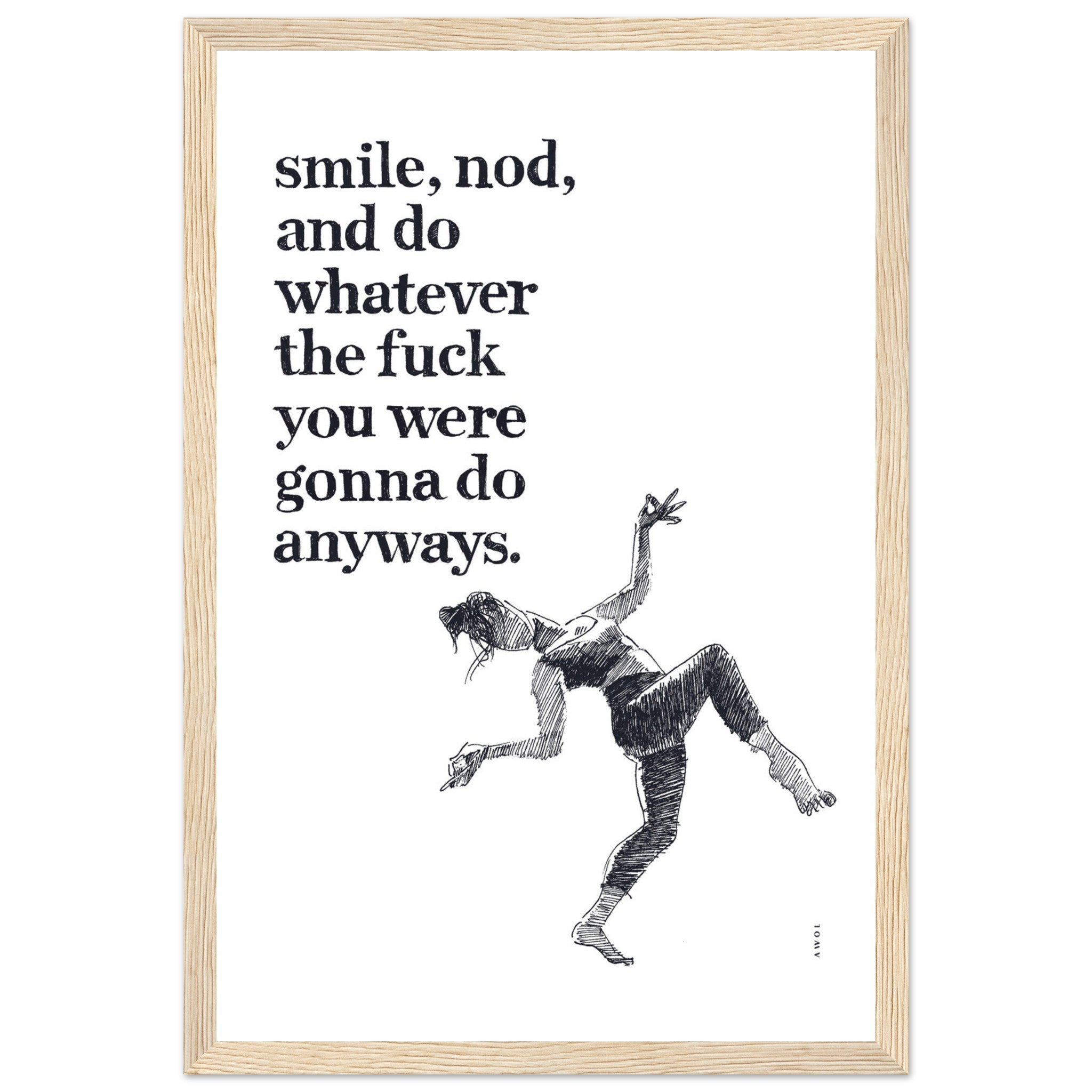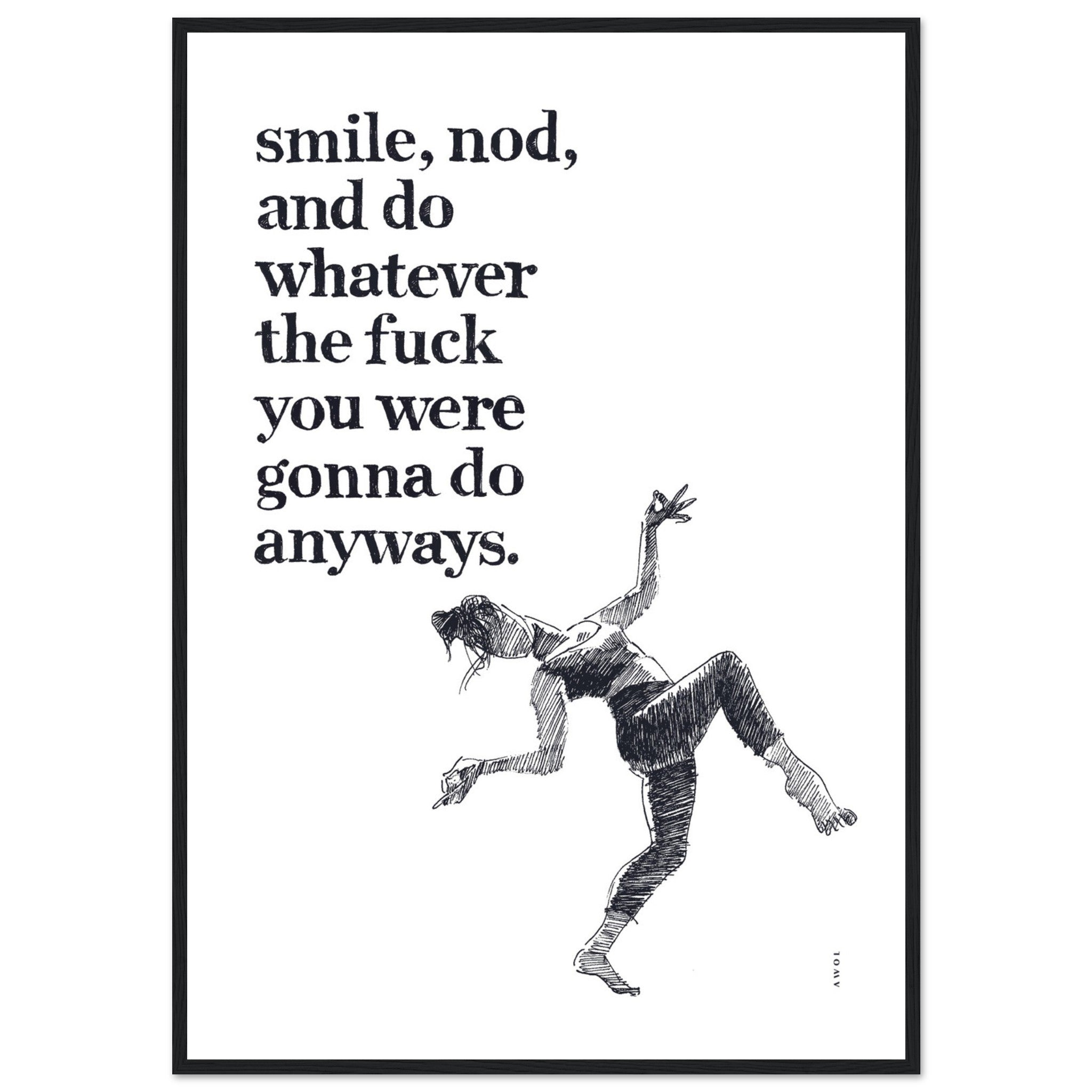 This funny mental health poster print with a wooden frame blends humour, modern spiritual wisdom and positivity, featuring the funny inspirational quote “Smile, nod, and do whatever the fuck you were gonna do anyways”. A black and white framed print of a strong woman dancing in an exercise outfit embodies the carefree and rebellious spirit of self empowerment, personal boundaries and a zen attitude of living life on your own terms. This framed art print with a handwritten mantra encourages you to stay positive, stay true to yourself, listen to your inner voice, and navigate life on your terms. It’s not just an artwork; it’s a daily dose of positive energy for your wall decor. This monochrome wall art is a motivational poster print serving as a daily affirmation for positive thinking, and complements any wall decor: whether it’s a yoga studio wall, meditation space, home office, workout space, bedroom or living room or home decor, the modern hand drawn typography, fun tone and dynamic black and white illustration style remind you to smile. This poster print is a fun gift for your girlfriends, friends going through a divorce, a breakup, or a difficult time, strong women, people with a sense of humour and those who appreciate a good laugh. Smile big, smile always.