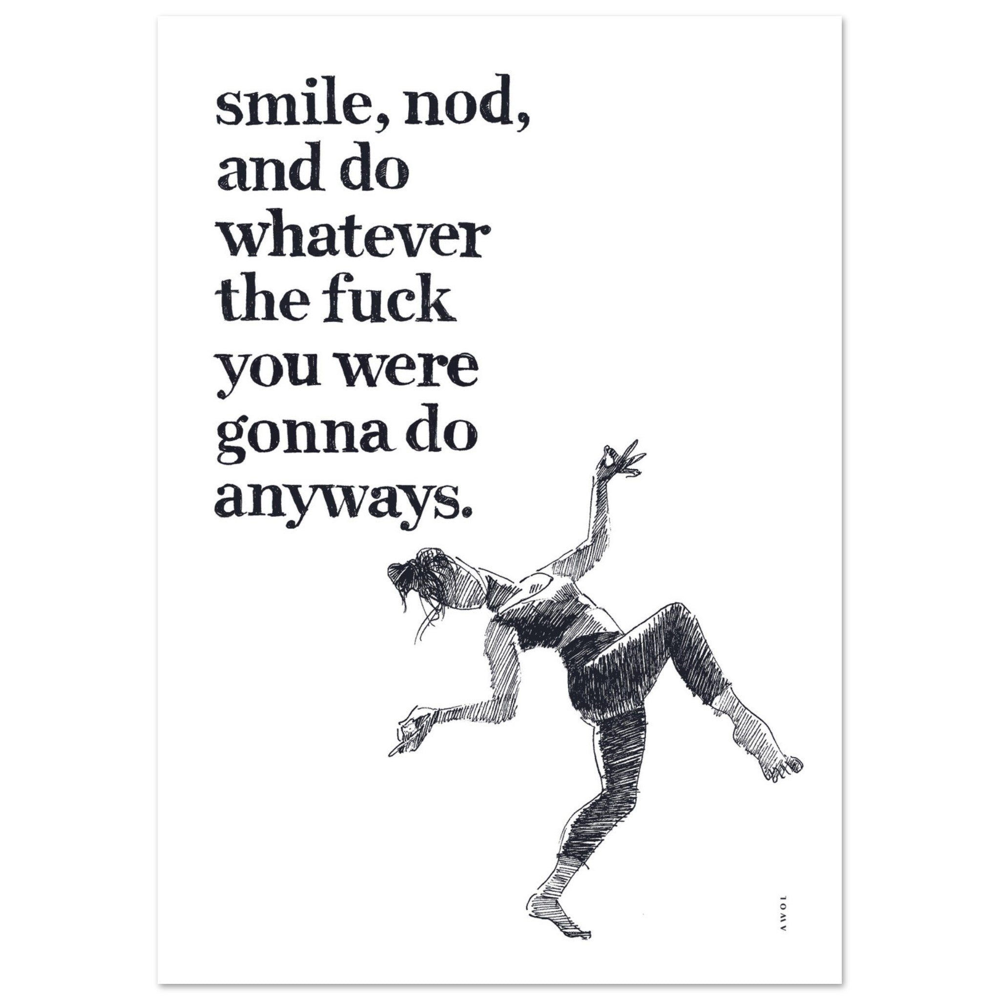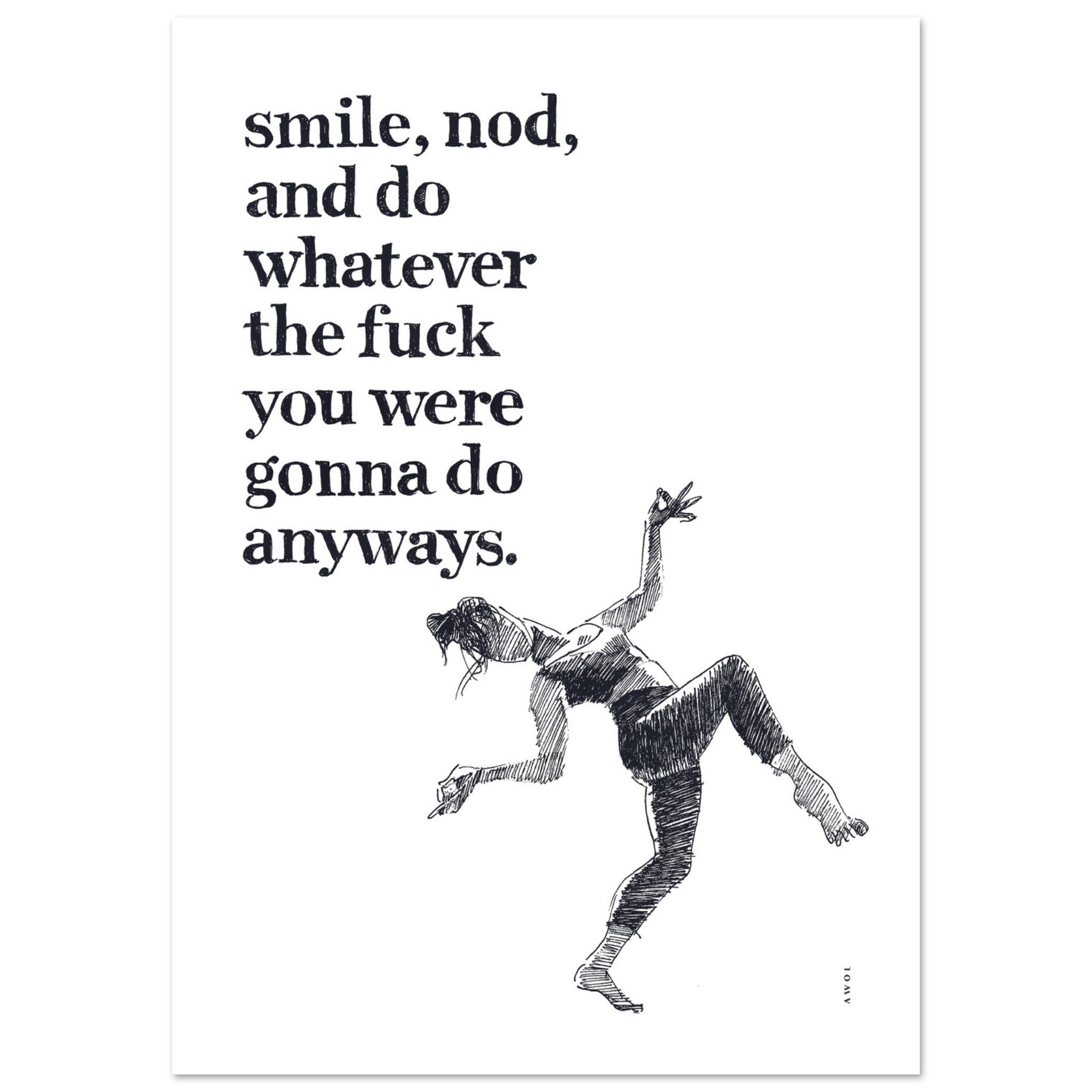 This funny mental health poster blends humour, modern spiritual wisdom and positivity, featuring the funny inspirational quote “Smile, nod, and do whatever the fuck you were gonna do anyways”. A black and white art print of a strong woman dancing in an exercise outfit embodies the carefree and rebellious spirit of self empowerment, personal boundaries and a zen attitude of living life on your own terms. The handwritten mantra encourages you to stay true to yourself, listen to your inner voice, maintain a positive outlook, and navigate life on your terms. It’s not just a poster; it’s a daily dose of positive energy. This monochrome wall art is a motivational wall decor serving as a daily affirmation for positive thinking, and complements any wall decor: whether it’s a yoga studio wall, meditation space, home office, workout space, bedroom or living room or home decor, the modern hand drawn typography, fun tone and modern illustration artwork remind you to smile. This poster print is a fun gift for your girlfriends, friends going through a divorce or a breakup, strong women, people with a sense of humour and those who appreciate a good laugh. Smile big, smile always.