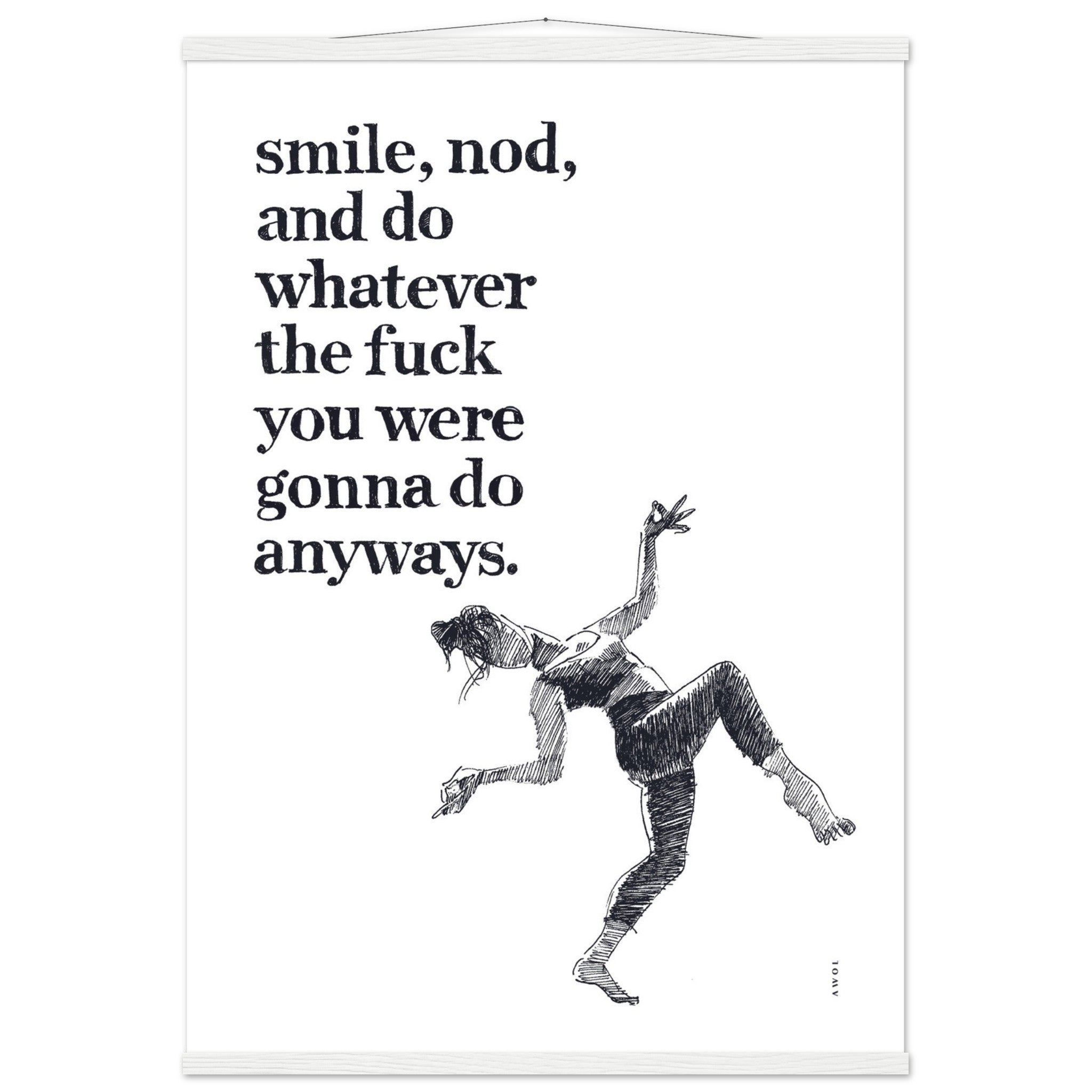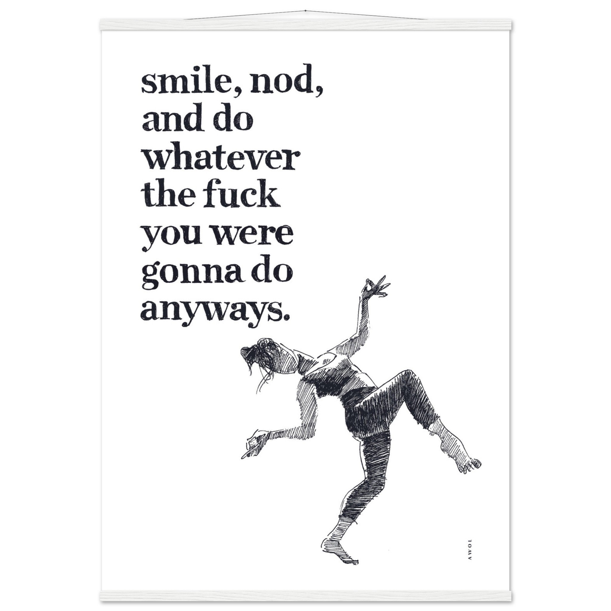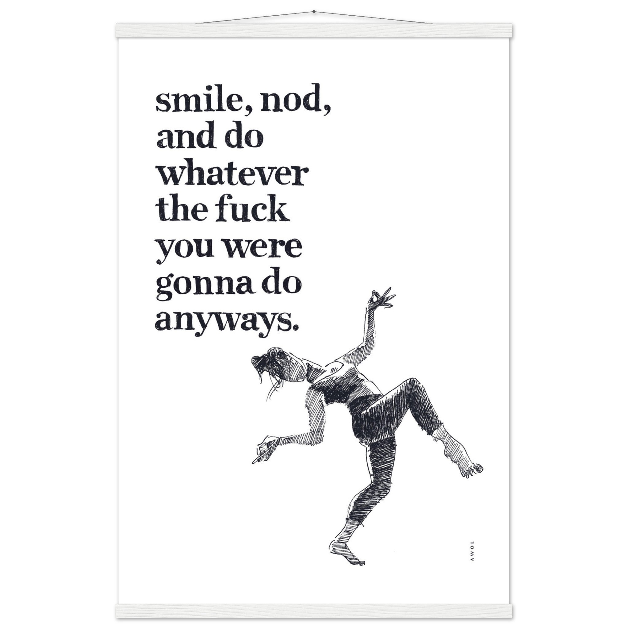This funny mental health poster print blends humour, modern spiritual wisdom and positivity, featuring the funny inspirational quote “Smile, nod, and do whatever the fuck you were gonna do anyways”. A black and white ready to hang framed poster of a strong woman dancing in an exercise outfit embodies the carefree and rebellious spirit of self empowerment, personal boundaries and a zen attitude of living life on your own terms. This wall poster with a handwritten life mantra encourages you to stay positive, stay true to yourself, listen to your inner voice, and navigate life on your terms. It’s not just an artwork; it’s a daily dose of positive energy for your wall decor. This monochrome wall art is a motivational art print serving as a daily affirmation for positive thinking, and complements any interior decor: whether it’s a yoga studio wall decor, meditation space, home office, workout space, bedroom or living room or home decor, the modern hand drawn typography, fun tone and dynamic black and white illustration style remind you to smile. This motivational poster is a fun gift for your girlfriends, friends going through a divorce, a breakup, or a difficult time, strong women, people with a sense of humour and those who appreciate a good laugh. Smile big, smile always.