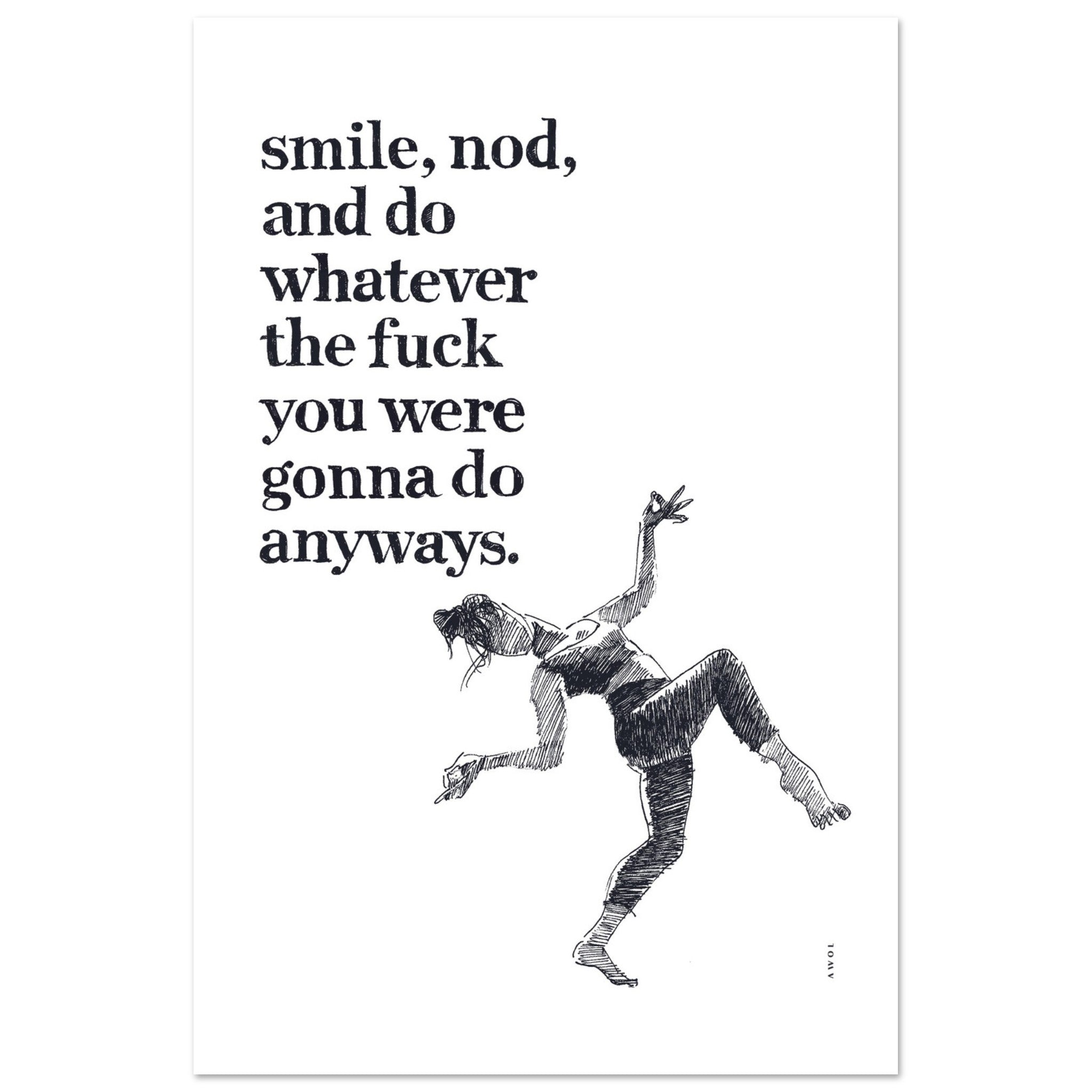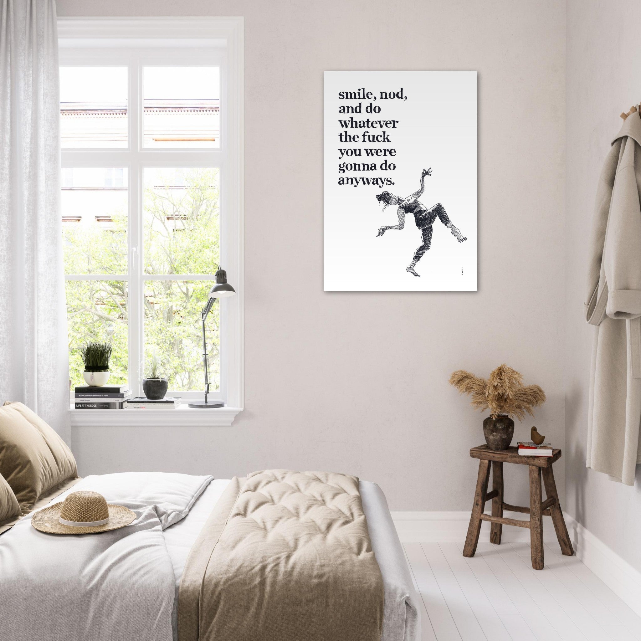 This funny monochrome wall art print on aluminum is modern zen artwork blending humour and modern spiritual wisdom with the funny inspirational quote “Smile, nod, and do whatever the fuck you were gonna do anyways”. This black and white art print on aluminum of a strong and rebellious woman dancing in an exercise outfit embodies the freedom and spirit of self empowerment, setting personal boundaries and a zen attitude – living life on your own terms. The handwritten affirmation artwork reminds you to stay happy and true to yourself and encourages positive thinking It’s not just a wall canvas art; it’s a daily dose of positive energy for your wall decor. This monochrome wall art is a unique wall decor print serving as a daily affirmation and complements any office decor, workout, wellness or yoga space, bedroom, living room or home decor style. The fun quote and modern art style remind you to smile. This positive mental health art print is a fun gift for your girlfriends, friends going through a divorce or a breakup, strong women, people with a sense of humour and those who appreciate a good laugh. Smile big, smile always.