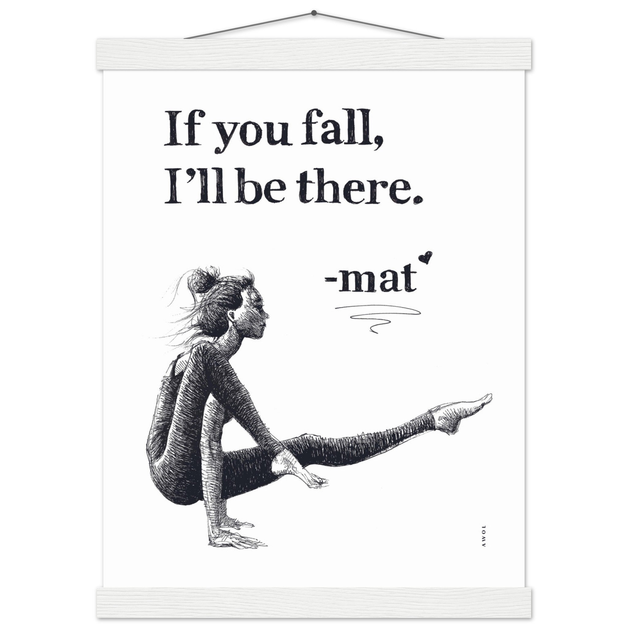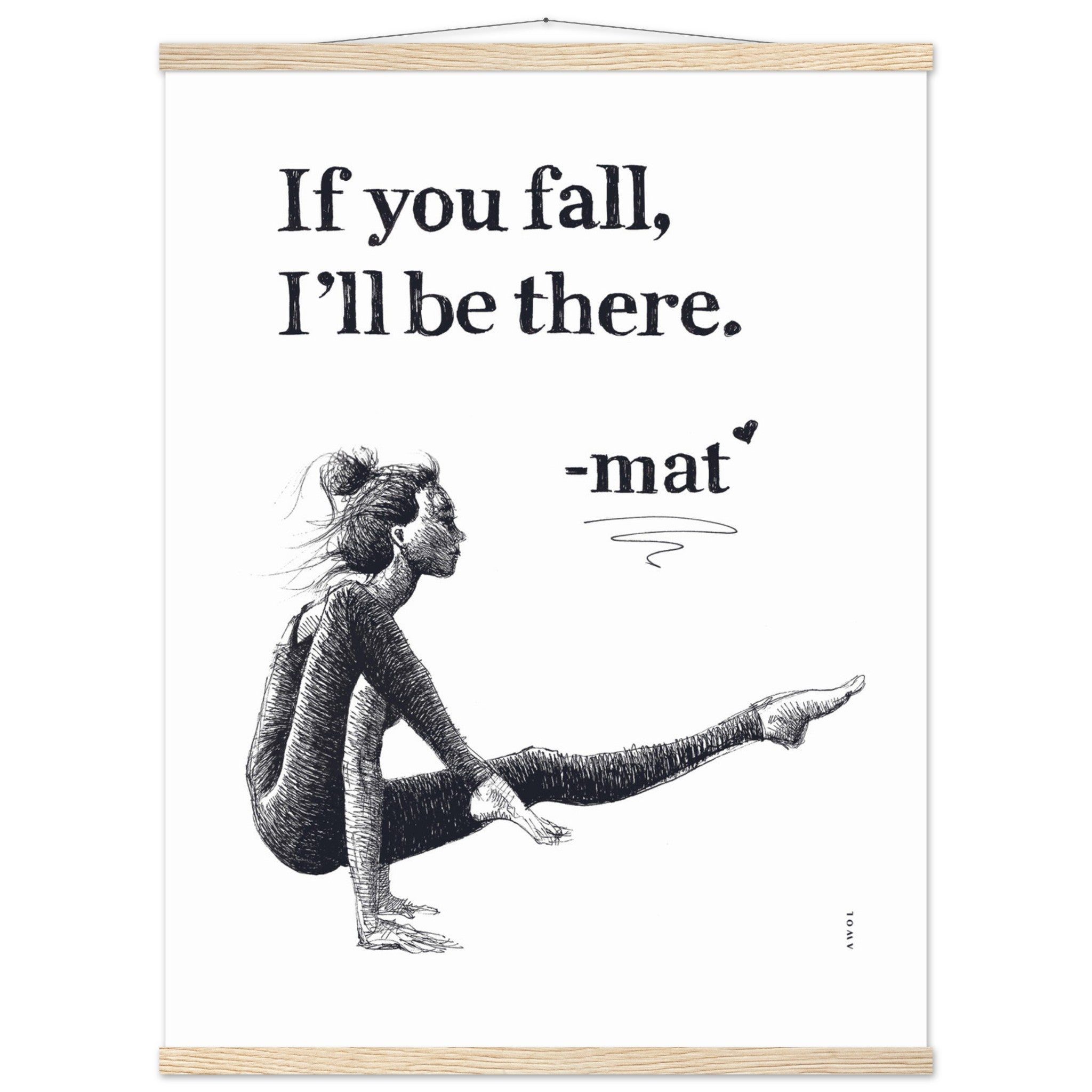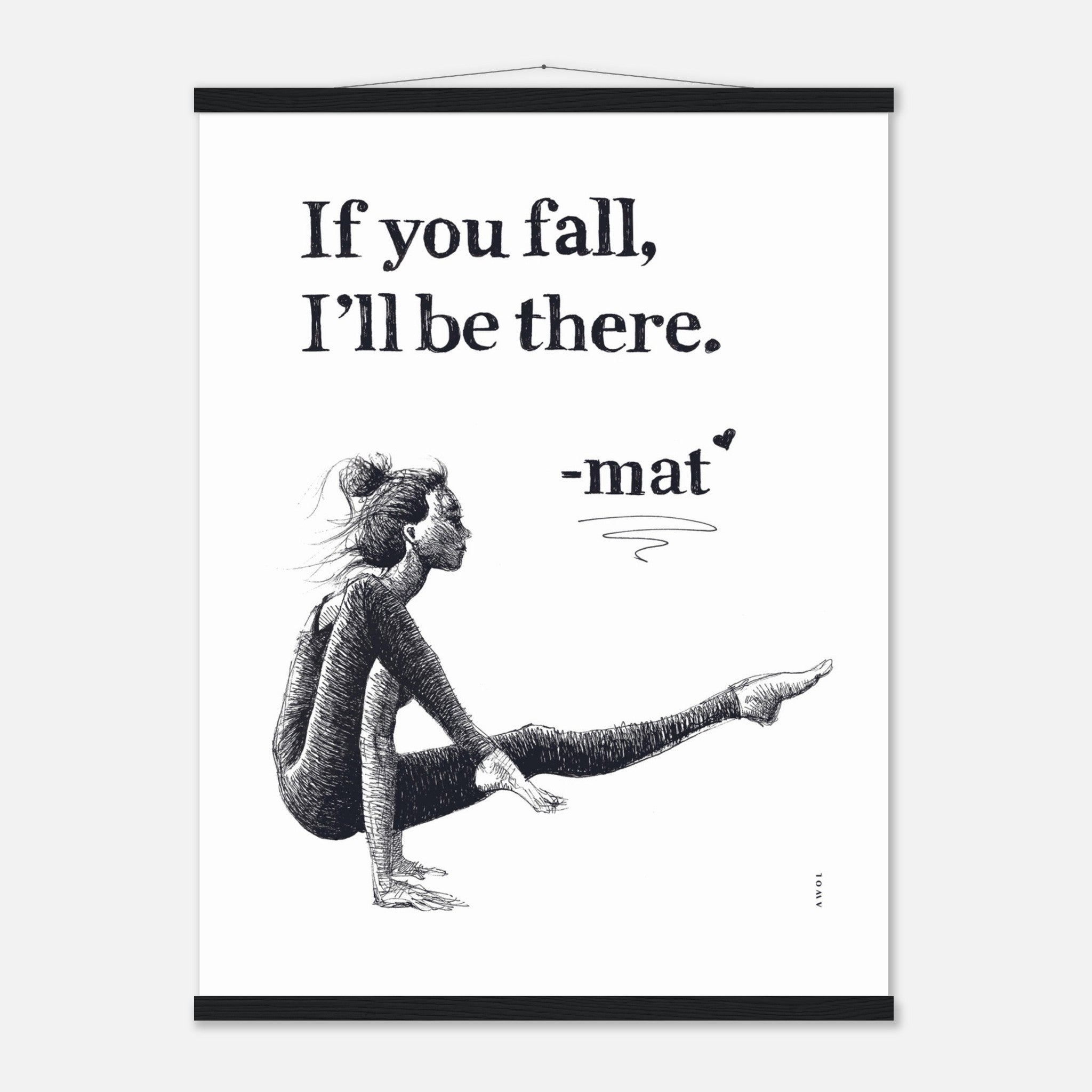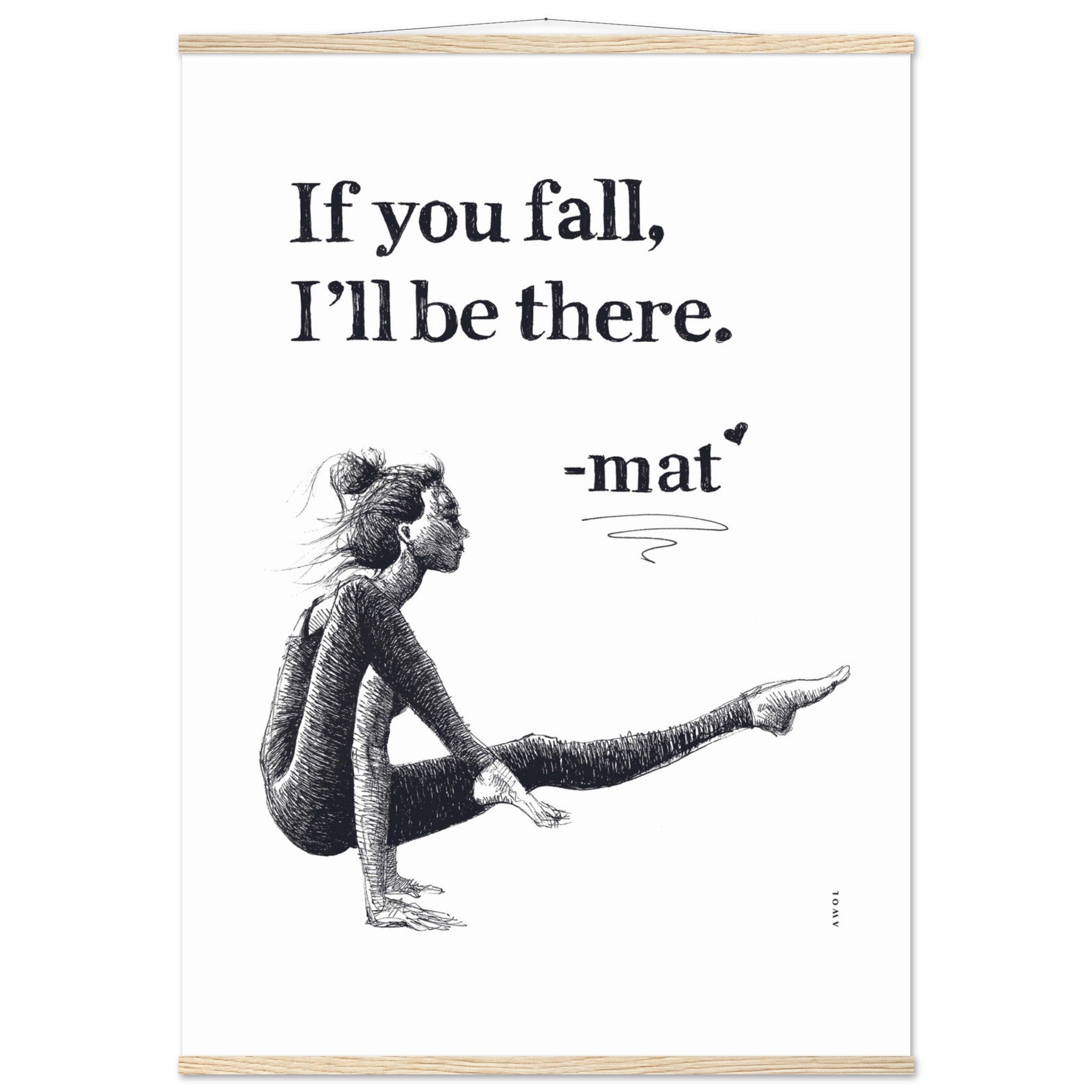 This yoga pose wall poster with a detailed black and white illustration of a woman gracefully engaged in her yoga practice and inspiring quote is a mental health poster with a positive affirmation and supportive message from her yoga mat : “If you fall, I’ll be there.” This modern yoga art print blends the art of yoga with positive thinking, wellness with physical balance, friendship and support through life’s tougher periods and challenges. This monochrome yoga poster is ready to hang: the mindfulness illustration and zen attitude of her yoga pose create a harmonious blend of living yoga on and off the mat. This wall art print serves as a daily affirmation, manifesting resilience and strength. It is a modern wall decor art print for your yoga studio, meditation or wellness spaces, or home decor, encouraging mindful living and holistic well-being. It also makes a unique and thoughtful gift to a friend who may be going through a difficult time, or simply loves practicing yoga.