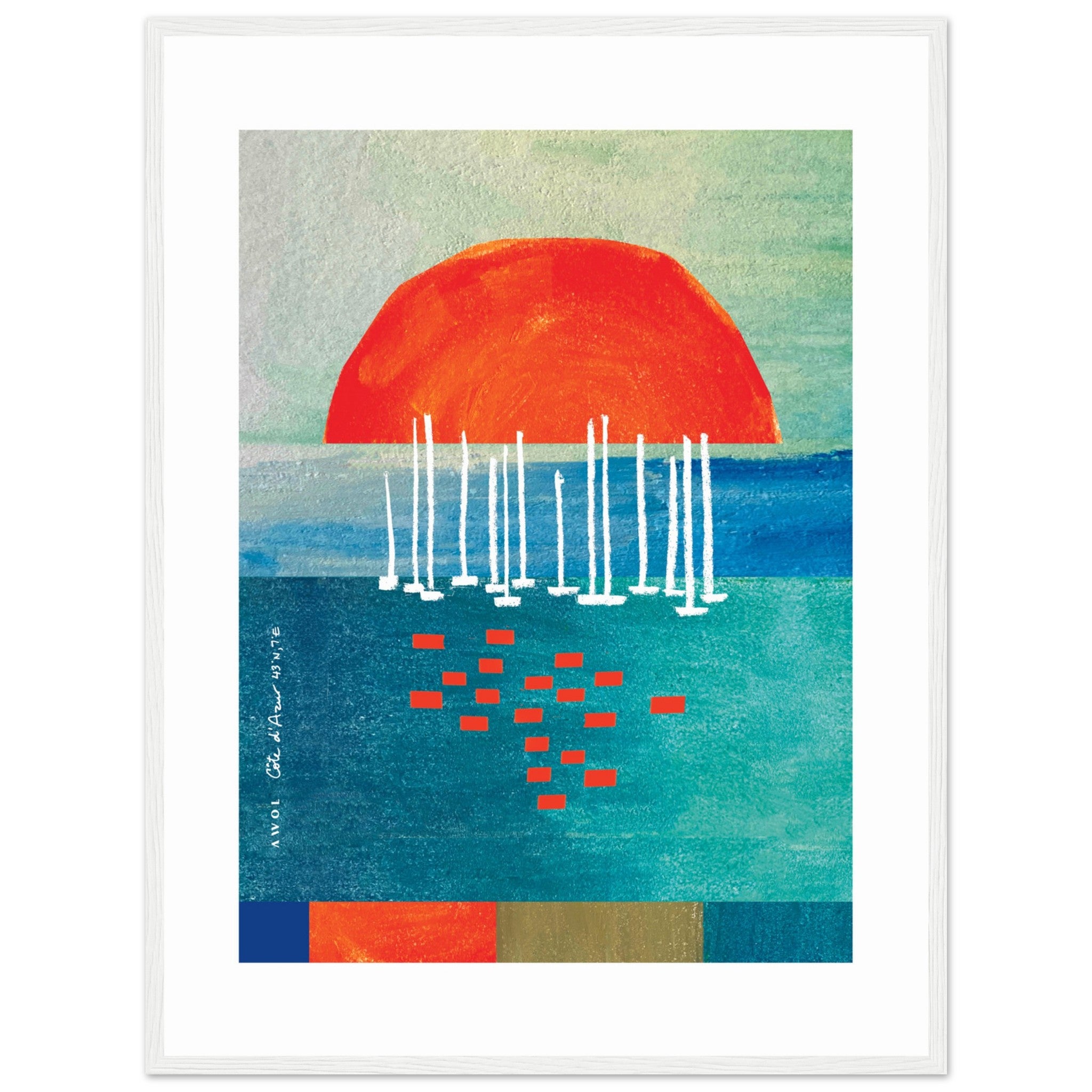 In this colourful framed wall art print with a wooden frame, a bright orange sun rises over an azure blue sea with white sailboats and sun reflections in the water. A graphic abstraction of bright blue, red, and green add a modern colour pop to this modern seascape artwork. This colourful landscape painting is a framed wall poster evoking beautiful seaside destinations in bold, contrasting colours and vivid shades of blue hues inspired by the Côte d’Azur / French Riviera in the South of France. This blue abstract wall art is a fine art print with painted textures and depth, evoking relaxing mornings and summer evenings by the sea, infused with vacation vibes in beautiful coastal destinations on the Mediterranean. This is a colourful, contemporary wall art for sailing, sunrise and sunset lovers. Let this seascape art infuse your wall decor with good morning positivity, a relaxing mood, vacation vibes and a generous dose of wanderlust.