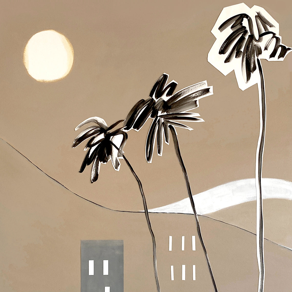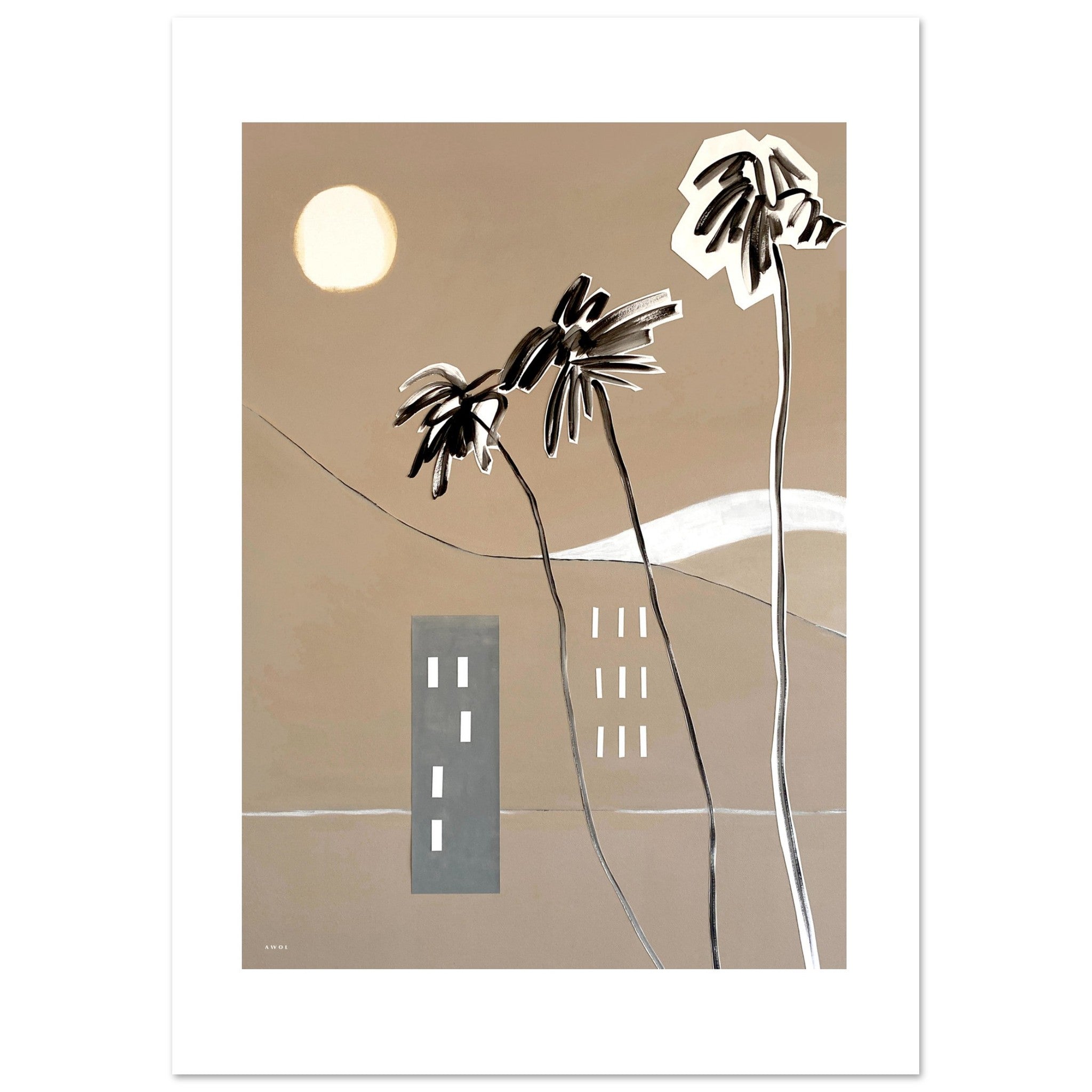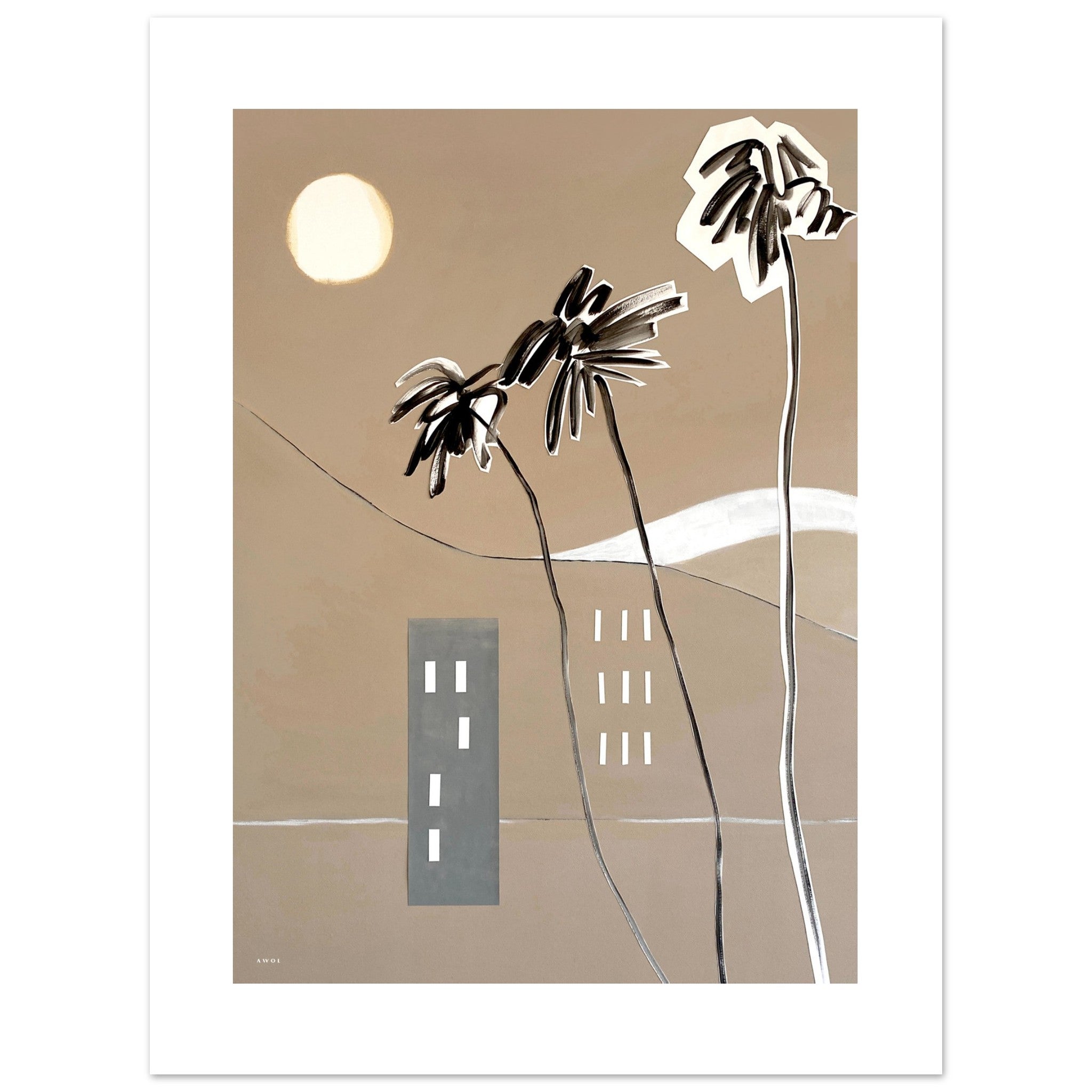 This palm tree wall art is a modern poster print with a minimalist landscape abstraction of mountains and palm trees by the sea. It is a Mediterranean wall decor print created using collage and painting on canvas, drawing, illustration and decoupage techniques to depict beautiful Italian scenery and South of France coastal landscapes. This minimalist landscape wall art print depicts bold, graphic shapes and gestural drawing in a neutral colour palette of high contrast black, white and earth tones. The snow-capped French and Italian Alps mountains serve as a backdrop to this minimalist wall art with minimalist palm trees and graphic abstract buildings, evoking windy day by the sea. This abstract wall poster is part of a two piece landscape art series meant to bring modern travel art to your wall decor, and a dose of contemporary Mediterranean design to your office space, living room, bedroom or hallway art collection.