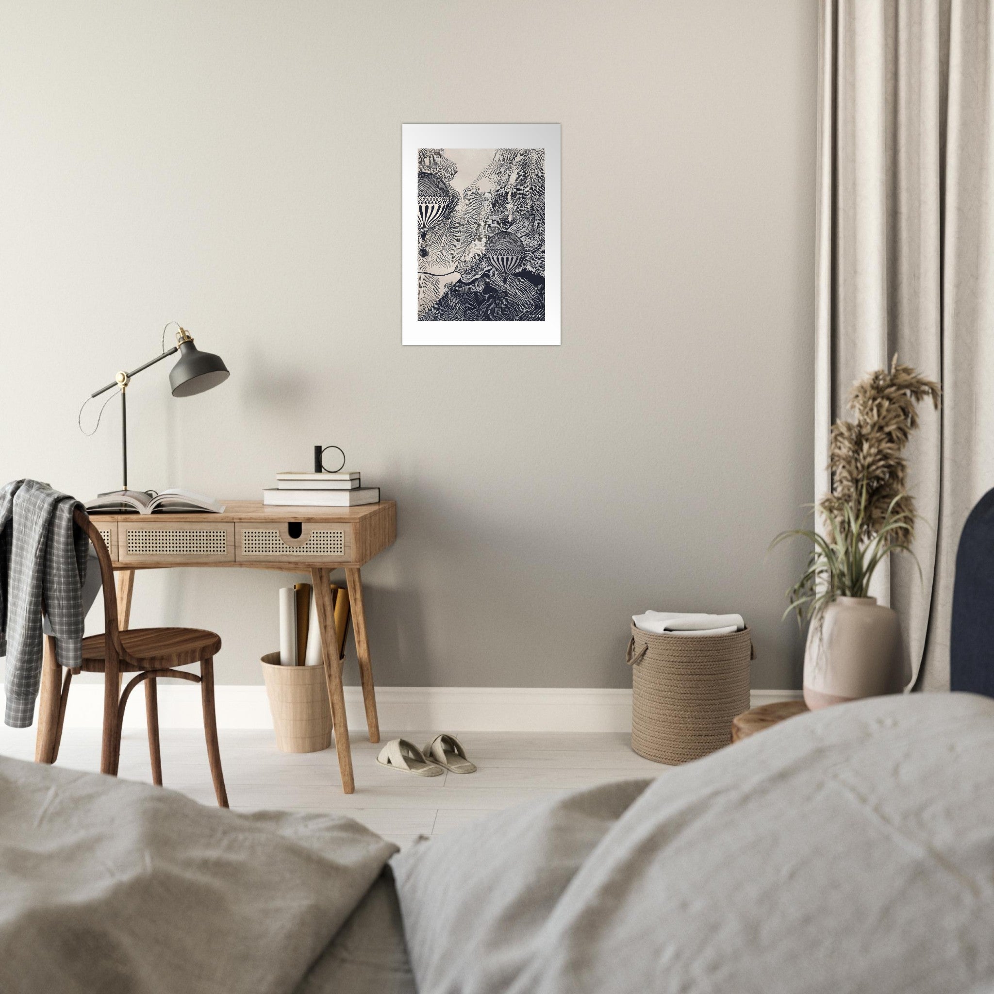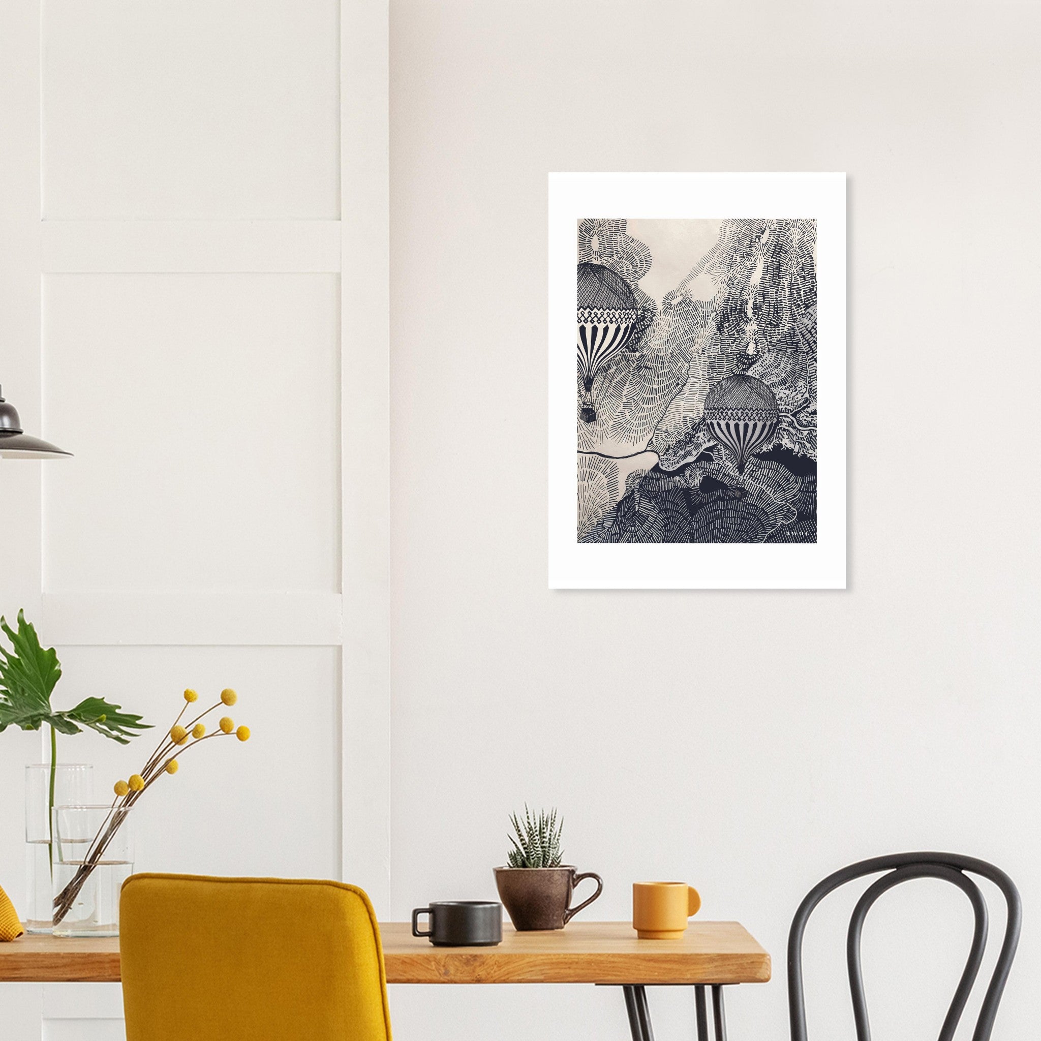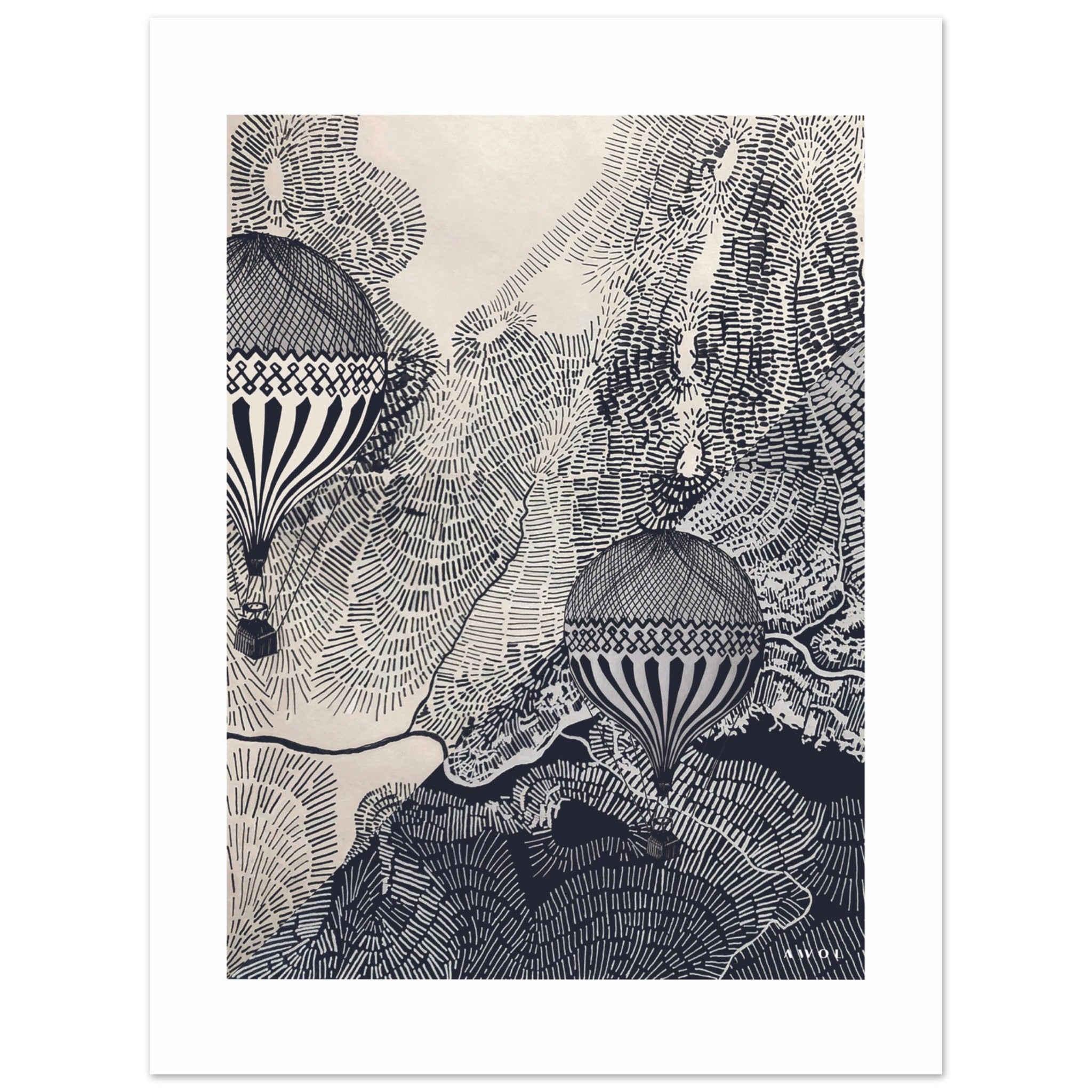 This monochrome wall art print is an intricate black and white air balloon illustration in a vintage style wall decor print that beckons you to embark on a visual journey of flight and imagination. This intricately hand-drawn black and white travel poster features two vintage hot air balloons flying over an abstract landscape drawing with intricate, detailed line patterns of rivers, mountain roads and valleys seen from the sky. This black and white abstract wall art weaves a tapestry of beautiful destinations portrayed from a birds’ eye point of view. The retro montgolfières infuse this wall art decor with travelling nostalgia, and transport us to a bygone era of romanticized travel, journeys and explorations to unknown destinations. Whether you are a seasoned traveller or looking for a gift for someone with a curious and adventurous spirit, this travel art print is a reminder to dream big, and embrace the spirit of courage and discovery. This black and white wall artwork will infuse your office, and home decor with wanderlust, the freedom of flying high in the clouds and the wisdom of seeing life from a different angle.