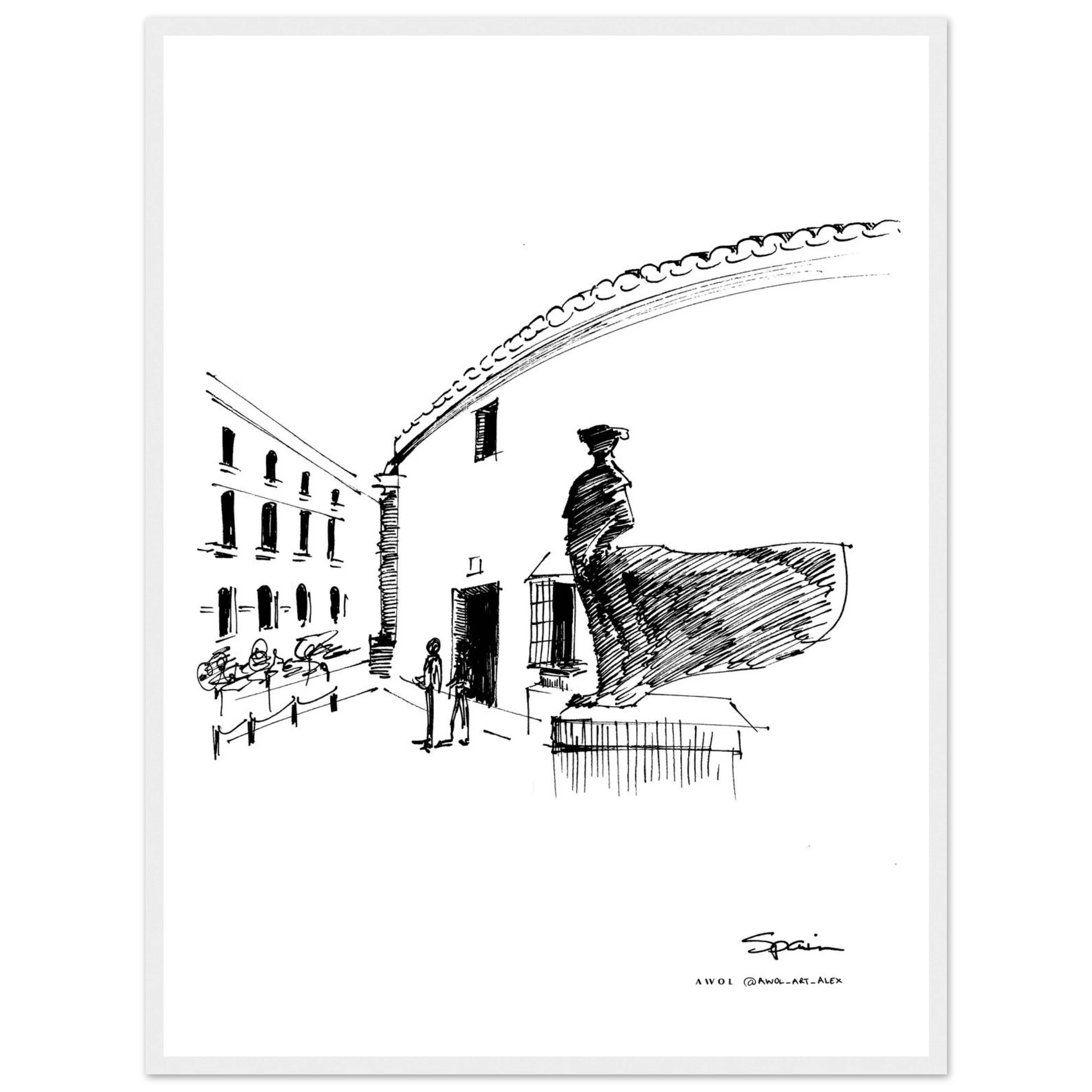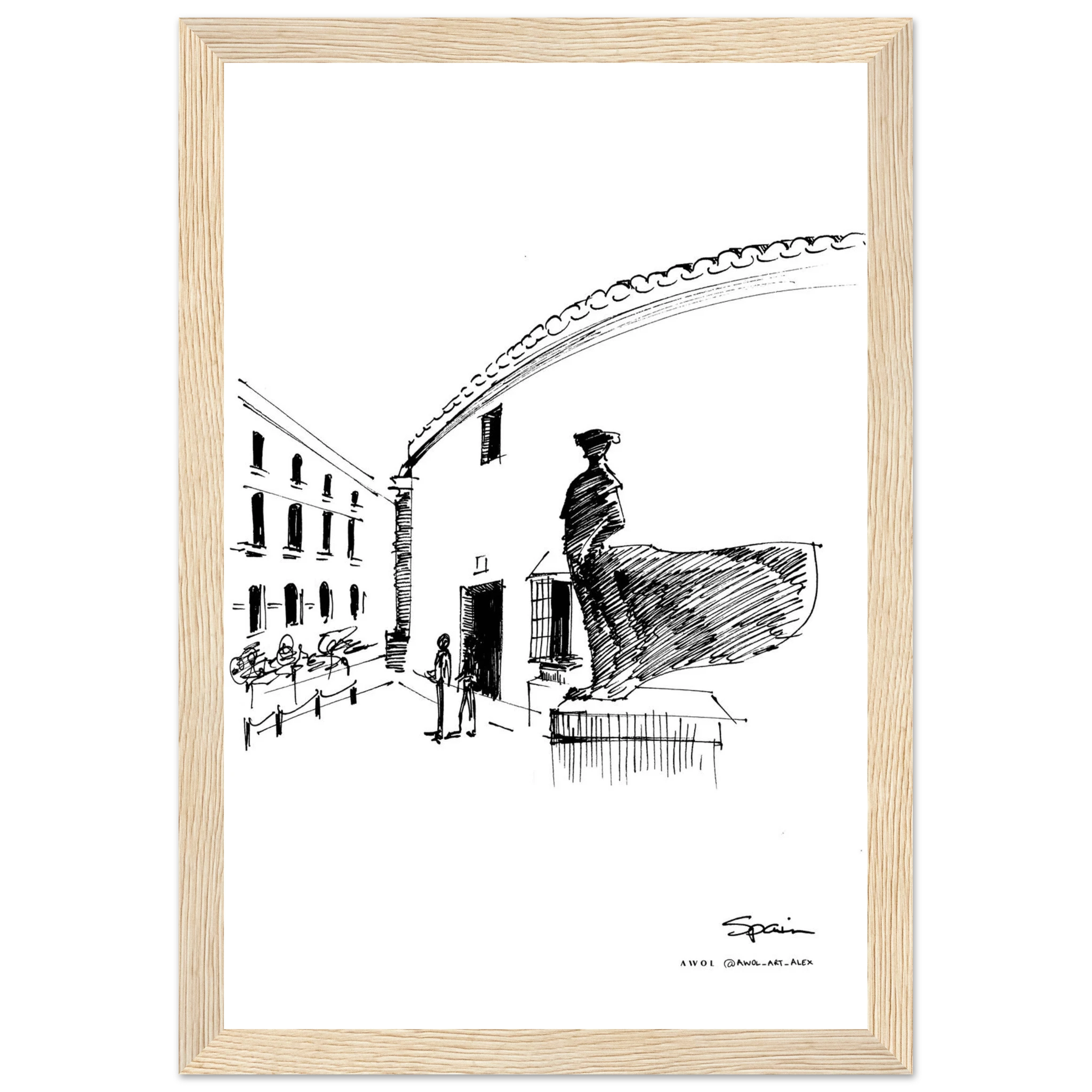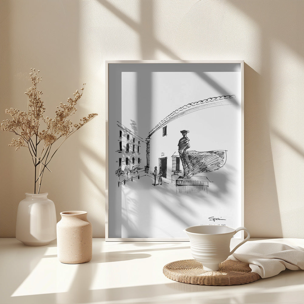 Add a touch of Spanish art and tradition to your wall decor with this elegant and timeless black and white framed art print. Featuring a monochrome, sketchy illustration of a bullfighter in traditional toreador attire, this graphic Spain artwork with a wooden frame highlights the architectural charm of Andalucía – a contemporary monochrome poster print, ready to hang. Hand drawn in the historic town of Ronda in Southern Spain, this art print showcases a bullfighter statue outside the famed Plaza de Toros, one of Spain’s oldest and most celebrated bullfighting arenas, built in 1785. Ronda is widely regarded as the birthplace of modern bullfighting, where the tradition evolved into the art form we know today. This Spain framed travel print seamlessly merges Spain’s rich bullfighting heritage with a modern art style, making it an ideal addition to any travel wall art collection. Perfect for Spanish architecture lovers, European travellers, and people seeking minimalist travel art, this framed wall art print adds a timeless sense of style, sophistication, and Southern Spain charm to your interior decor. It’s the perfect choice for anyone seeking a unique Spain travel souvenir or artful travel inspired gift.