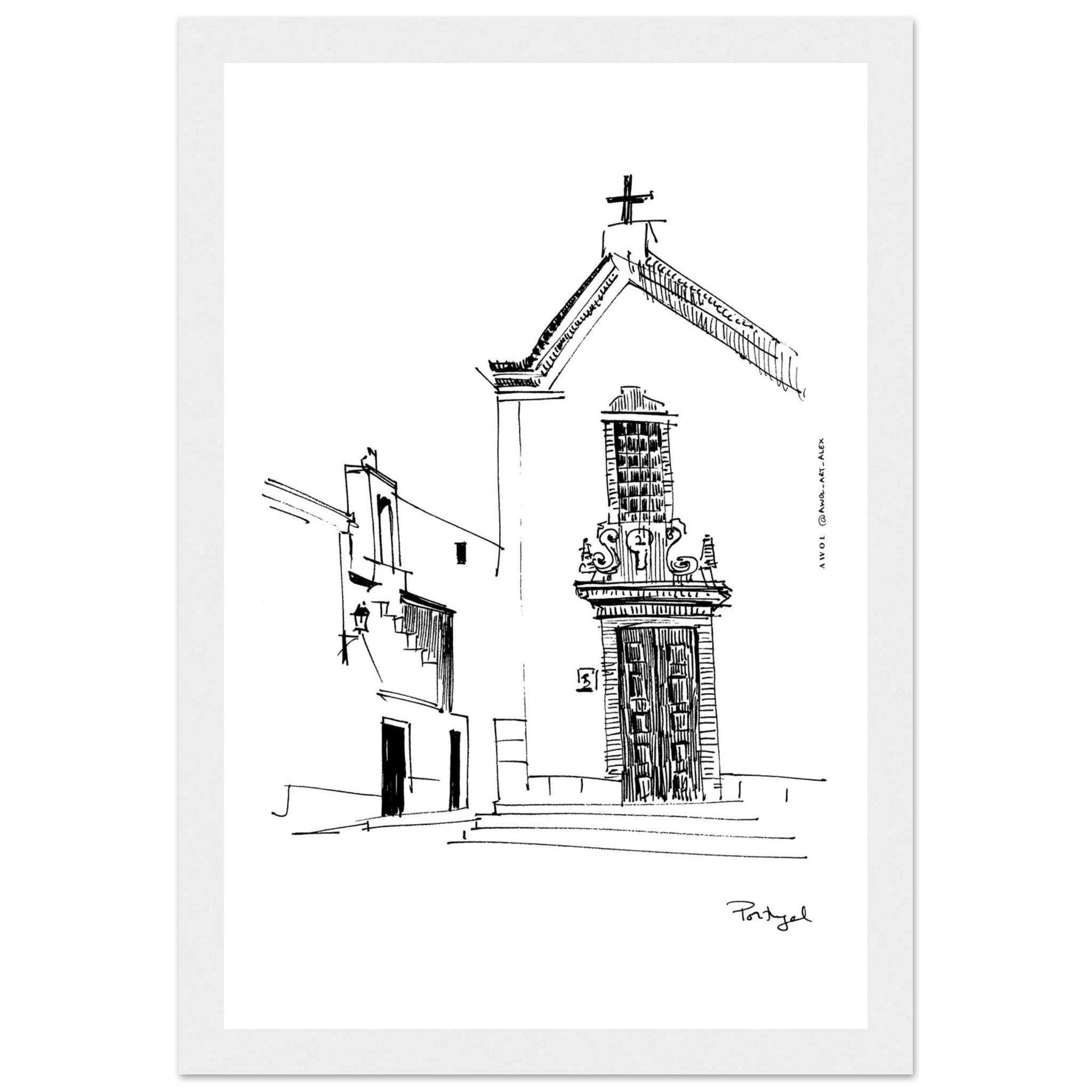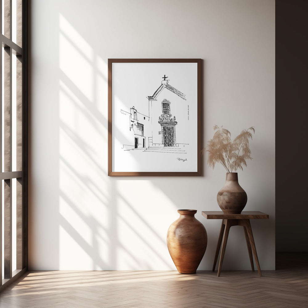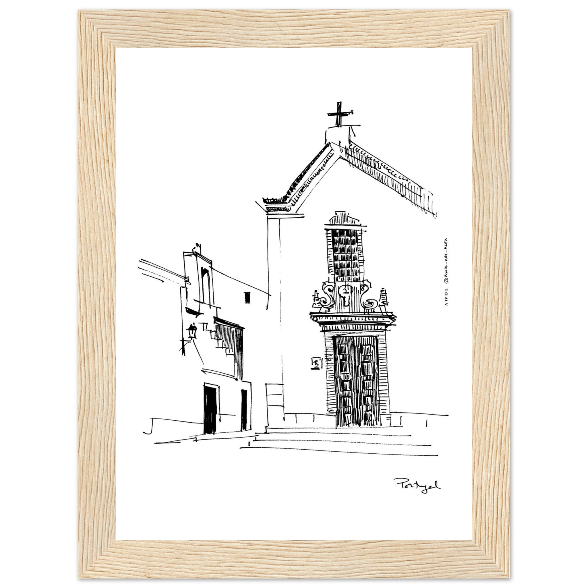 This monochrome Portugal wall art print with a wooden frame captures the charm of a small Portugese town square in a detailed yet expressive graphic illustration style. This black and white Portugal poster print highlights the interplay of light and shadows, depicting whitewashed buildings basking in the bright midday sun. This modern Portugal wall decor showcases the tranquil beauty of a small coastal town at noon, while the midday sun washes over the building façades, creating strong contrasts between the higlights and shadows. This Portugal travel art print blends contemporary minimalism with timeless European design, making it a cool Portugal wall decor, gift or keepsake. This Portugal drawing is inspired by my journeys from Porto to Lisbon and the Algarve, evoking the welcoming, charming spirit of Portugal’s small towns and hidden gems. Whether displayed as a poster or framed artwork, it’s a unique wall artwork for Porgual lovers and travellers, or locals, and an artful way to celebrate Portuguese design and heriate – perfect for any style of home decor, fitting into any space, whether it’s traditional or contemporary design.