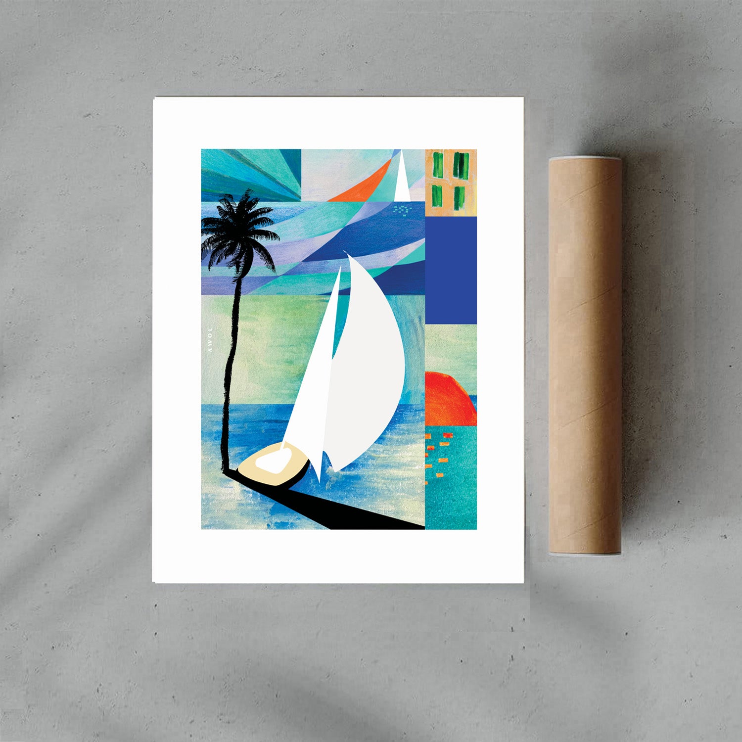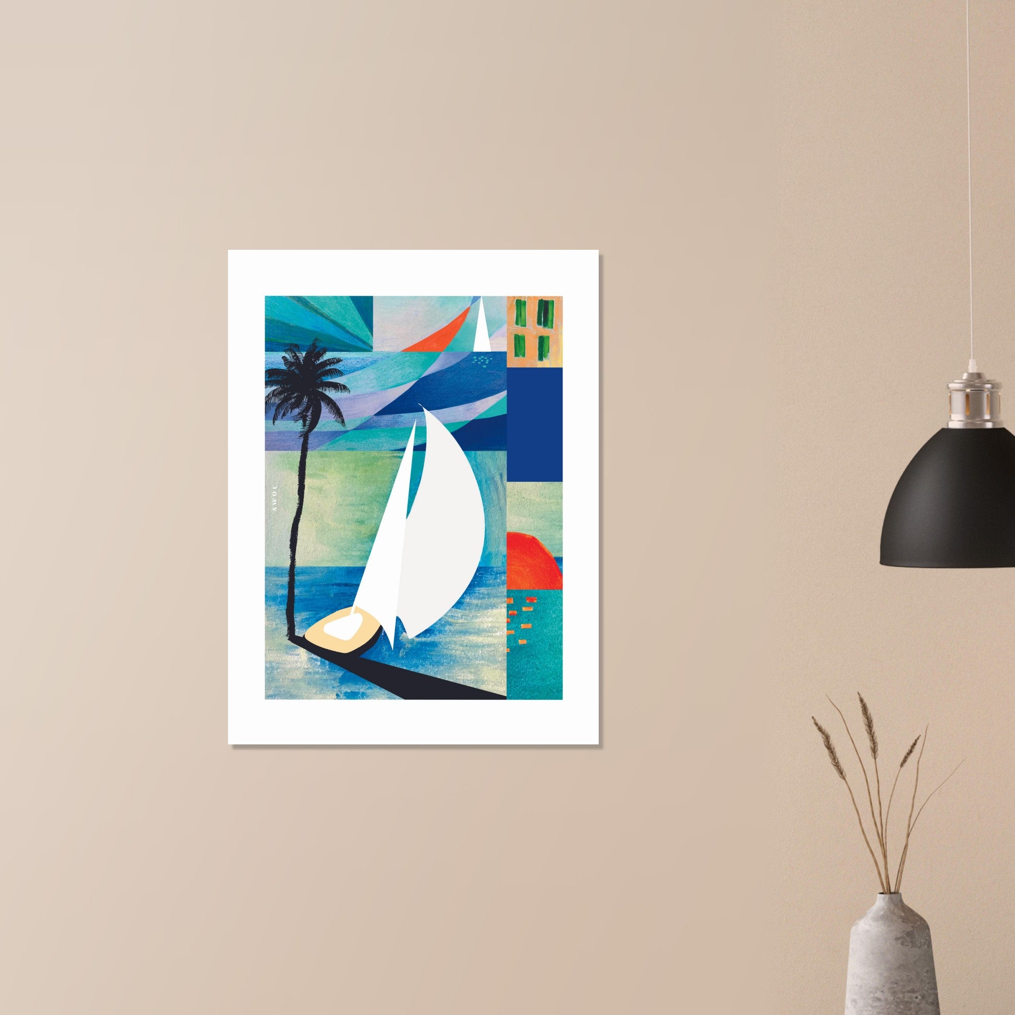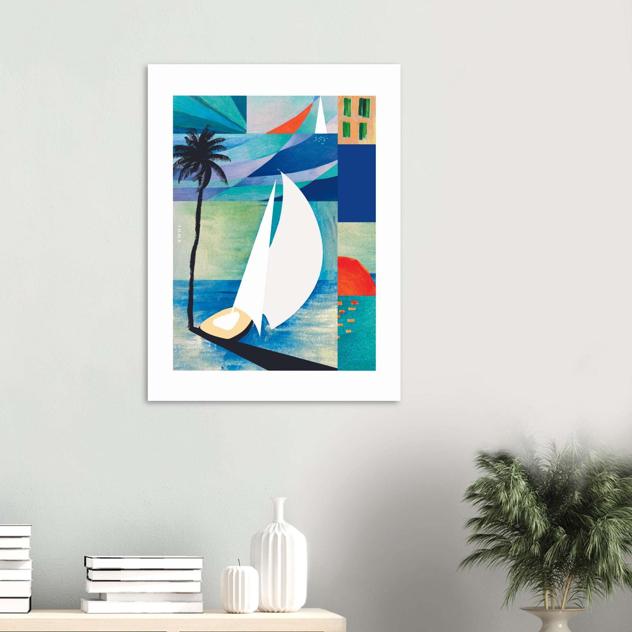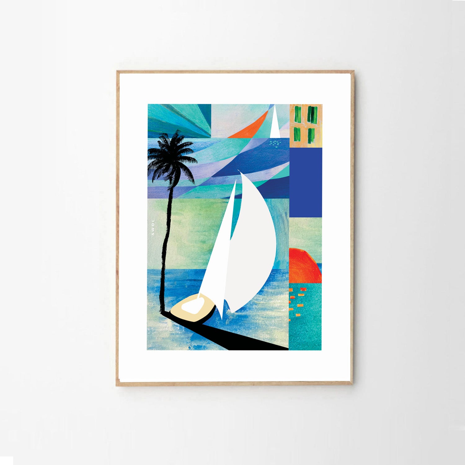 This colourful travel poster sets the scene for a visual escape to Mediterranean seaside destinations: a white sailboat gracefully shares the spotlight with a swaying palm tree, while around them the painted landscape wall art comes to life through a dynamic interplay of blue, orange and white colors, colourful houses, a magnificent orange sun rising sun over the water, and a white sailing boat swaying in the breeze. Whether you yearn for colourful wall art, a boho beach home decor, or the laid-back elegance of coastal living in a burst of color and energy for your travel art collection, this wall painting poster art print is a celebration the Mediterranean sea’s timeless beauty, sailing, long days in the South of Europe and a sun-soaked celebration of relaxing vacation vibes. This poster is a blend of abstract art with traditional landscape art techniques, creating a unique visual experience for your wall decor.