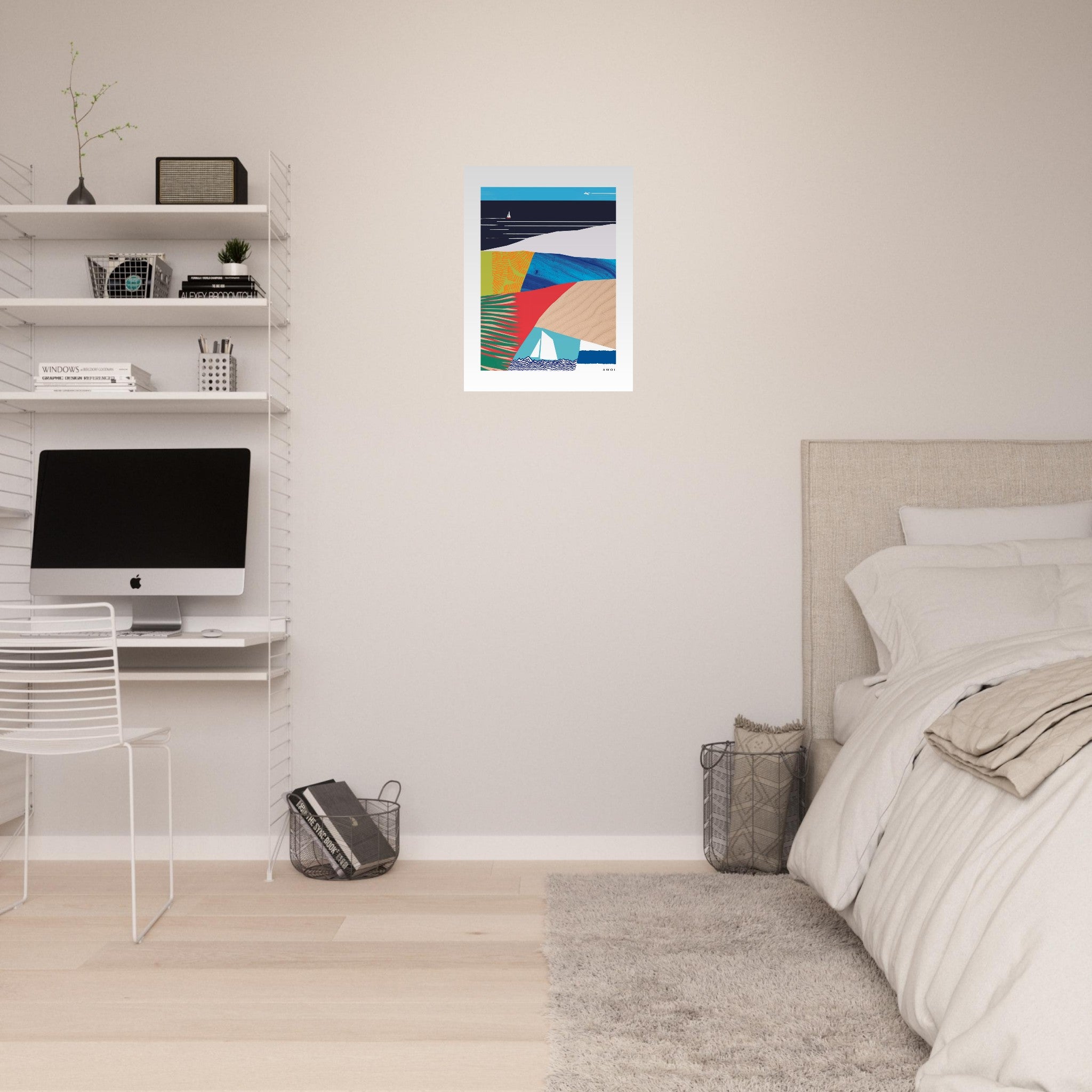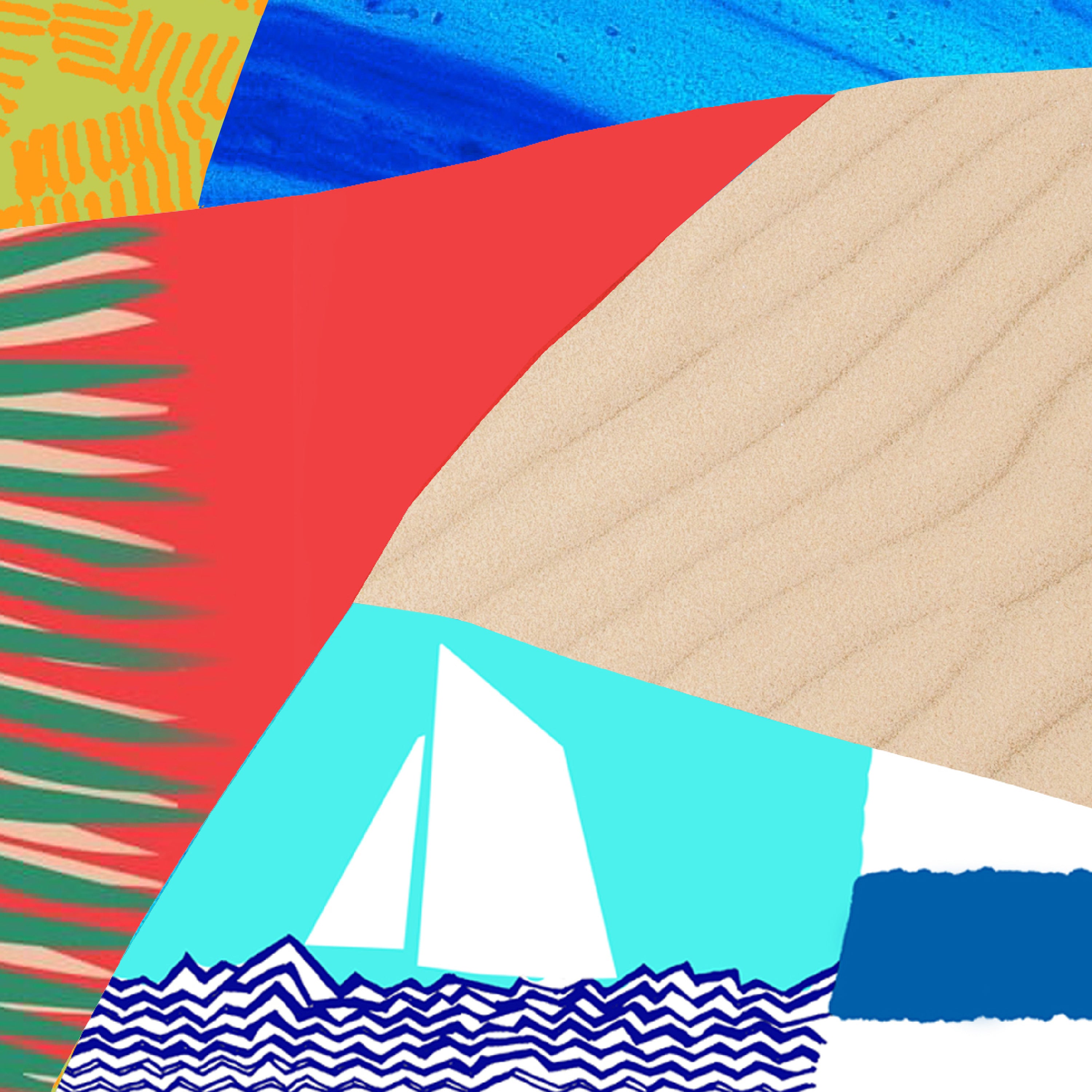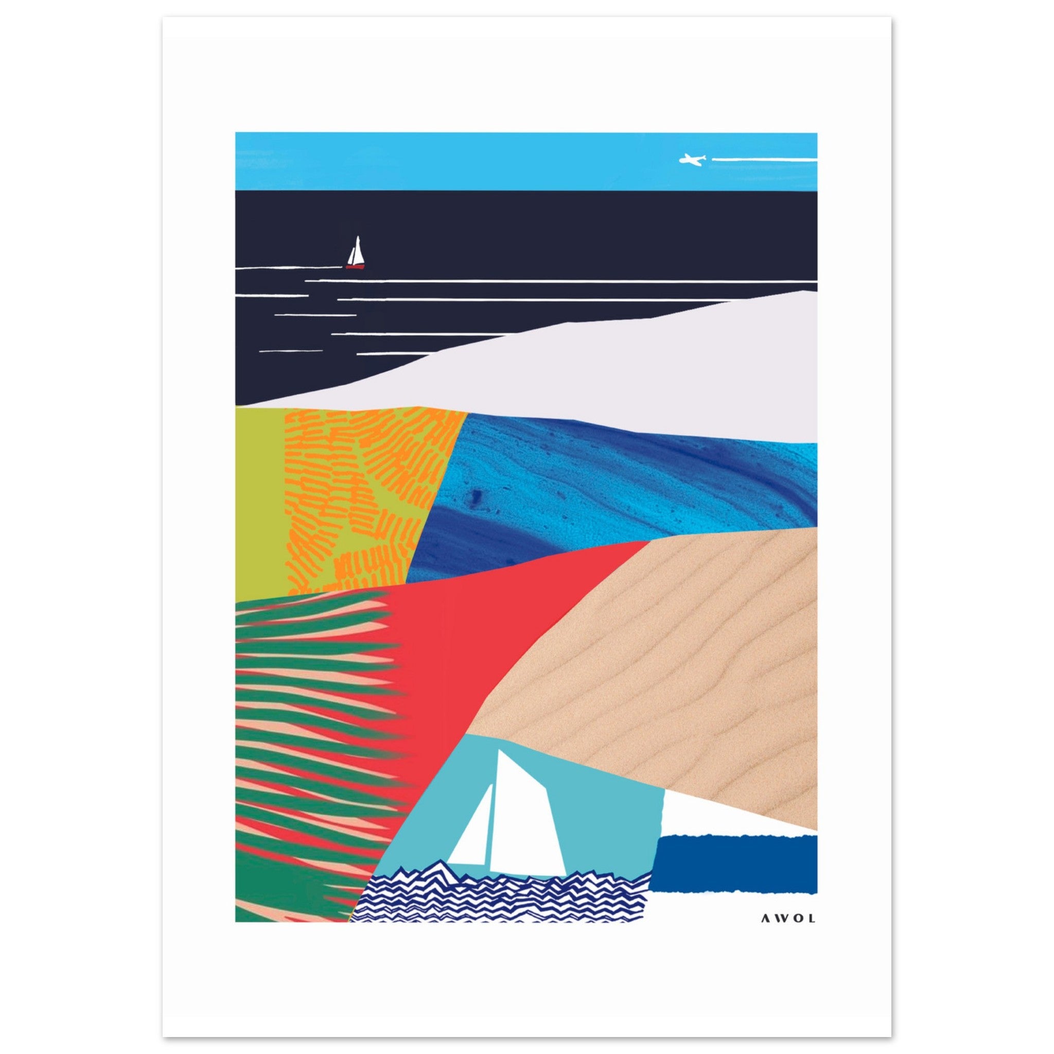 This modern abstract wall art print on aluminum is a visual journey to a tropical seaside paradise with eternal summer vibes – a colourful art print in vibrant colours and a contemporary graphic artwork of sunny vacation destinations depicting a tropical paradise abstraction with sandy beaches inspired by tropical beach destinations around the Mediterranean, Europe, Asia and South America. This beach artwork is a modern abstract framed wall art print that is ready to hang, with bright, vivid colours; a bohemian framed travel print with a modern art style in a graphic collage and a bold nautical abstract pattern print. Visually striking, polished, and built to last – this stylish aluminum print is designed with superior quality and a clean finish. The bright accent colours: red, blue, green, yellow and neutral earth tones of this abstract travel poster evoke the sun soaked beach vibes of seaside travel destinations. Abstract shapes blend with palm trees, tropical plants, sandy beaches, sailboats, beachy blue and white stripes and Mediterranean inspired design. This travel art print will infuse your wall decor with wanderlust, good vibes and relaxation. Whether searching for cool travel gift ideas or home decor, this fun art print brings a burst of energy and vacation mood to your interior design in playful art accent. Your daily getaway is just a glance away.