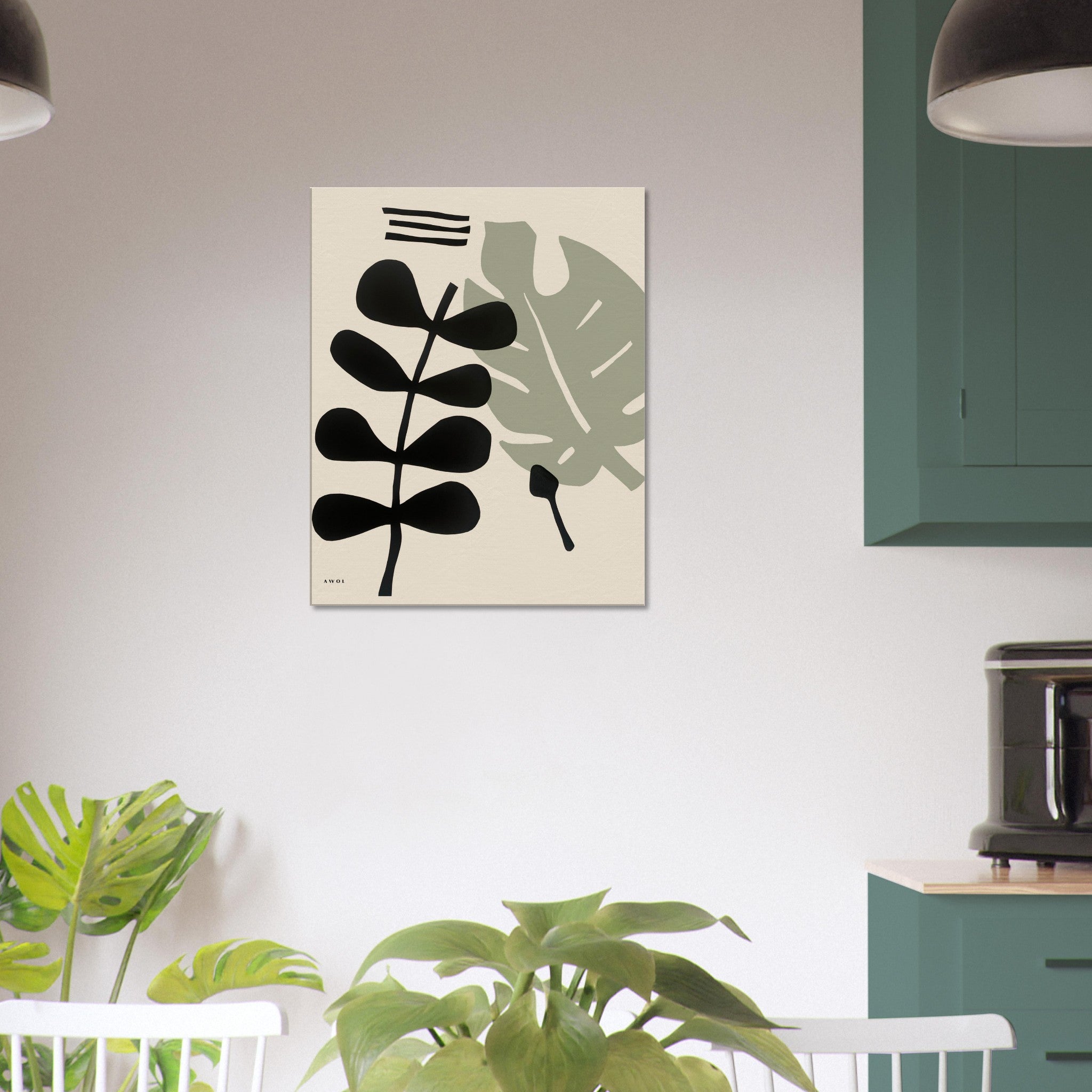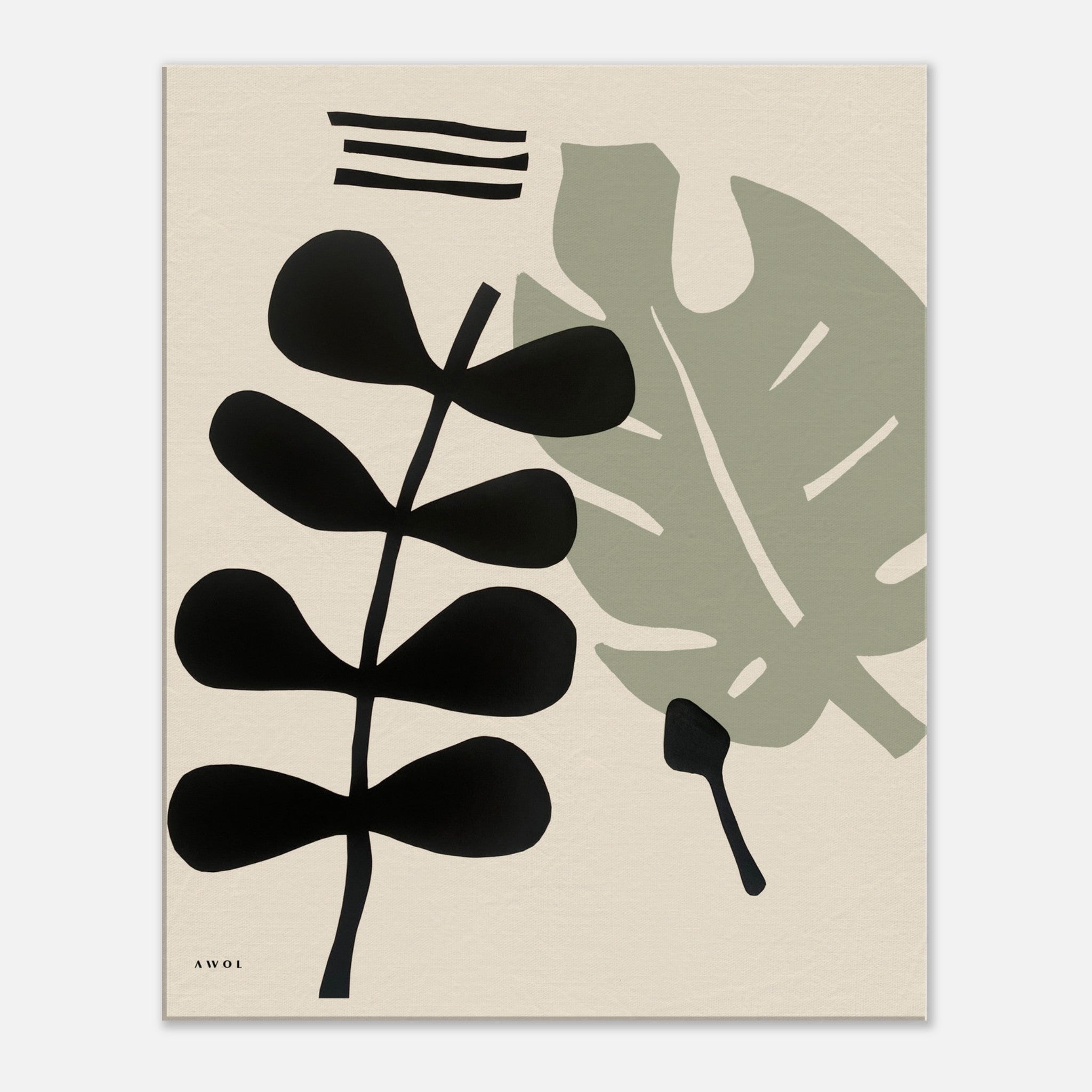 This minimalist canvas print is a modern plant wall art on canvas with a graphic and modern art style. This abstract botanical artwork with black, white, olive green and warm pastel tones is inspired by Mediterranean flora and tropical gardens in beautiful destinations where the sun shines all year and grows lush vegetation and tropical plants. This contemporary nature-inspired wall decor artwork juxtaposes minimalist leaves with abstract graphic shapes in a modern abstract wall canvas art for plant lovers. This modern nature art print brings biophilia to your wall decor in a modern wall art style that is bold yet comforting, making a unique wall art statement for for your living room, bedroom, hallway, sun room or kitchen. Combine it with the other plant print in this 2 piece abstract art series for a unique home art gallery wall, or gift it to a plant lover.