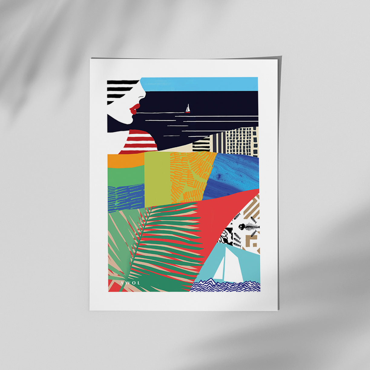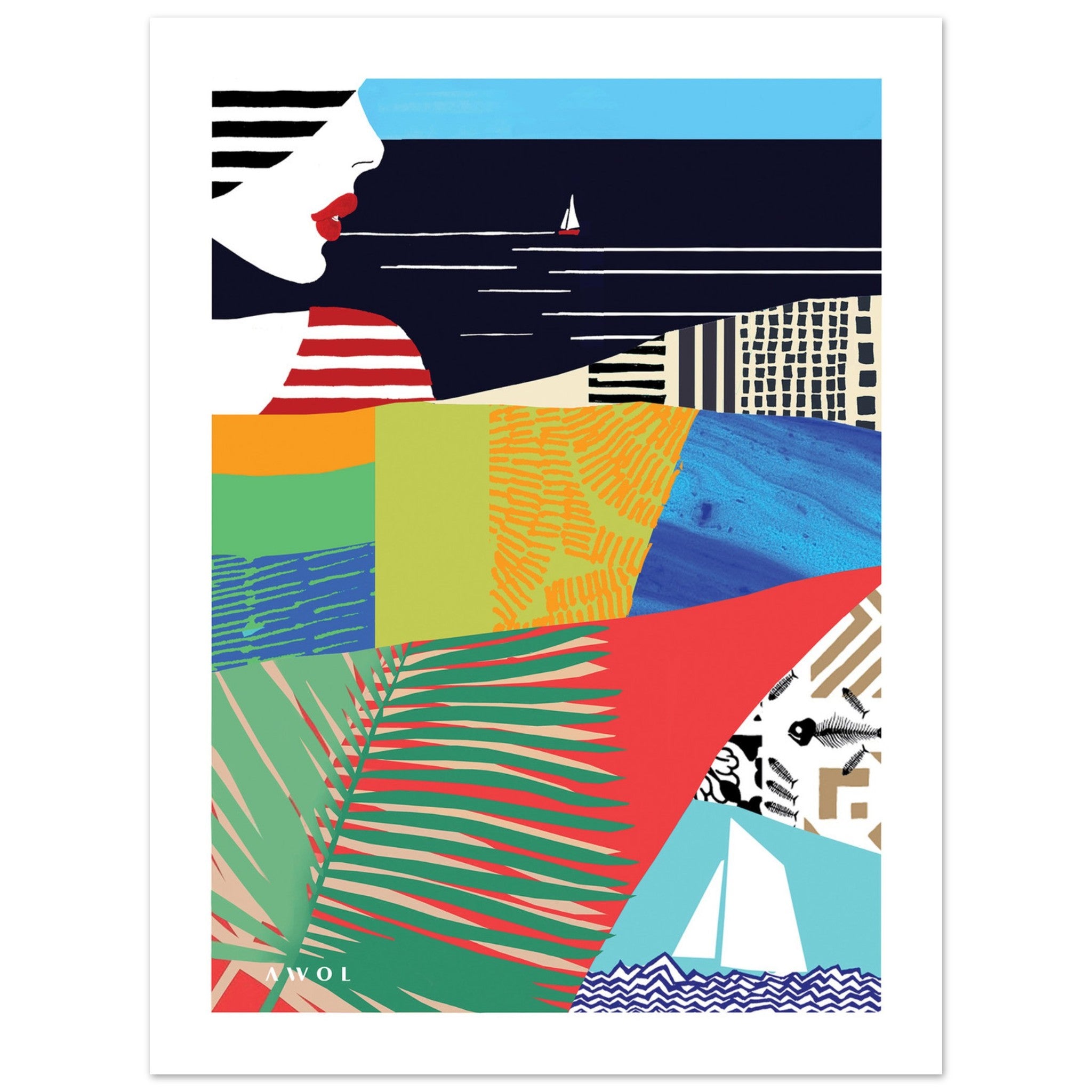 This colourful travel poster is an abstract wall art in bright, vivid colours and bold graphic patterns of colour blocked, abstract shapes within which lie tropical plants, palm trees and the profile of a beautiful woman looking at a sailboat moving beneath an azure blue sky on a deep blue sea, sailing past beaches, blue lagoons and coastal seaside landscapes. This beach wall art print is inspired by relaxing vacations, seaside bliss and travel around the Mediterranean, Caribbean, and tropical destinations in Asia and South America. This wall poster is a modern art collage that evokes happy vacation vibes and beautiful places filled with sunshine. The bright hues of warm reds, blues, white and earth tones of this abstract travel art print evoke the sun-kissed warmth and summer vibes of coastal beach destinations. Palm trees, tropical plants, sandy beaches blend with sailboats, beach stripes and Mediterranean-inspired patterns. This tropical artwork will infuse your wall decor with wanderlust, good energy, and summer vibes all year round. Whether you’re searching for travel decor for your living room, office, bedroom, kitchen, or gift ideas for people who love to travel, this colourful art print brings a burst of good vibes to your home decor in a contemporary and colourful art aesthetic.