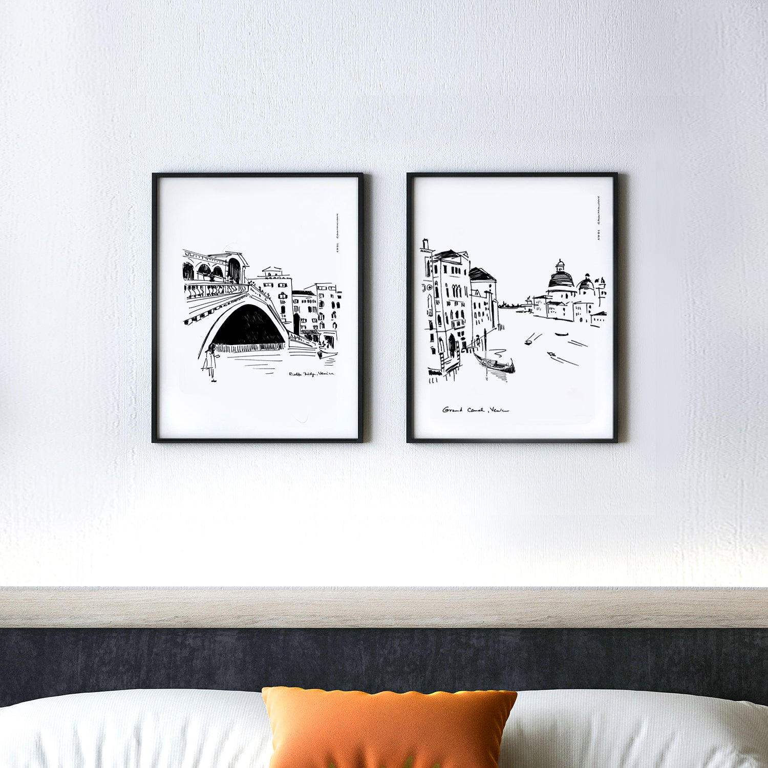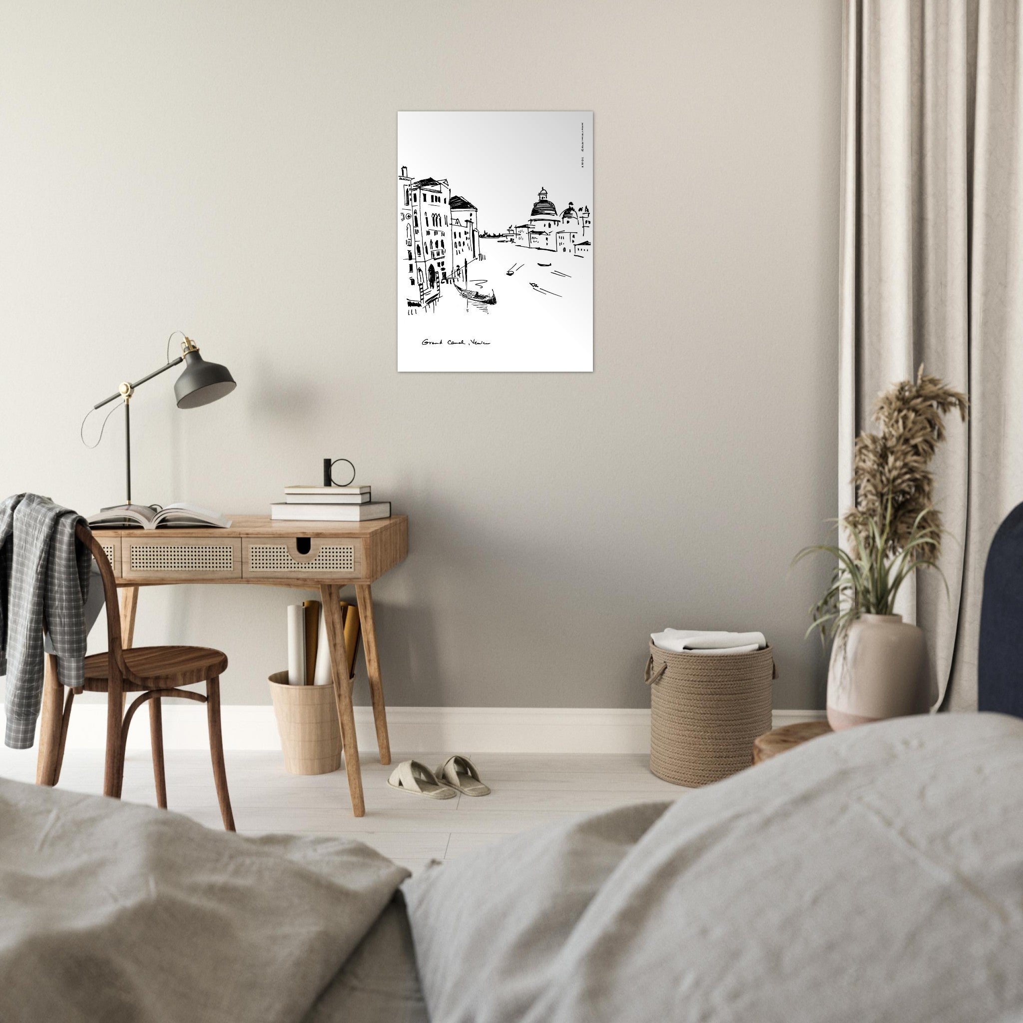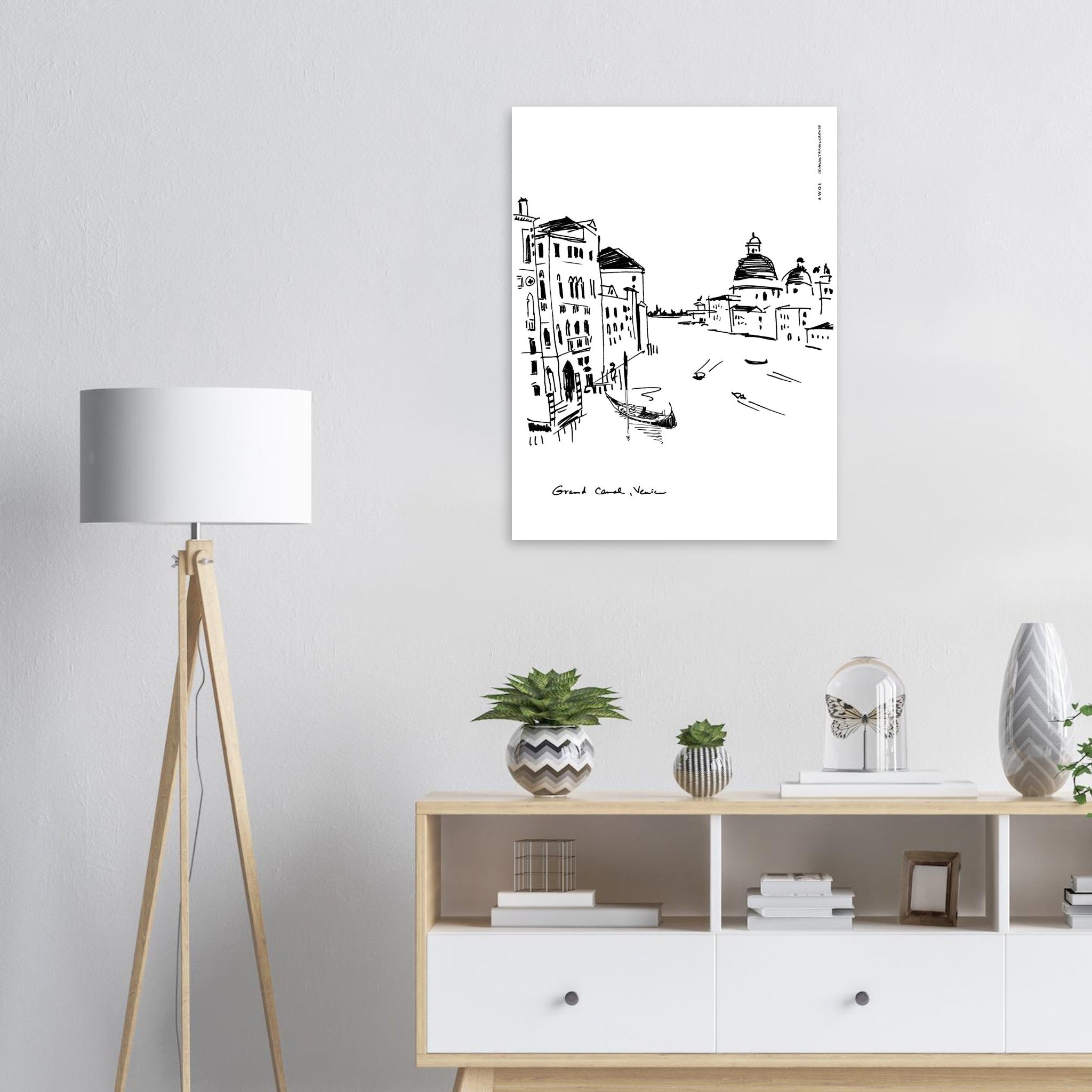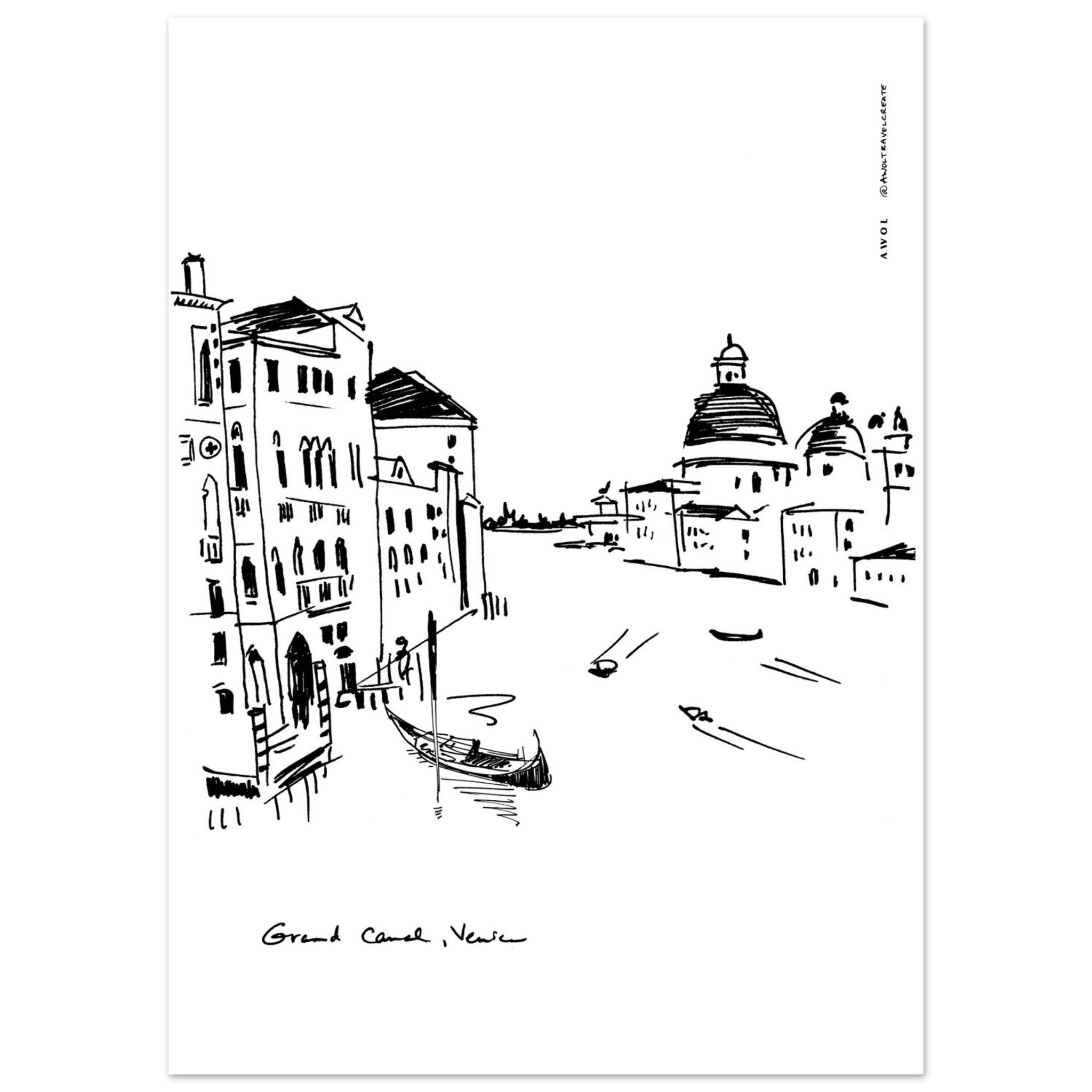 This black and white Venice city art print captures the romantic beauty and unique vibe of this beautiful Italian city: gondolas, palazzos and basilicas on the Grand Canal are hand drawn in a minimalist, monochrome wall art print on aluminum. This urban art print is an Italy scenery artwork depicting a gondola swaying peacefully in front of classic Venitian palazzos, while in the background boats drive by, leaving dynamic motion waves in their wake. On the right side of the grand canal, on the Dorsoduro sestieri (one of six island districts making up this city on water), we see the grandiose rounded roofs of the Basilica di Santa Maria della Salute. The clean lines, sketchy style, dynamism and contemporary art aesthetic of this Venice city print is not only a travel art print, but also a romantic Italy travel souvenir, a unique Italian wall art decor and a cool and thoughtful gift idea for Italy lovers and travellers. This Venice travel art is an artful, modern Italy trip print that you can hang on your wall decor, keeping a beautiful Italy travel wall art work close by to remember your Venice vacation and your travels to Italy, making you smile every day and savouring a sense of la dolce vita.