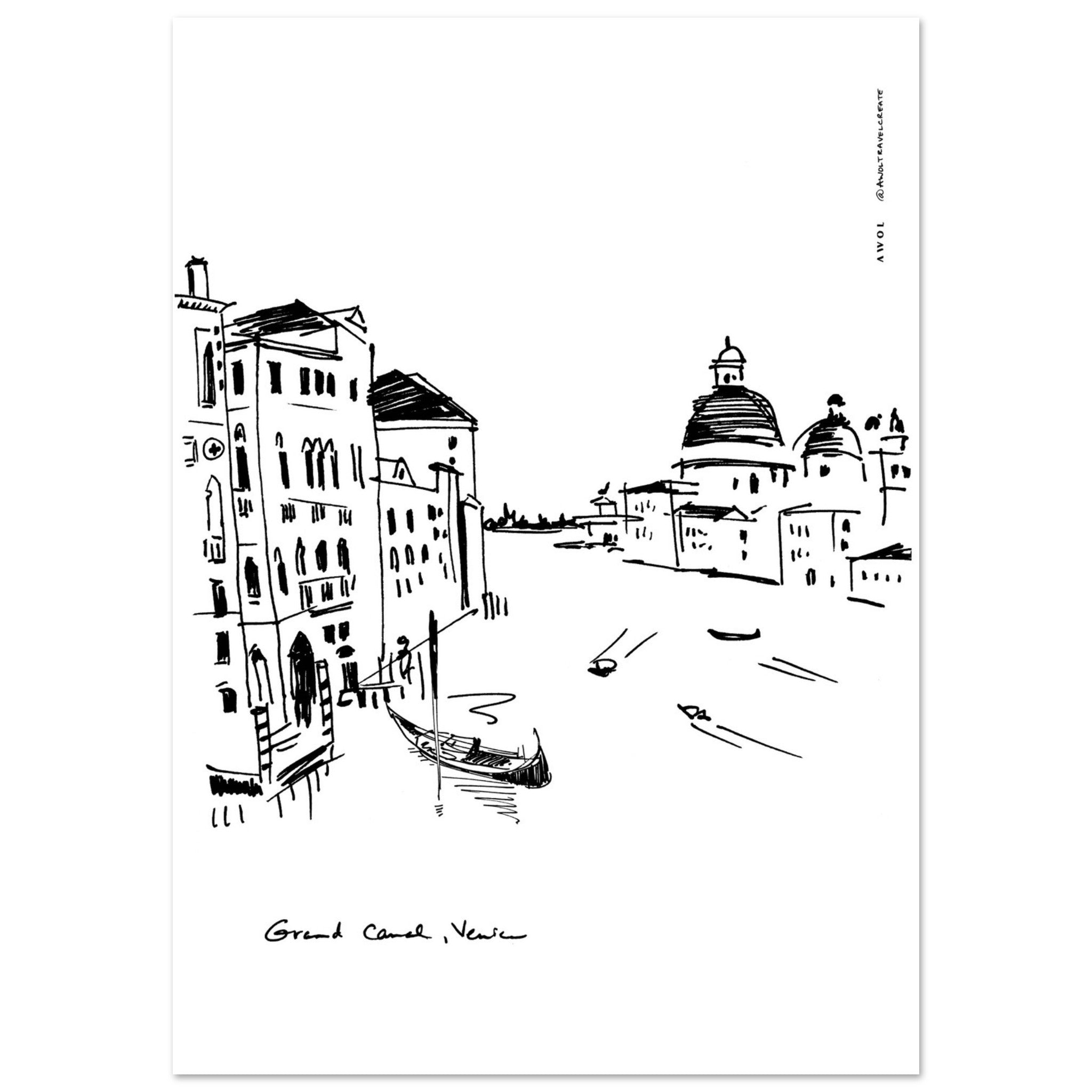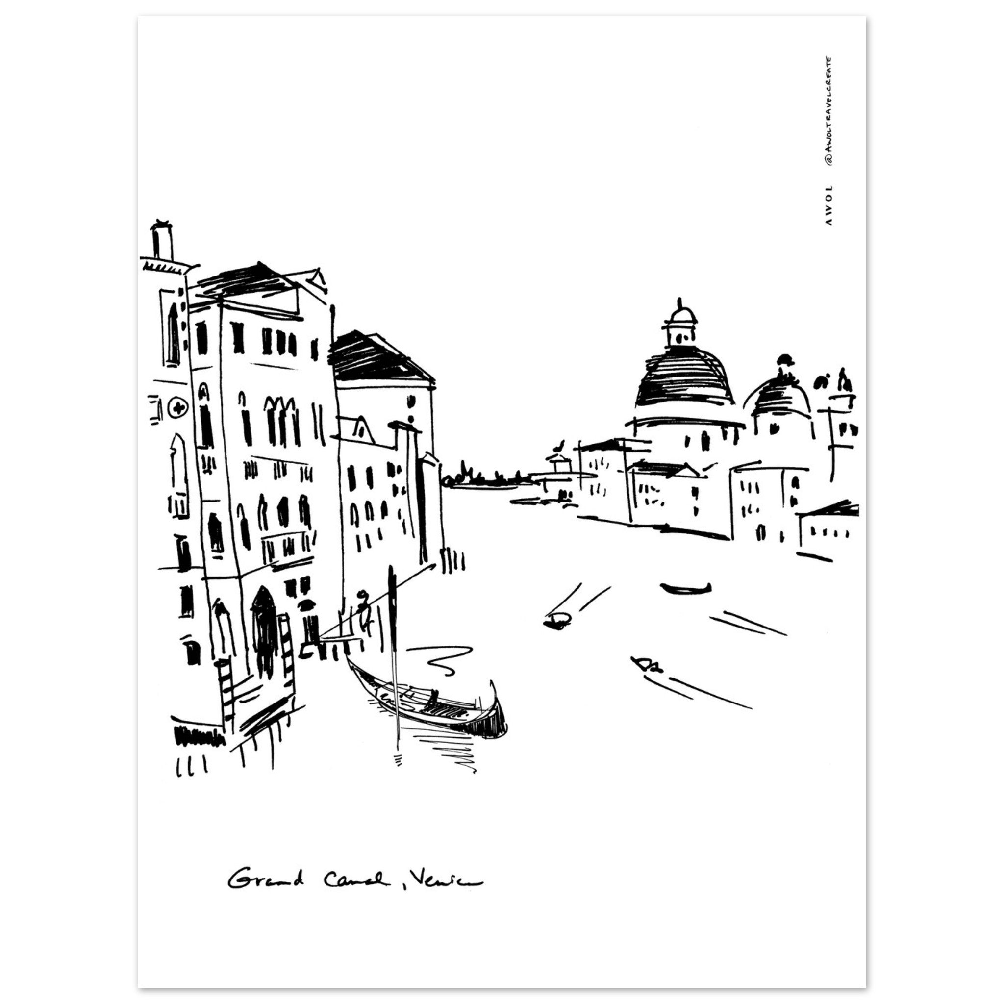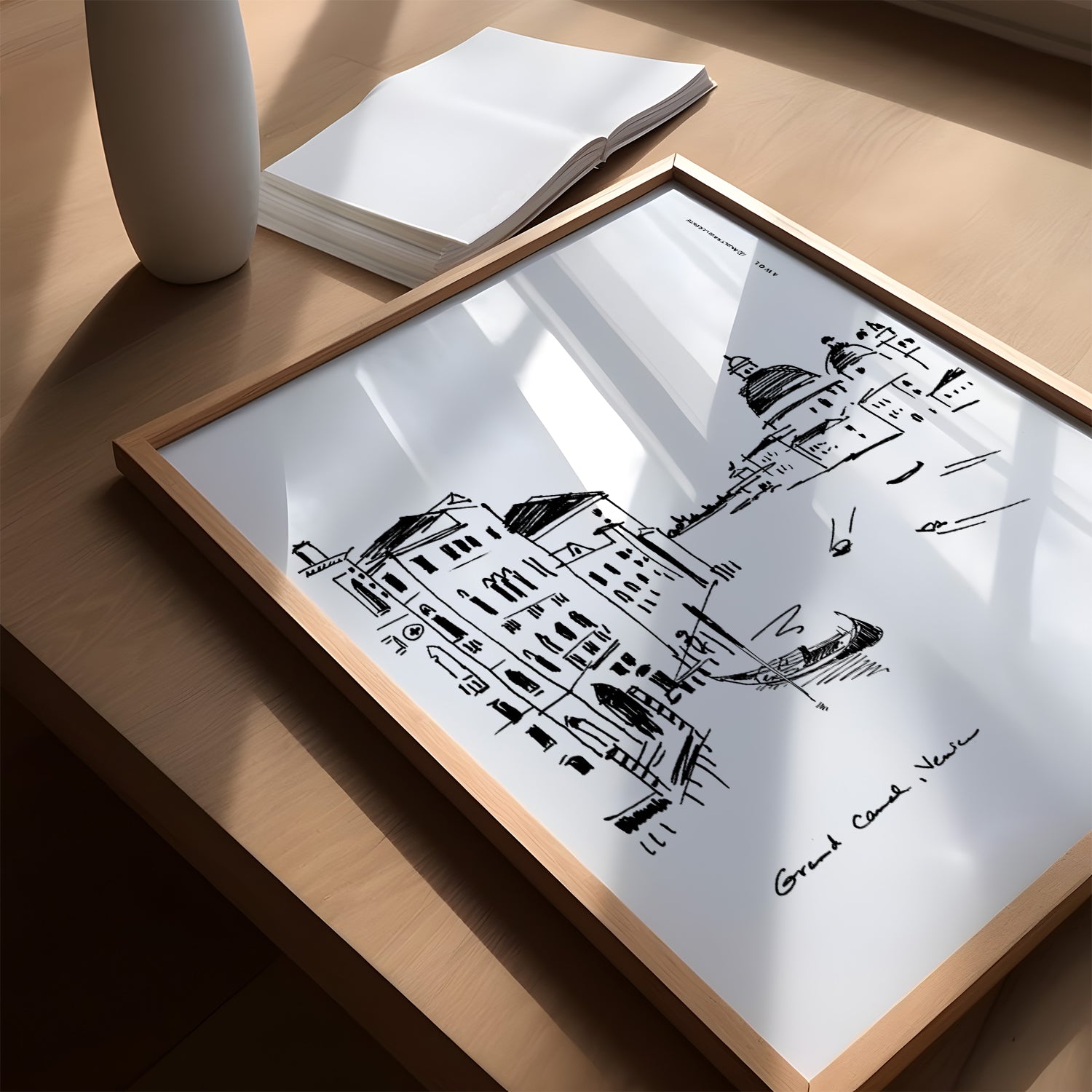 This black and white Venice city drawing art print captures the romantic beauty and unique vibe of this beautiful Italian city: gondolas, palazzos and basilicas on the Grand Canal are hand drawn in a minimalist, monochrome wall art print. This Italy scenery artwork depicts a gondola swaying peacefully in front of classic Venitian palazzos, while in the background boats drive by, leaving dynamic motion waves in their wake. On the right side of the grand canal, on the Dorsoduro sestieri (one of six island districts making up this city on water), we see the grandiose rounded roofs of the Basilica di Santa Maria della Salute. The clean lines, sketchy style, dynamism and contemporary art aesthetic of this Venice city poster is not only a travel art print, but also a romantic Italy travel souvenir, a unique Italian wall art decor and a cool and thoughtful gift idea for Italy lovers and travellers. This Venice travel poster is an artful Italy trip poster print that you can hang on your wall decor, keeping a beautiful Italy travel print close by to remember your Venice vacation and your travels to Italy, making you smile every day and savouring a sense of la dolce vita.