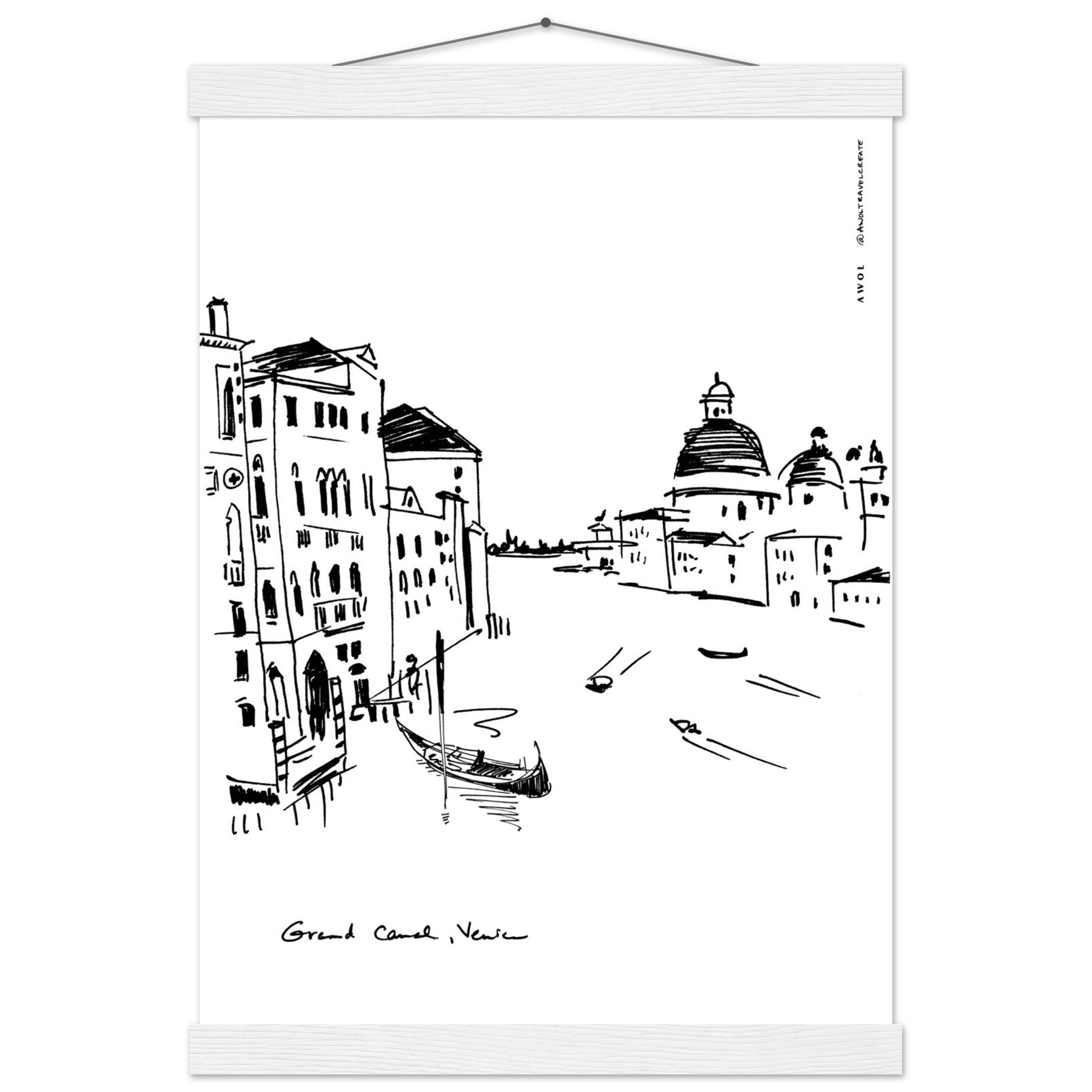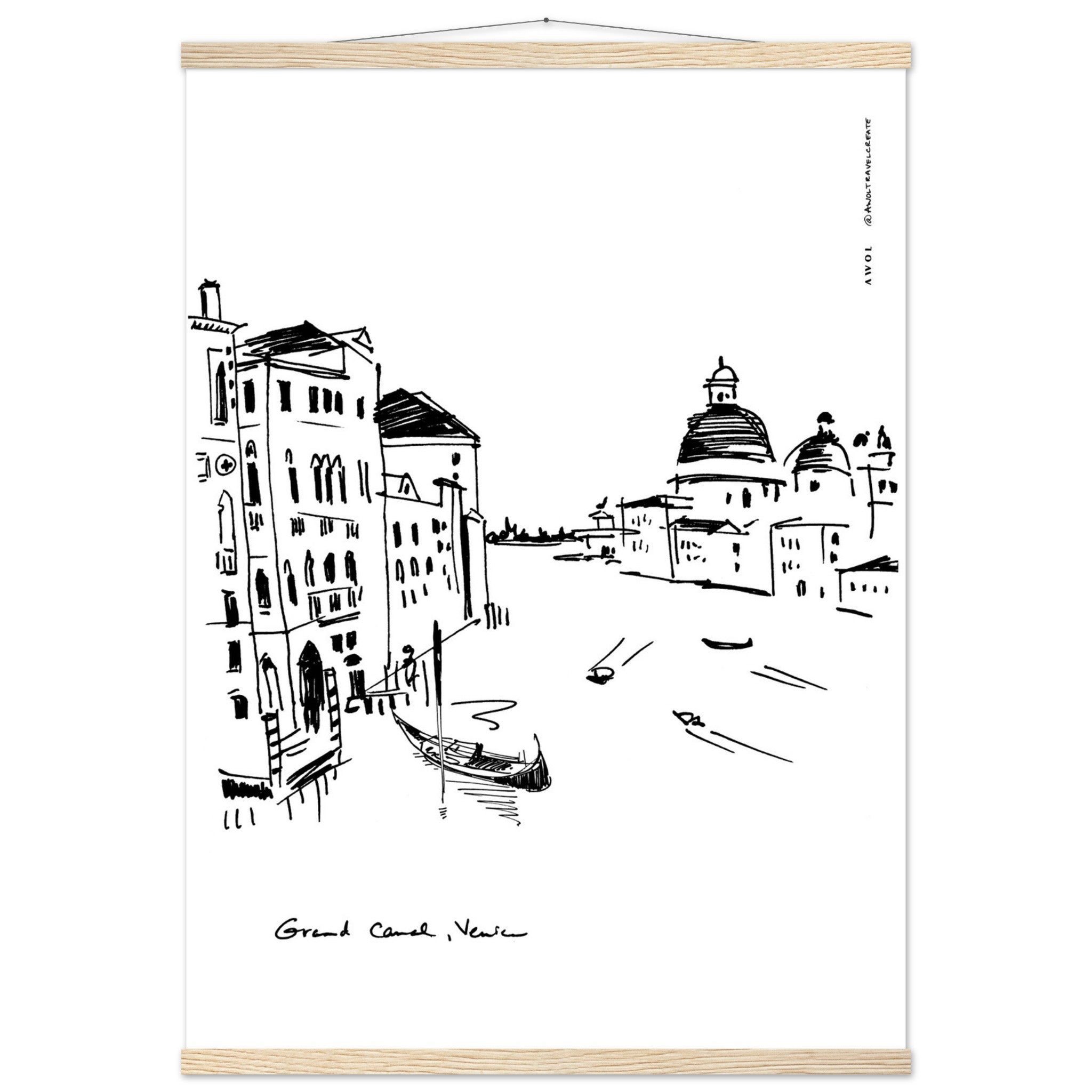 This black and white Venice, Italy poster print captures the romantic beauty and unique vibe of this beautiful Italian city: gondolas, palazzos and basilicas on the Grand Canal are hand drawn in a minimalist, monochrome framed wall art. This Italy wall poster is a ready to hang art of Venice print depicting a gondola swaying peacefully in front of classic Venitian palazzos, while in the background boats drive by the lagoon, leaving dynamic motion waves in their wake. On the right side of the grand canal, on the Dorsoduro sestieri (one of six Venice island districts making up this city on water), we see the grandiose rounded roofs of the Basilica di Santa Maria della Salute. The clean lines, sketchy style, dynamism and contemporary art aesthetic of this Venice city wall art print is not only an Italy travel art print, but also a romantic travel souvenir, a unique Italian wall decor print and a cool and thoughtful gift idea for Italy lovers and travellers. This Venice travel poster is ready to hang with a wooden frame – a modern Italy trip memento for your wall decor, keeping a beautiful Italy travel wall art work close by to remember your Venice vacation and your travels to Italy, making you smile every day and savouring a sense of la dolce vita.