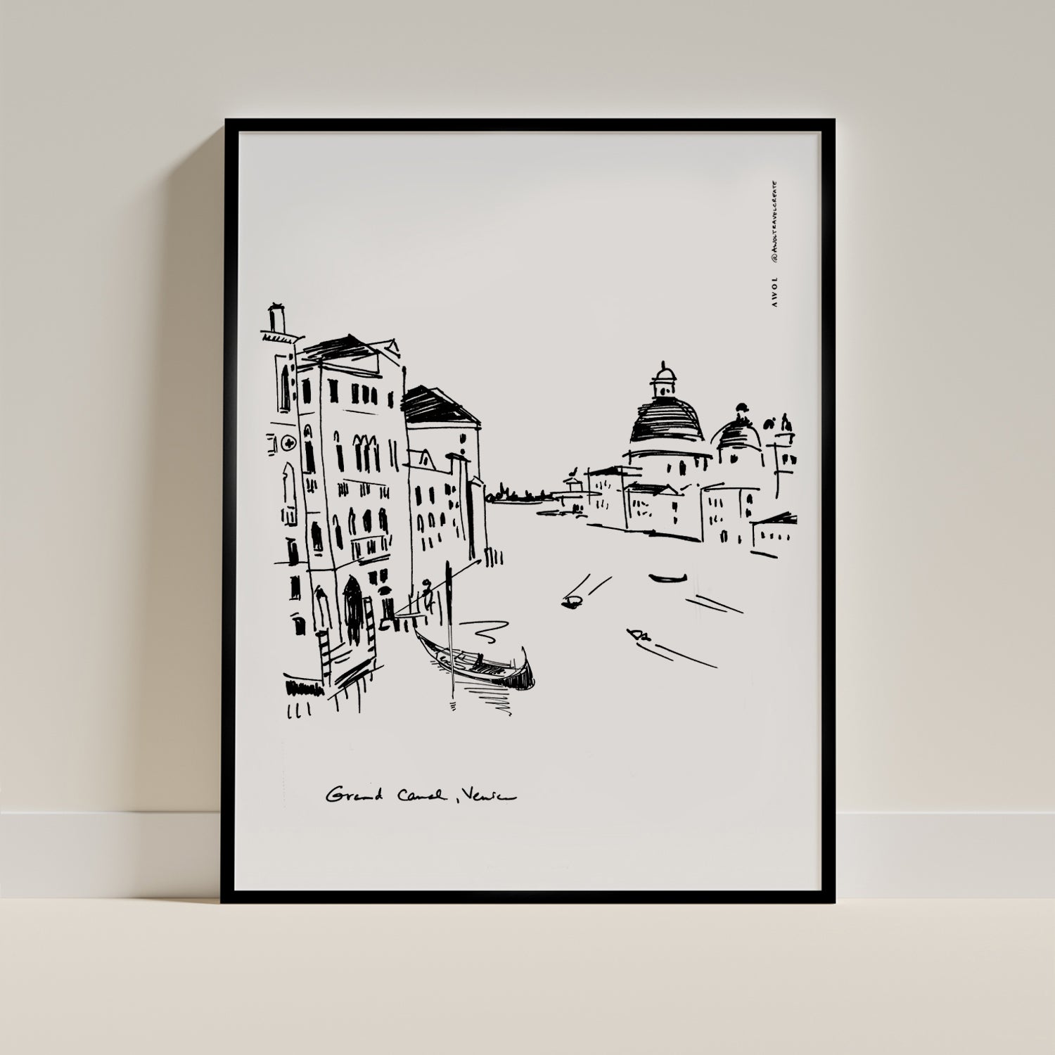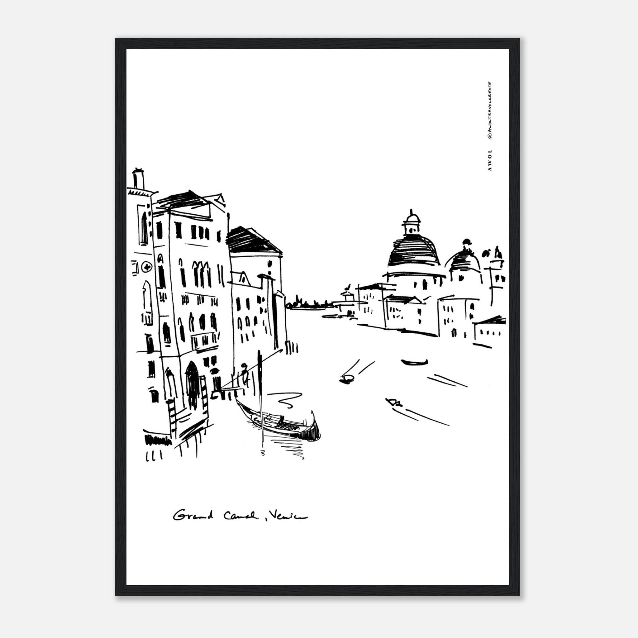 This black and white framed print of Venice captures the romantic beauty and unique vibe of this beautiful Italian city: gondolas, palazzos and basilicas on the Grand Canal are hand drawn in a minimalist, monochrome framed wall art. This Italy scenery framed art print depicts a gondola swaying peacefully in front of classic Venitian palazzos, while in the background boats drive by, leaving dynamic motion waves in their wake. On the right side of the grand canal, on the Dorsoduro sestieri (one of six island districts making up this city on water), we see the grandiose rounded roofs of the Basilica di Santa Maria della Salute. The clean lines, sketchy style, dynamism and contemporary art aesthetic of this Venice city wall art is not only an Italy travel art print, but also a romantic travel souvenir, a unique Italian wall decor and a cool and thoughtful gift idea for Italy lovers and travellers. This Venice travel artwork is ready to hang with a wooden frame – a modern Italy trip memento for your wall decor, keeping a beautiful Italy travel wall art work close by to remember your Venice vacation and your travels to Italy, making you smile every day and savouring a sense of la dolce vita.
