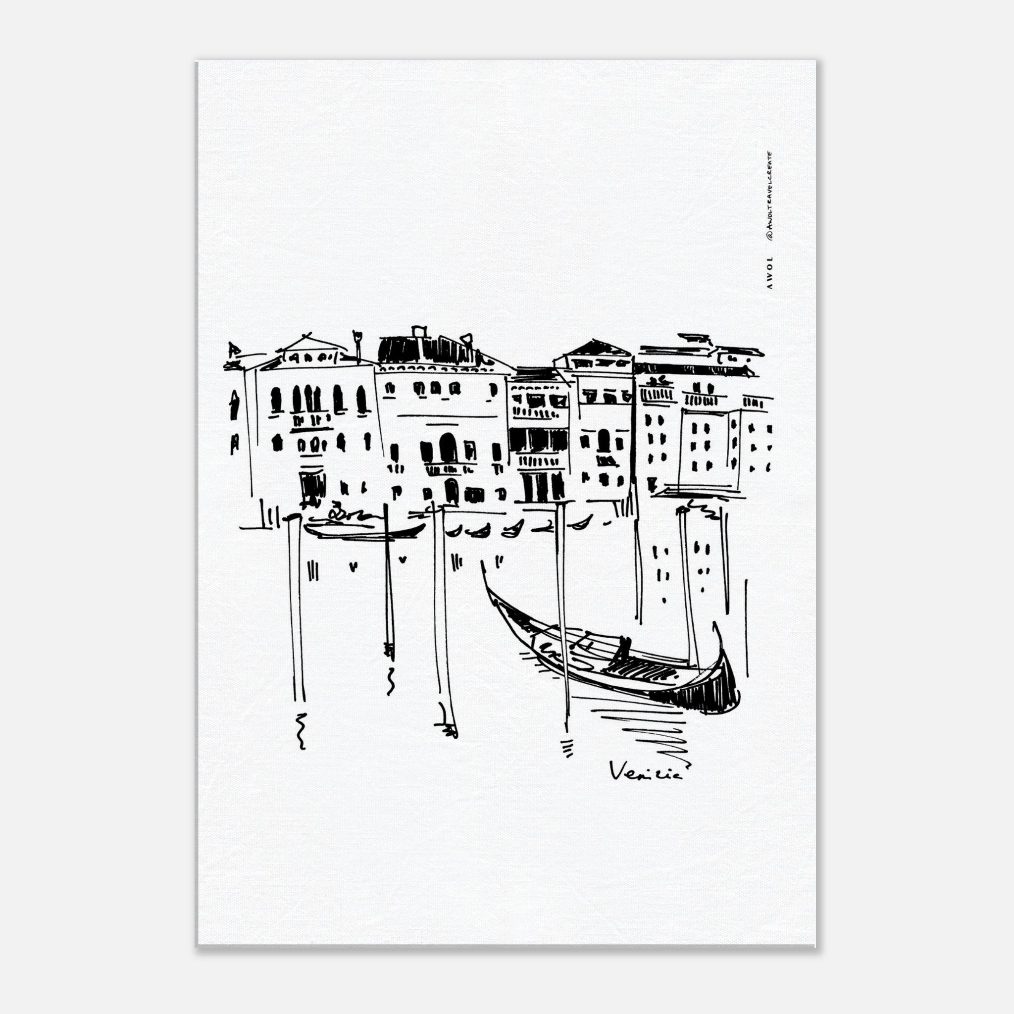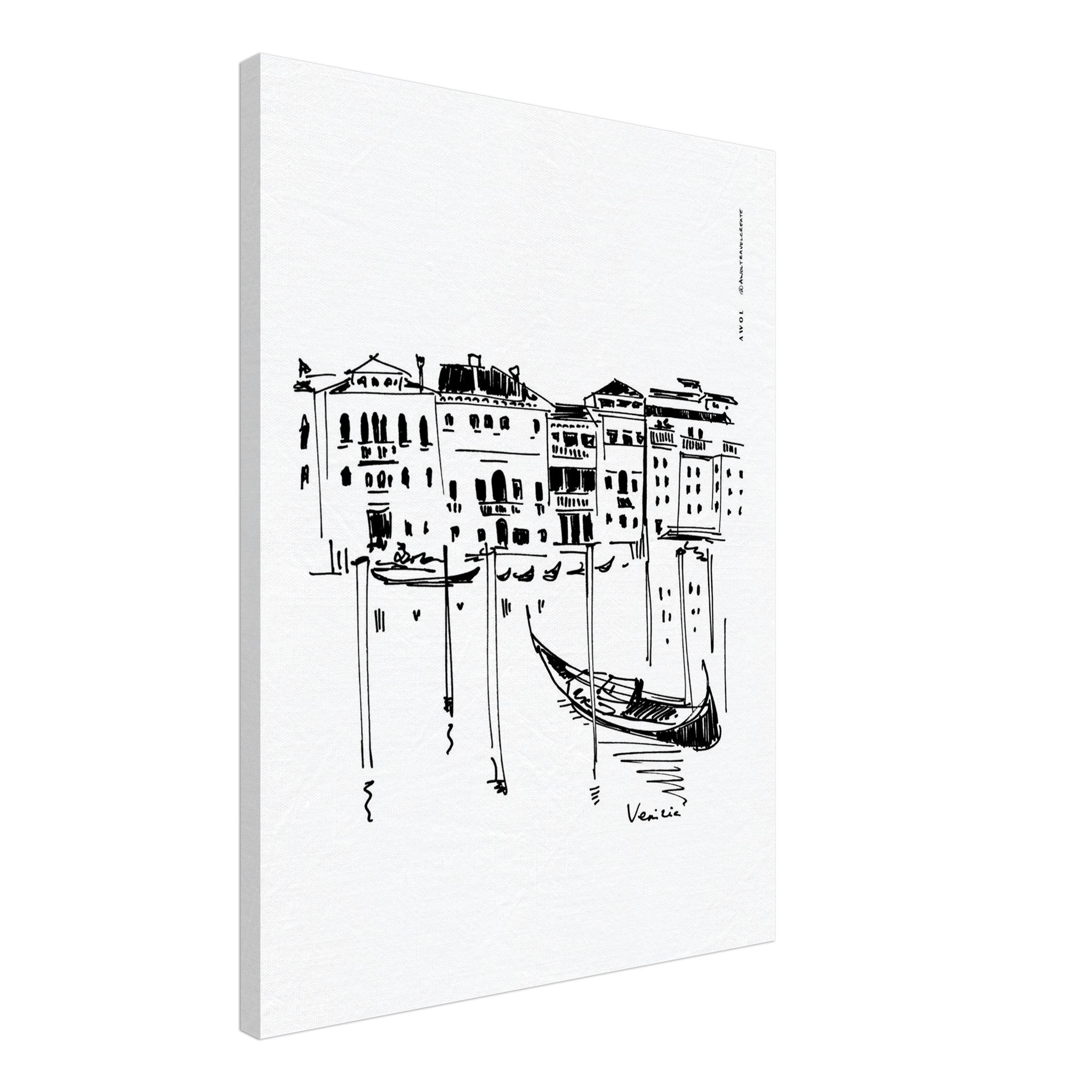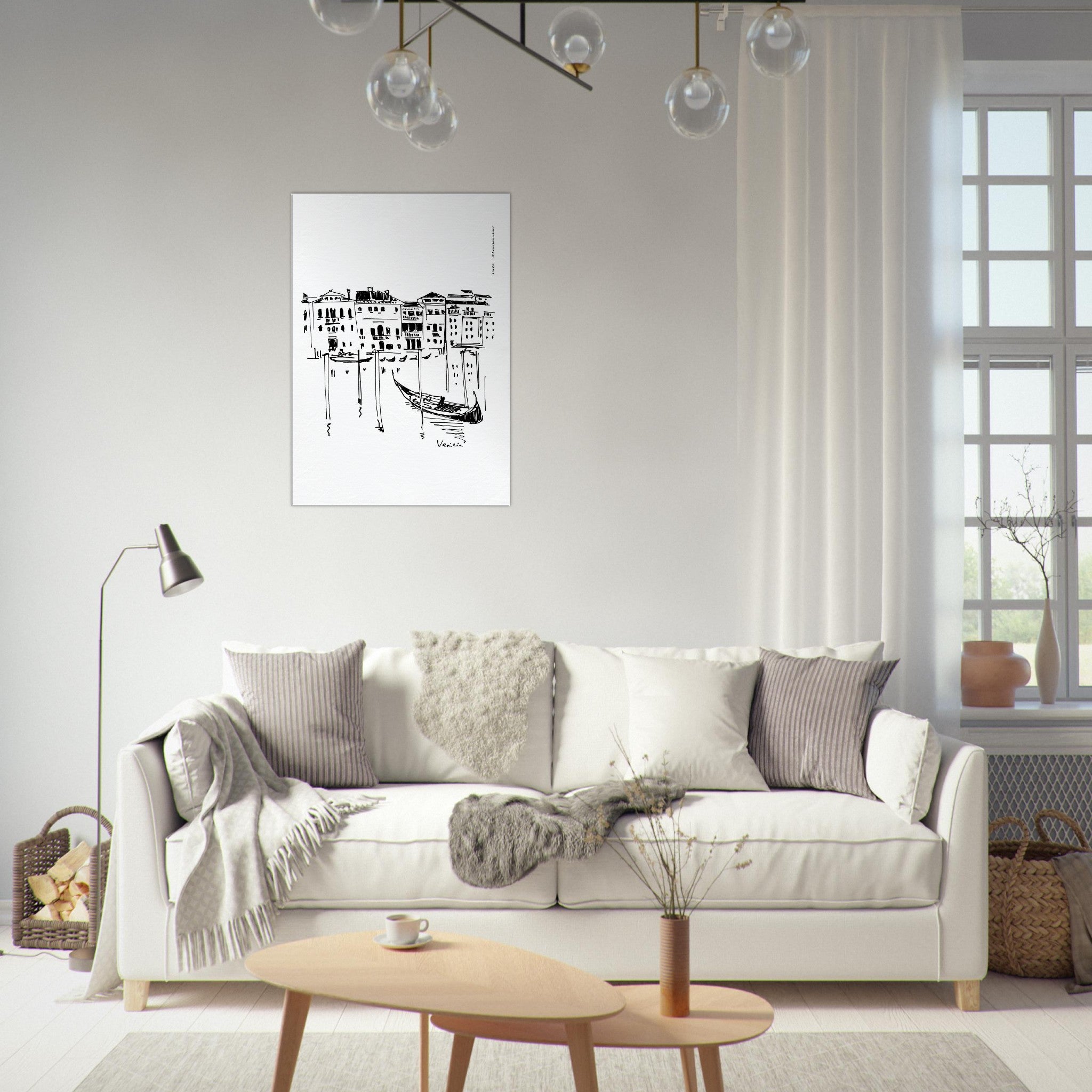 This black and white Venice city canvas art print captures the romantic mood, beauty and unique mystery of this iconic Italian city on water in a contemporary aluminum travel print. A gondola sways on calm waters with reflections while across the Grand Canal, Venetian palaces and villas mix in a blend of architecture styles: Byzantine, Renaissance, Baroque and Neoclassical and Venetian Gothic palazzos. This Italy wall art print on aluminum is a hand drawing in a high contrast, graphic drawing style that depicts Venice in a modern art style, making this a contemporary and unique Italy scenery artwork for your wall decor. The graphic, dynamic monochrome aluminum art print is a Venice city drawing with strong contrasts and lines, making this modern Venice artwork a cool Italy travel art print, a romantic Italy trip souvenir, an artful Italian keepsake and a cool and thoughtful gift idea for Italy lovers. This Venice travel wall art is like a postcard that you can hang on your wall decor, keeping a beautiful and elegant Venice memory close by to remember your Venice trip and your Italian vacations, making you smile every day and savouring a sense of la dolce vita.