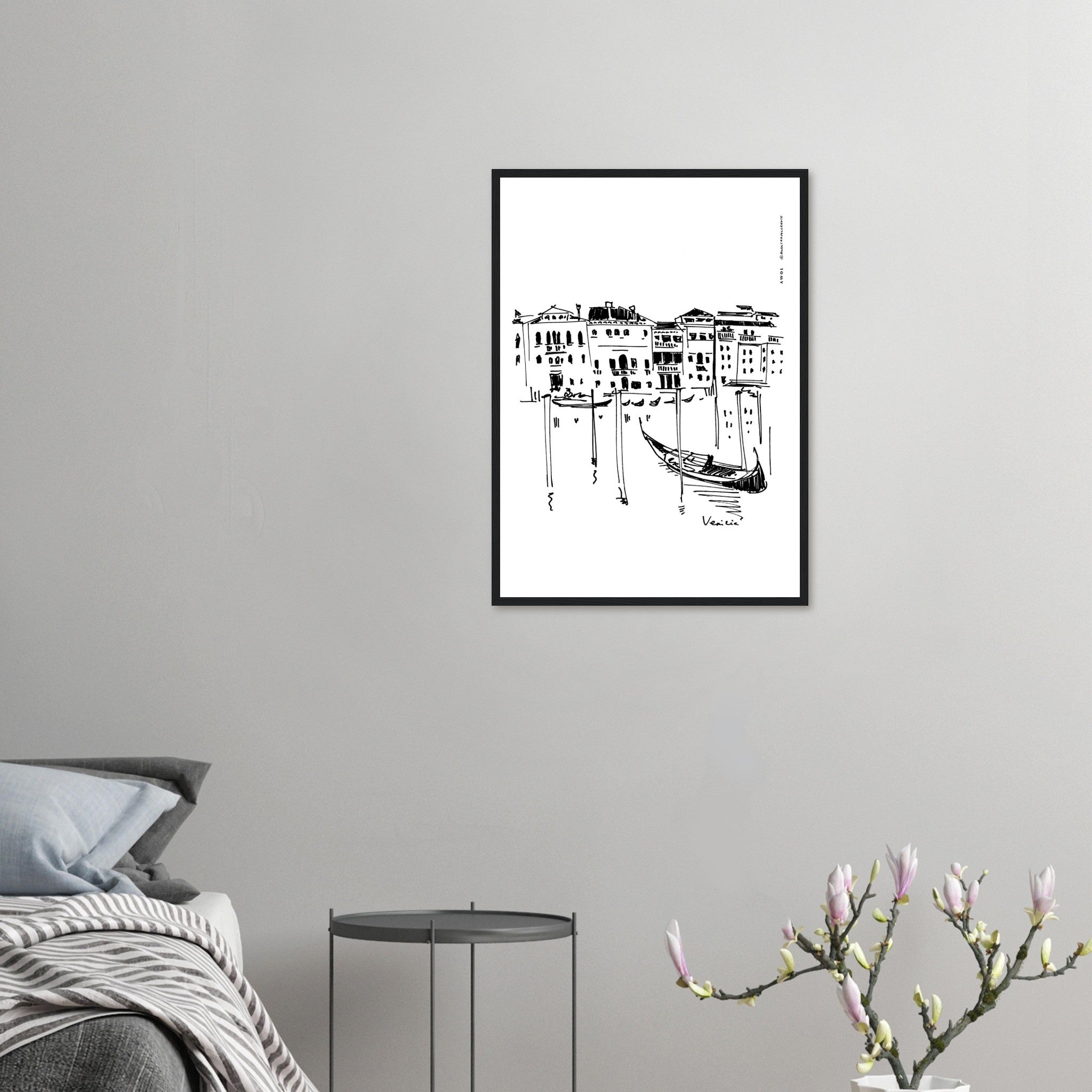 This black and white framed print of Venice captures the romantic mood, beauty and unique mystery of this iconic Italian city on water in a modern Italy art print. A gondola sways on calm waters with reflections while across the Grand Canal, Venetian palaces and villas mix in a blend of architecture styles: Byzantine, Renaissance, Baroque and Neoclassical and Venetian Gothic palazzos. This Italy wall art print with a wooden frame is hand drawn in a high contrast, graphic drawing style that depicts Venice in a modern art style, making this a contemporary and unique Italy scenery artwork for your wall decor. The graphic, dynamic monochrome colours and strong contrasts of this Venice city poster make this a modern Italy travel art print, a romantic Italy trip souvenir, an artful Italian keepsake and a cool and thoughtful gift idea for Italy lovers. This Venice travel wall art is a framed art print that is ready to hang on your wall decor, keeping a beautiful and elegant Venice artwork close by to remember your Venice trip and your Italian vacations, making you smile every day and savouring a sense of la dolce vita.