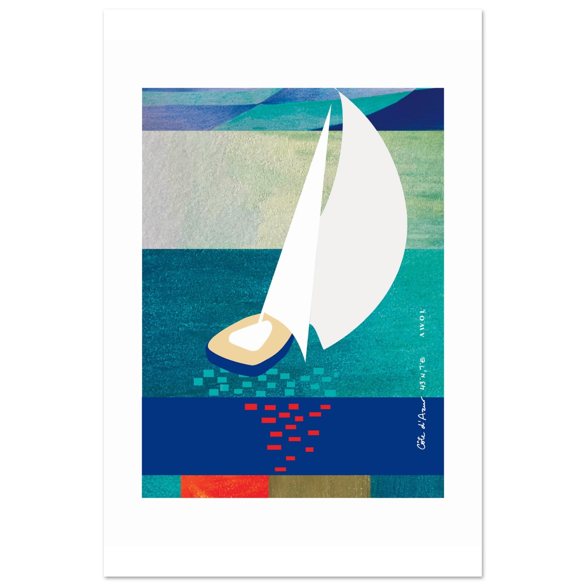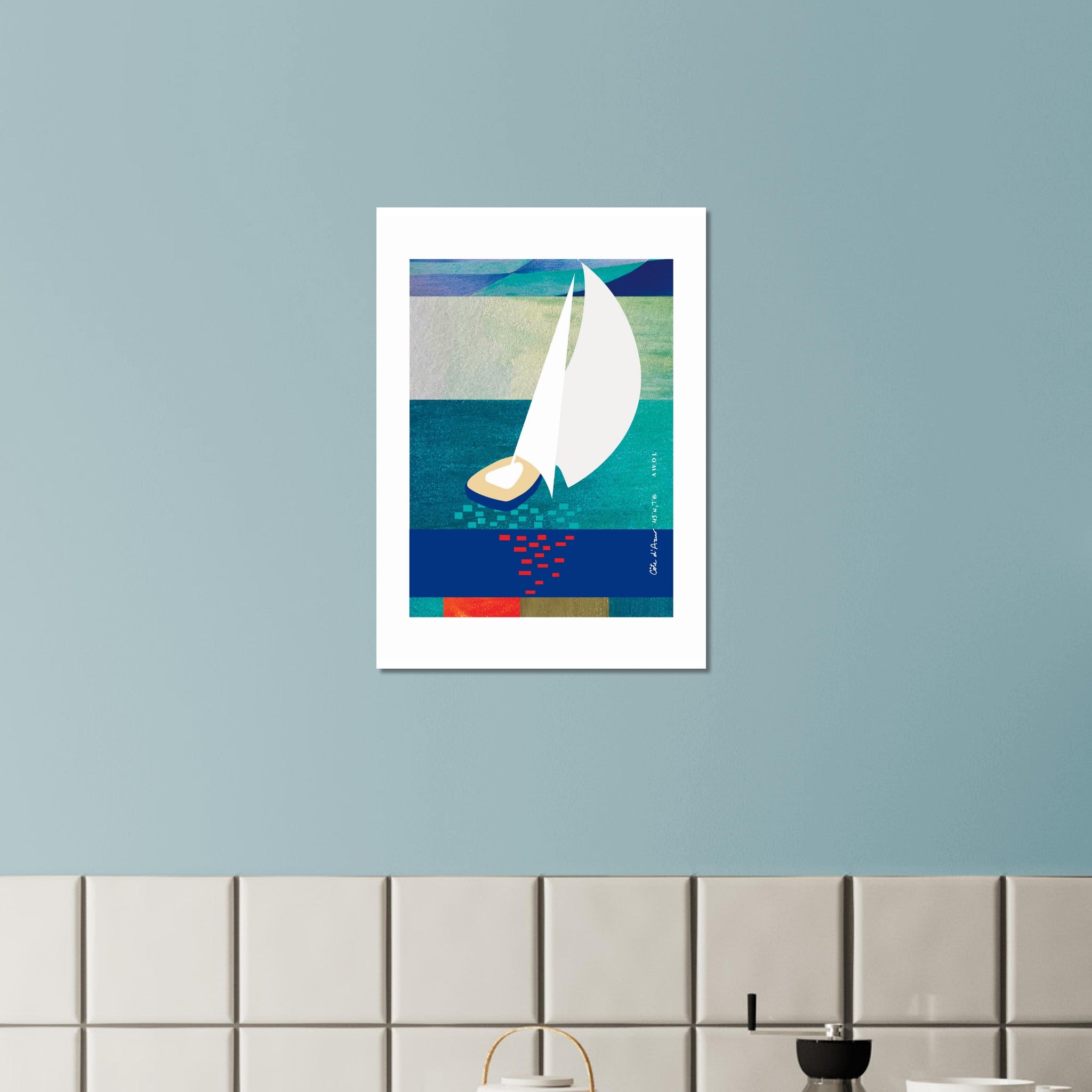 This coastal wall decor art print on aluminum is a blue abstract wall art with soothing shades of blue, an abstract sea, graphic red and orange sun reflections dancing on the water below a sailboat with white sails blowing in the wind. At the bottom of this contemporary sea abstraction is a graphic bar of bright accent colours: vivid orange, azure blue, neutral tones and a rich blue-green that is mirrored in the sea above. This French Riviera artwork is a modern, graphic and minimalist wall art with bold modern shapes and a contemporary nautical art style. This beach wall art evokes the summer breezes and turquoise blue waters of the Côte d’Azur, filled with pristine clear blue waters, quaint fishing bays, picturesque sailboats, bright blue skies and happy coastal living vibes in a colourful, contemporary travel poster inspired by one of the most beautiful destinations in the world: The South Of France. An escapist, vacation vibes aluminum art print that will bring relaxing vibes and happy memories of your Mediterranean travels to your wall decor.
